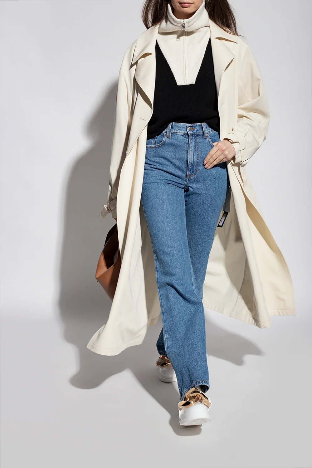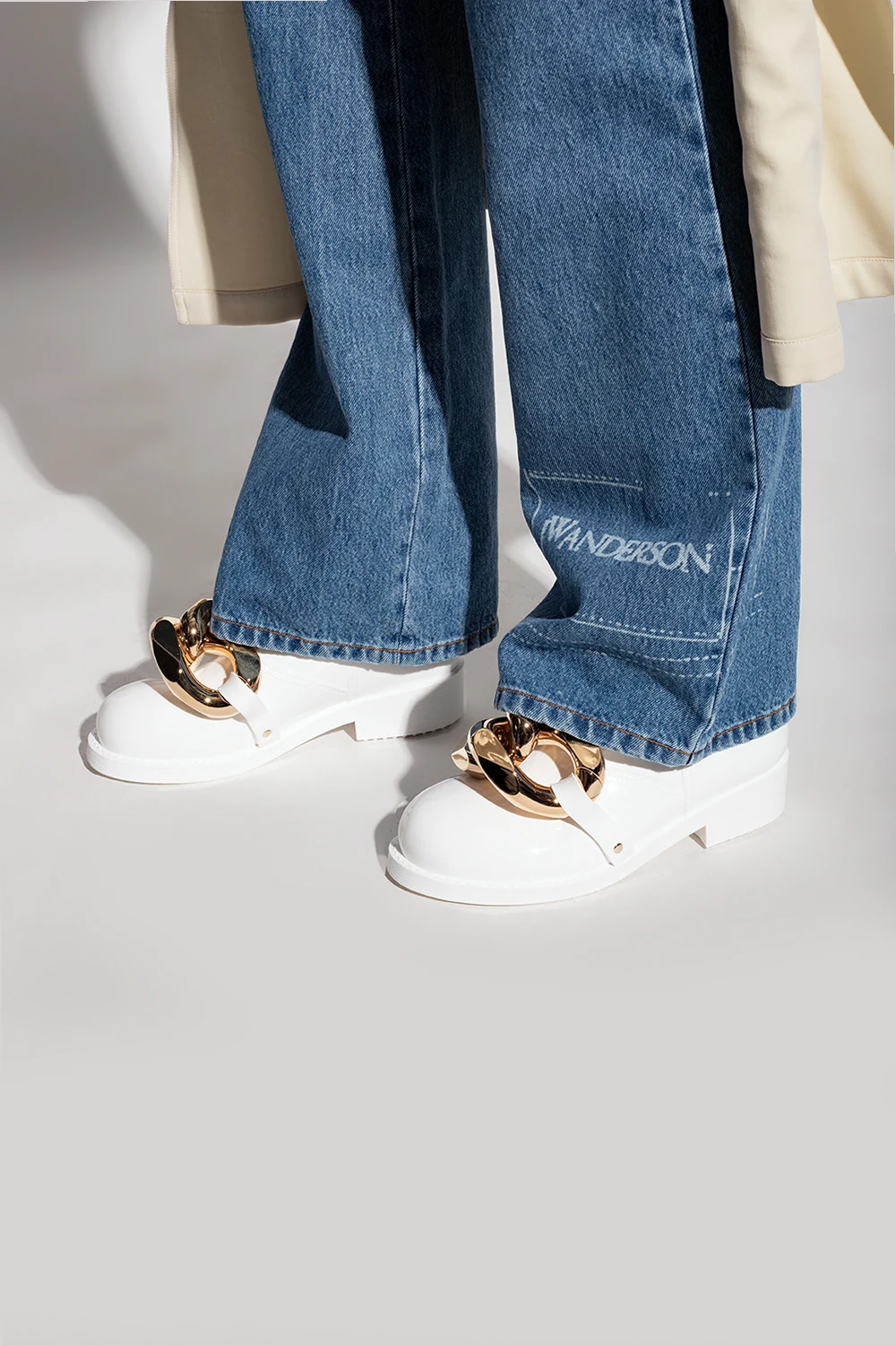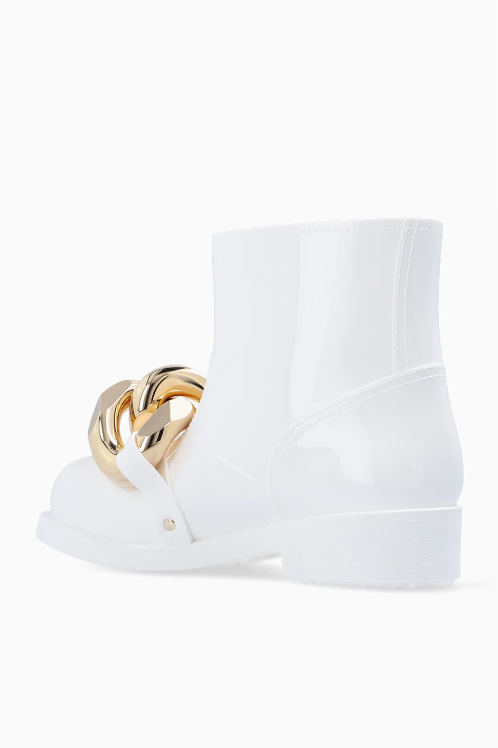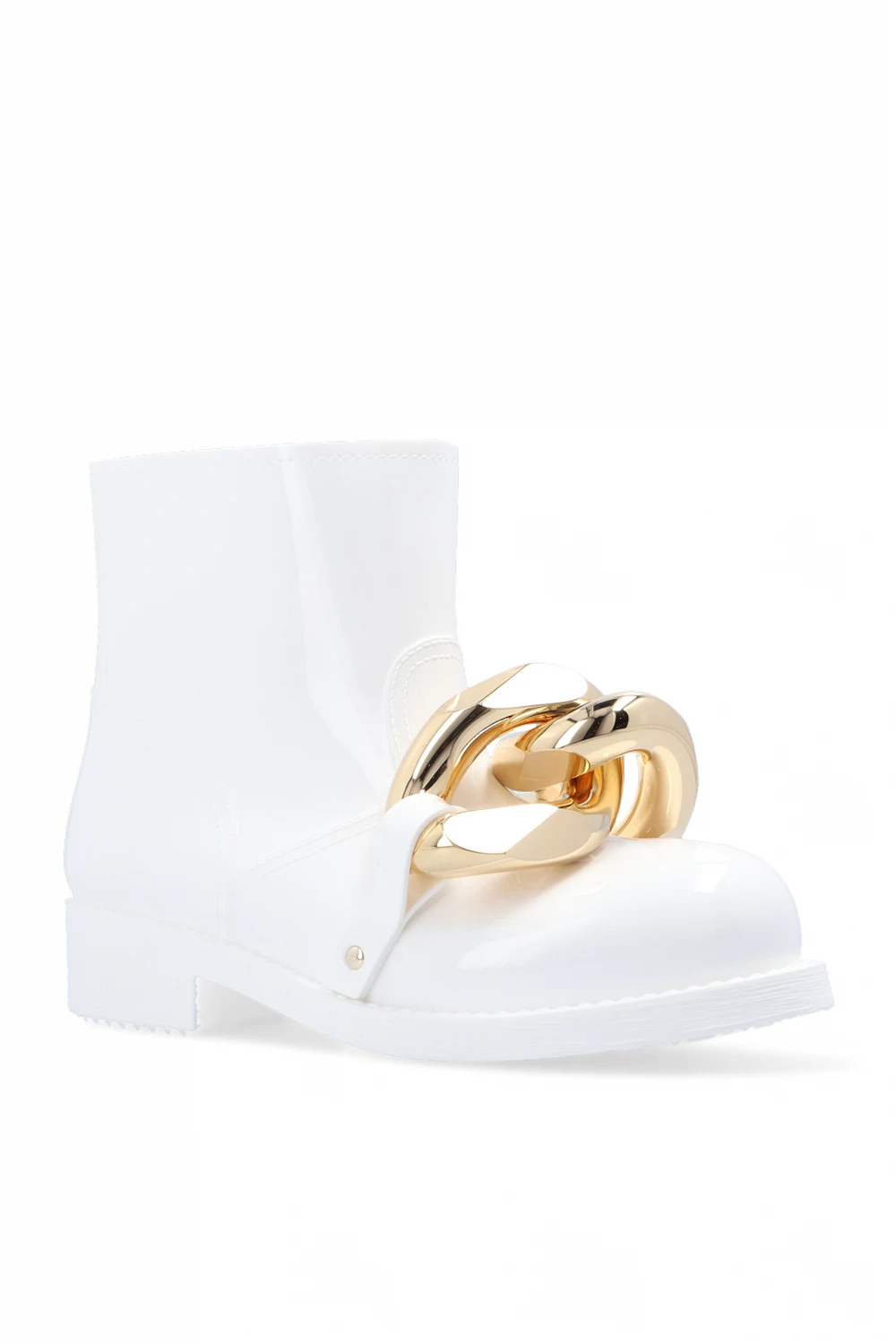 Białe, krótkie kalosze JW Anderson. Z przodu metalowa aplikacja w kształcie ogniw łańcucha w kolorze złotym. Gumowa podeszwa w kolorze białym.