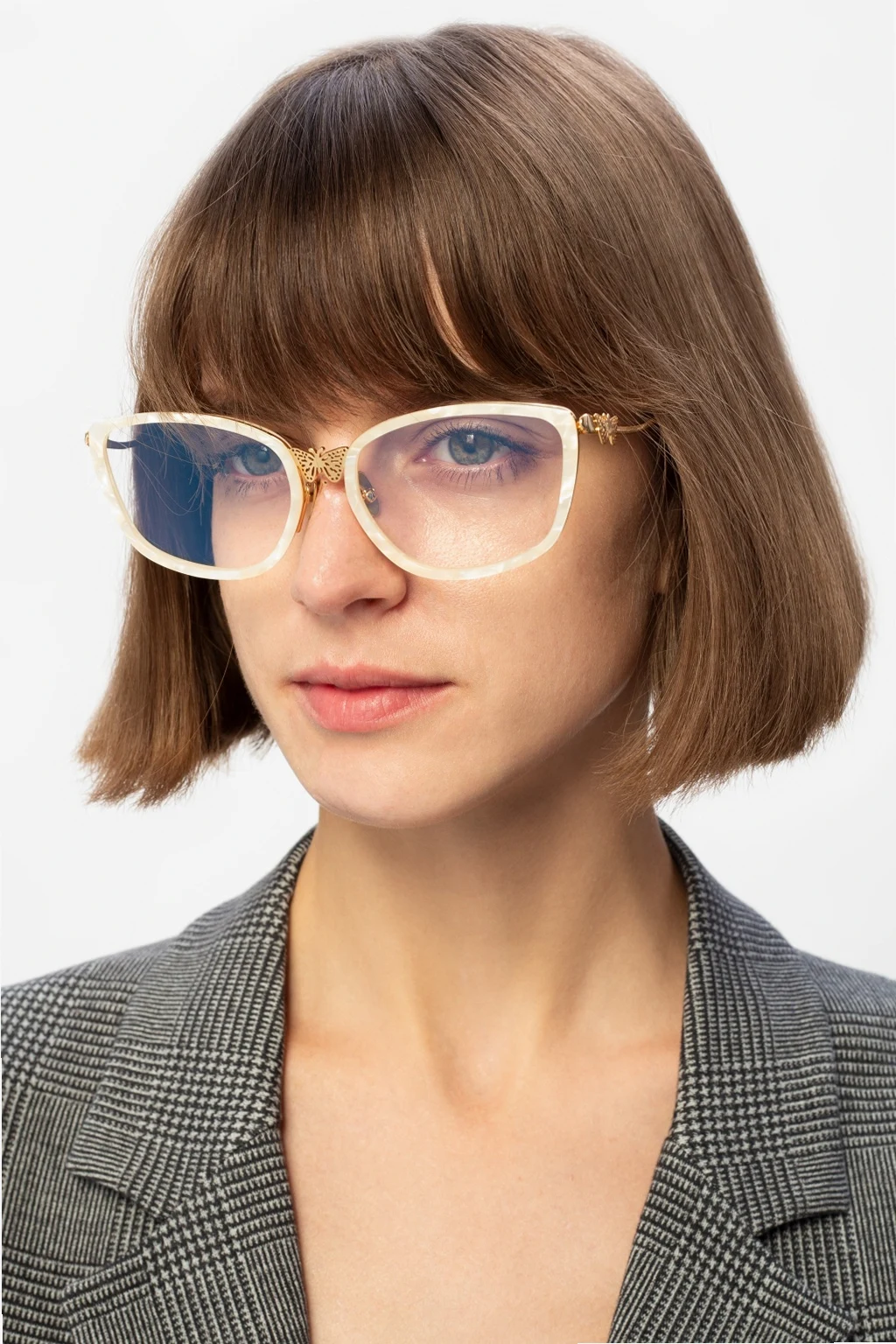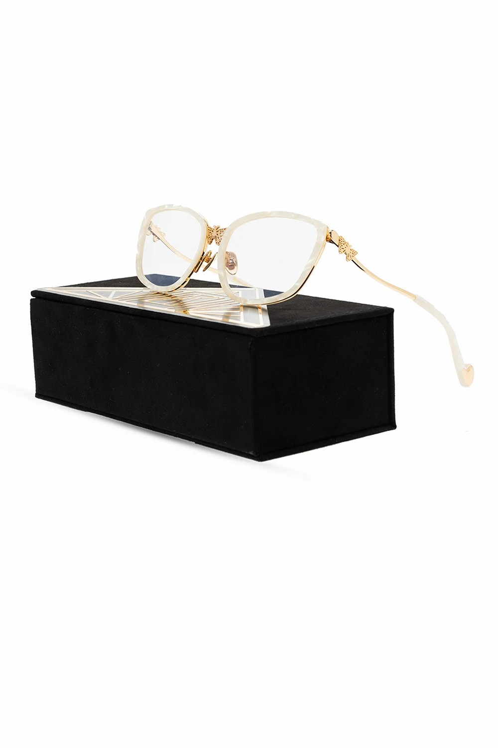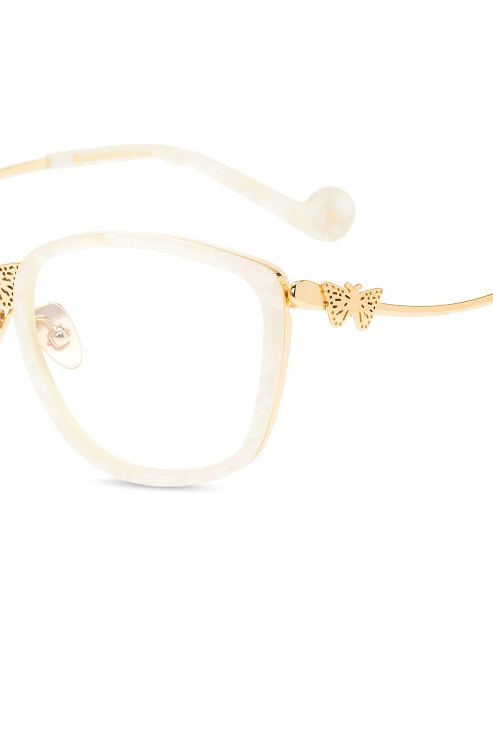 Kremowe okulary korekcyjne, model ‘Mon Papillon’ Anna Karin Karlsson. Pokryte 24-karatowym złotem. Ozdobione dekoracyjnymi elementami w kolorze złotym. Dołączone etui.