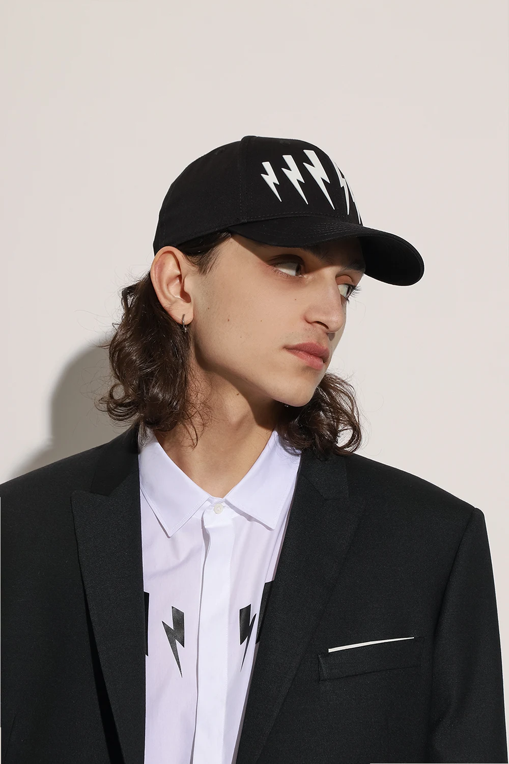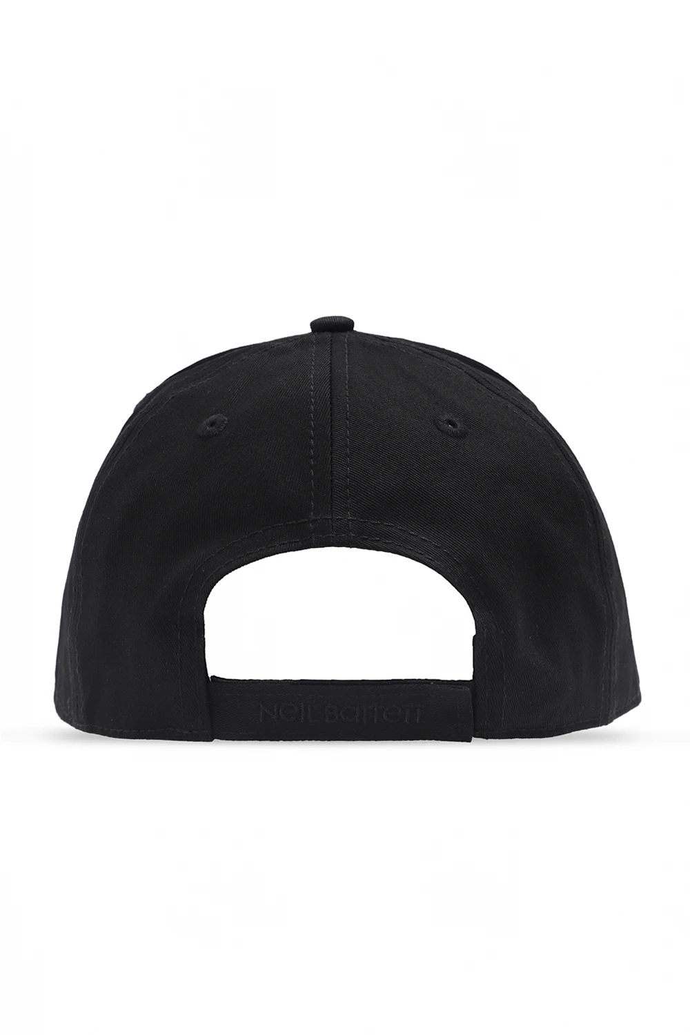 Czarna, bawełniana czapka z daszkiem Neil Barrett. Z przodu biały nadruk. Z tyłu zapięcie na rzep z wyszytym logo.
