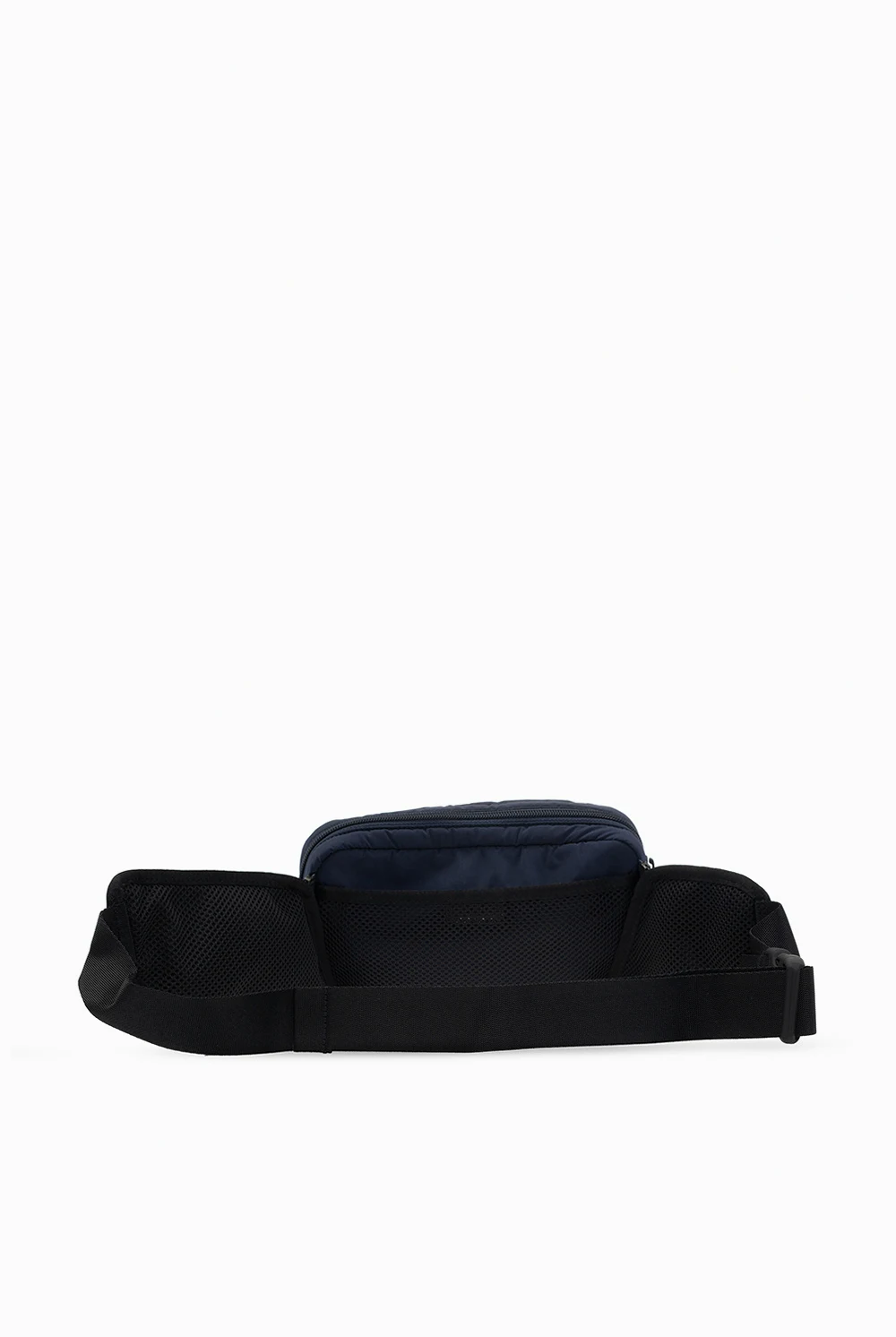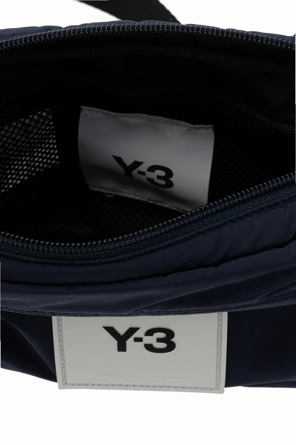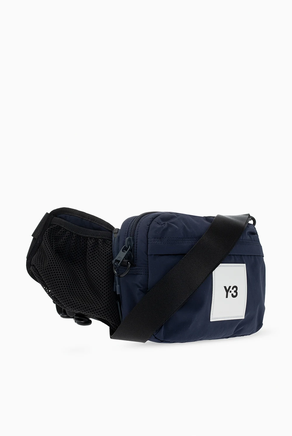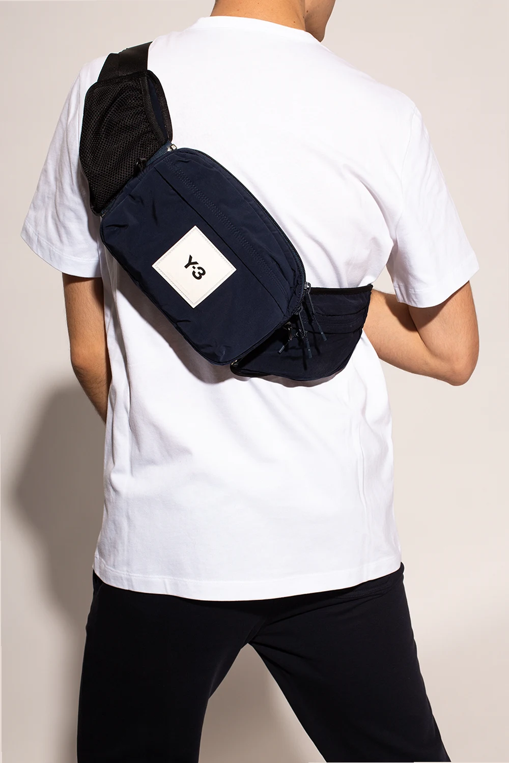 Granatowa torba na pas Y-3 Yohji Yamamoto. Zamykana na zamek. Ozdobiona białą naszywką z logo w kolorze czarnym. Z przodu i po bokach trzy kieszenie zamykane na zamki. Regulowany pasek biodrowy. Z możliwością noszenia jako torba na ramię. Dołączony odpinany pasek na ramię.
