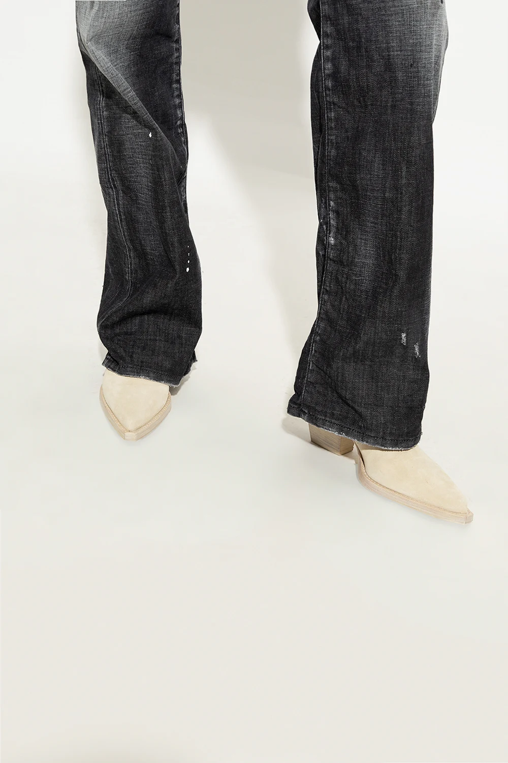 – Brązowe zamszowe botki z obcasem kubańskim i kowbojskim przeszyciem