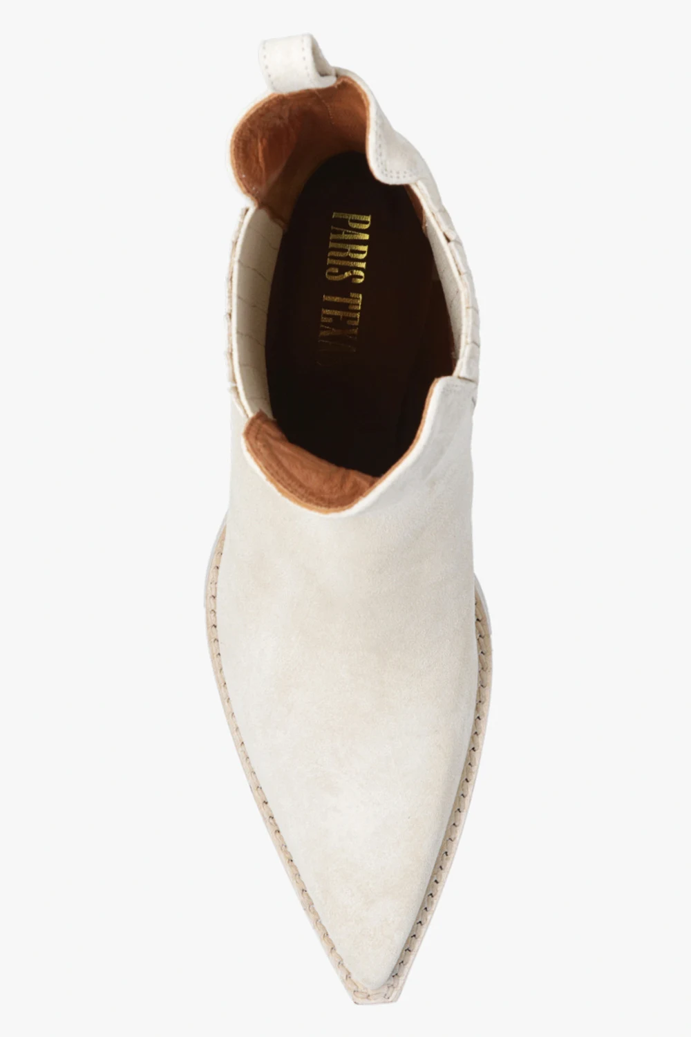 Kremowe botki na obcasie, model ‘Dallas’ Paris Texas. Wykonane z zamszu cielęcego. Po bokach wszyta taśma elastyczna. Nosek w szpic. Kremowa, skórzana podeszwa.