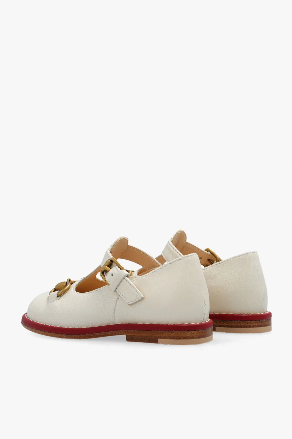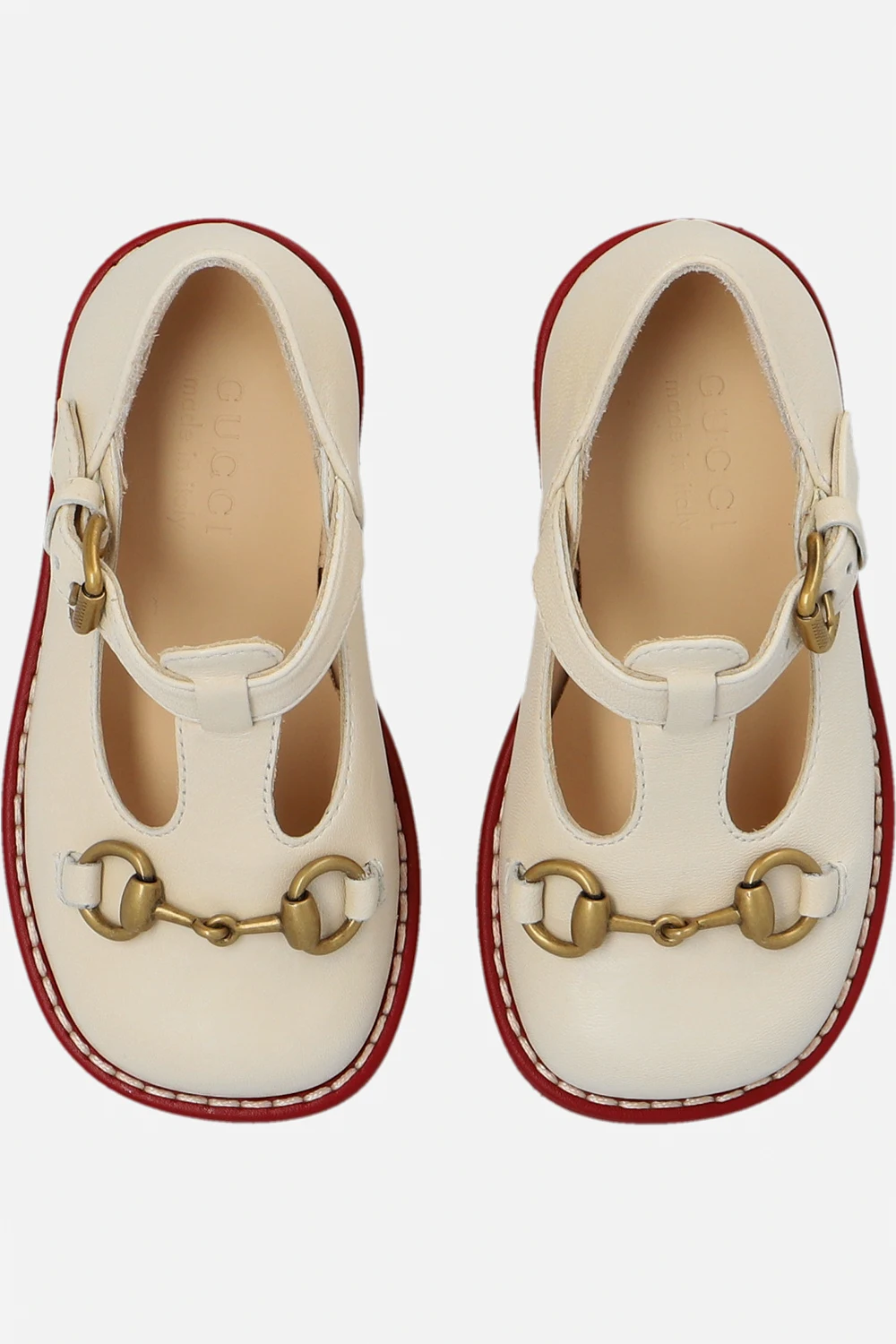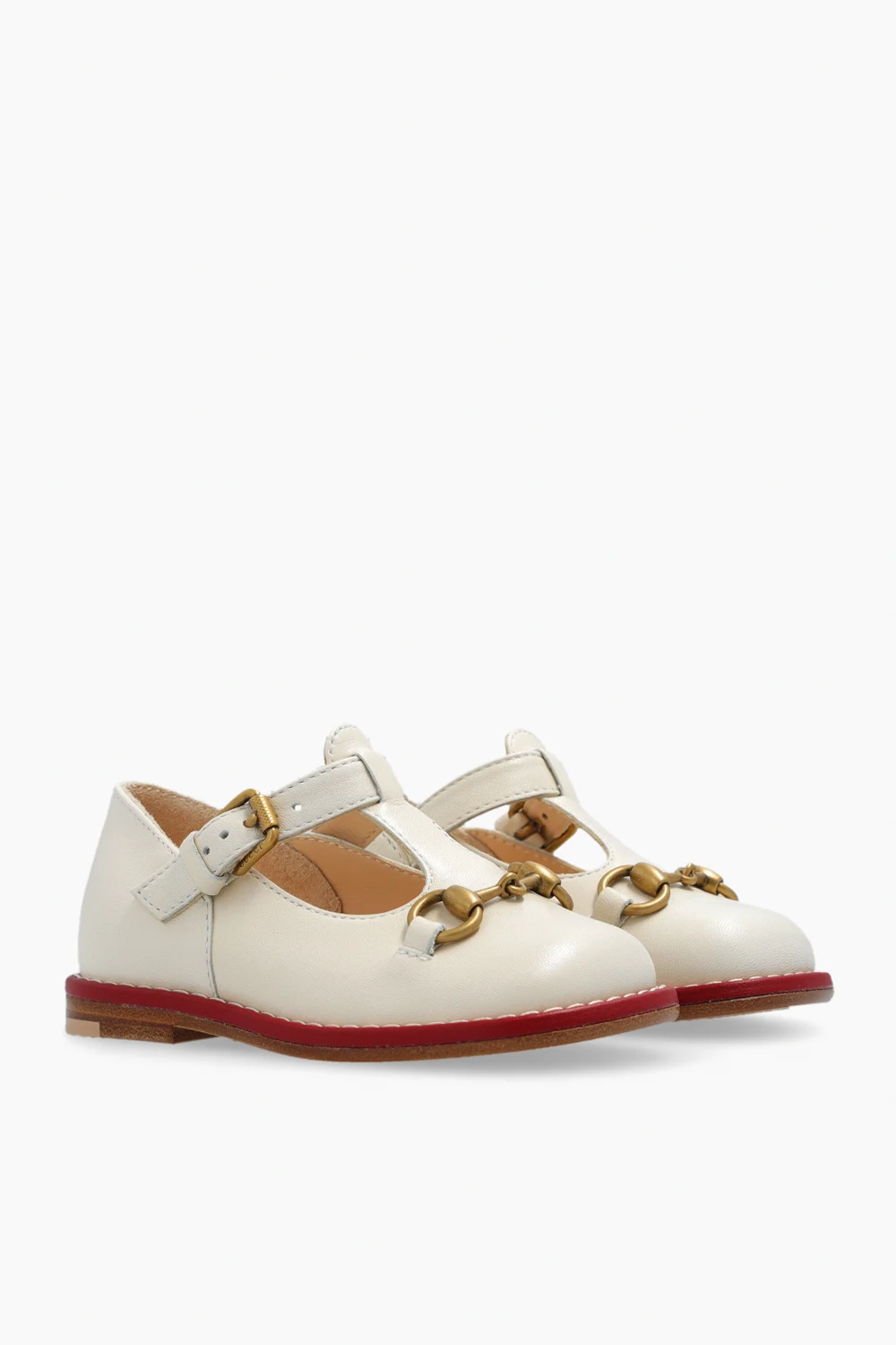 Kremowe buty Gucci Kids. Wykonane ze skóry. Zapinane na regulowany pasek z klamrą. Z przodu ozdobione charakterystyczną aplikacją w kształcie wędzidła w kolorze postarzanego złota. Kremowo-brązowo-czerwona, gumowa podeszwa.