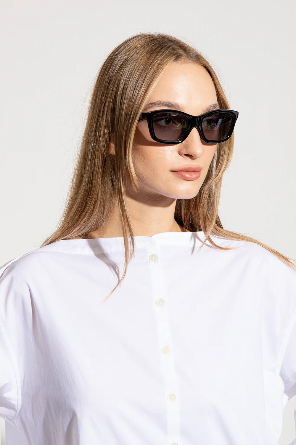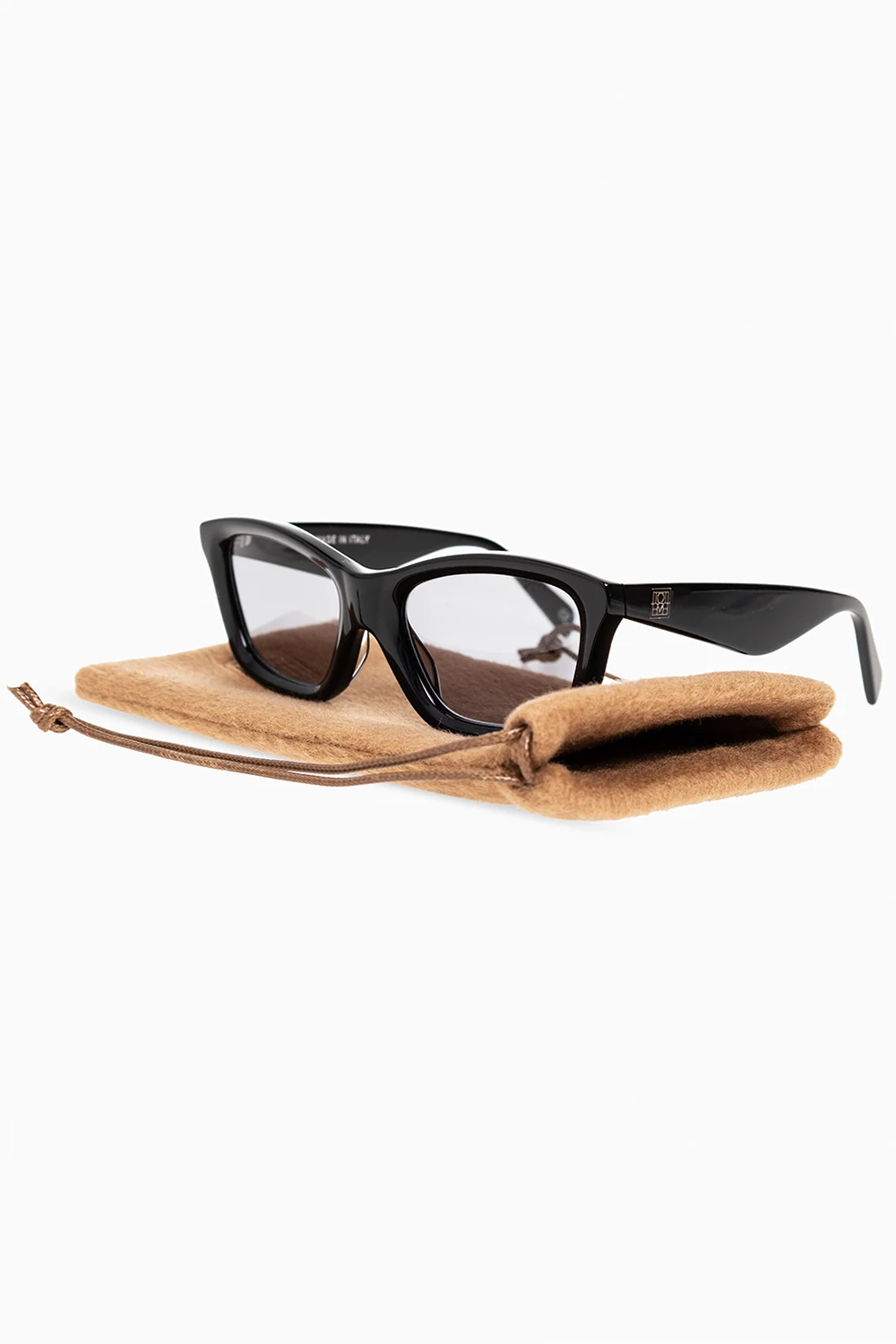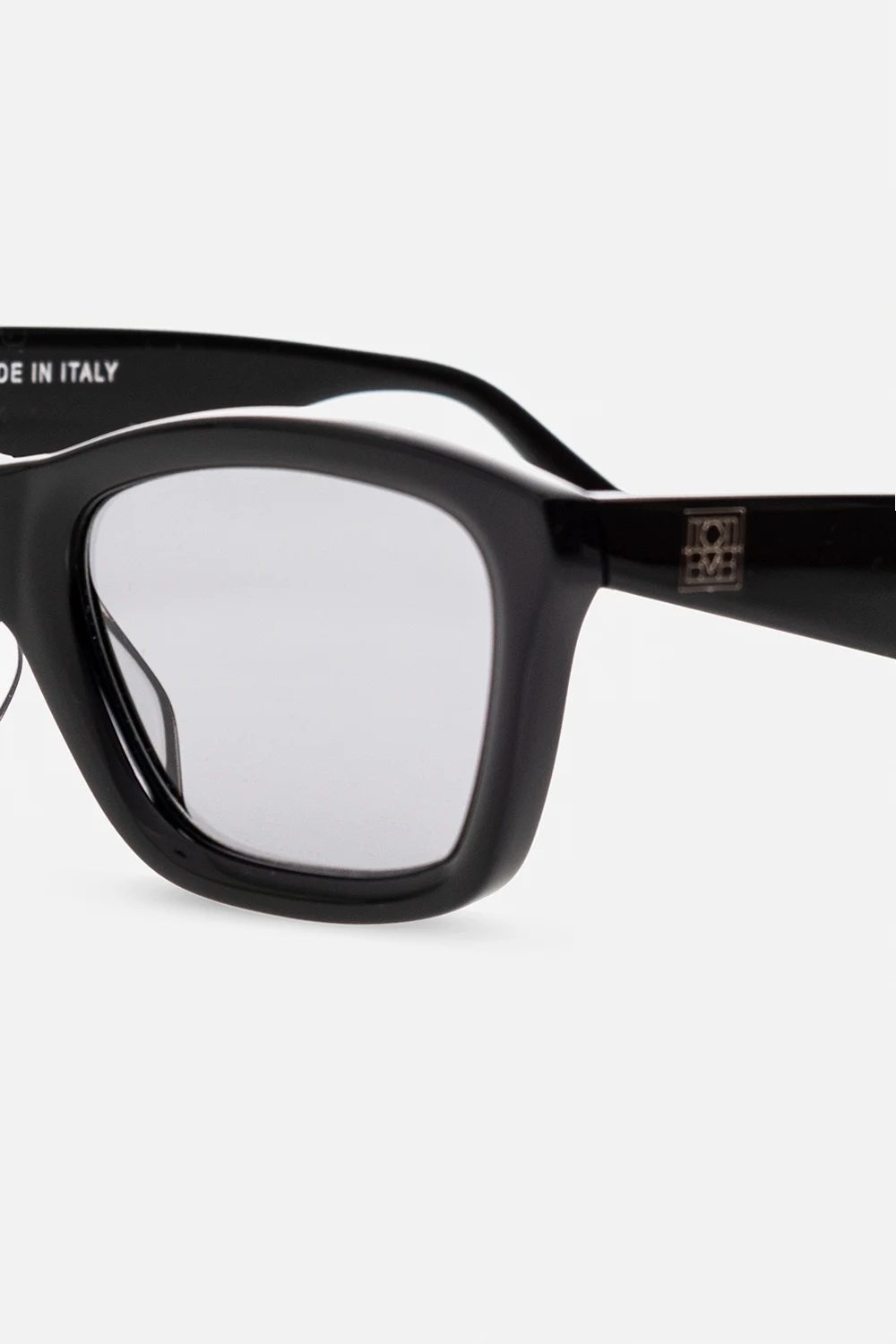 Czarne okulary przeciwsłoneczne, model ‘The Classics’ Toteme. Wykonane ręcznie we Włoszech z polerowanego acetatu. Kwadratowe oprawki o zaokrąglonych krawędziach. Szerokie zauszniki z wygrawerowanym logo. Szare soczewki chroniące przed promieniowaniem UV. Dołączone kaszmirowe etui z wyszytym logo w kolorze brązowym.