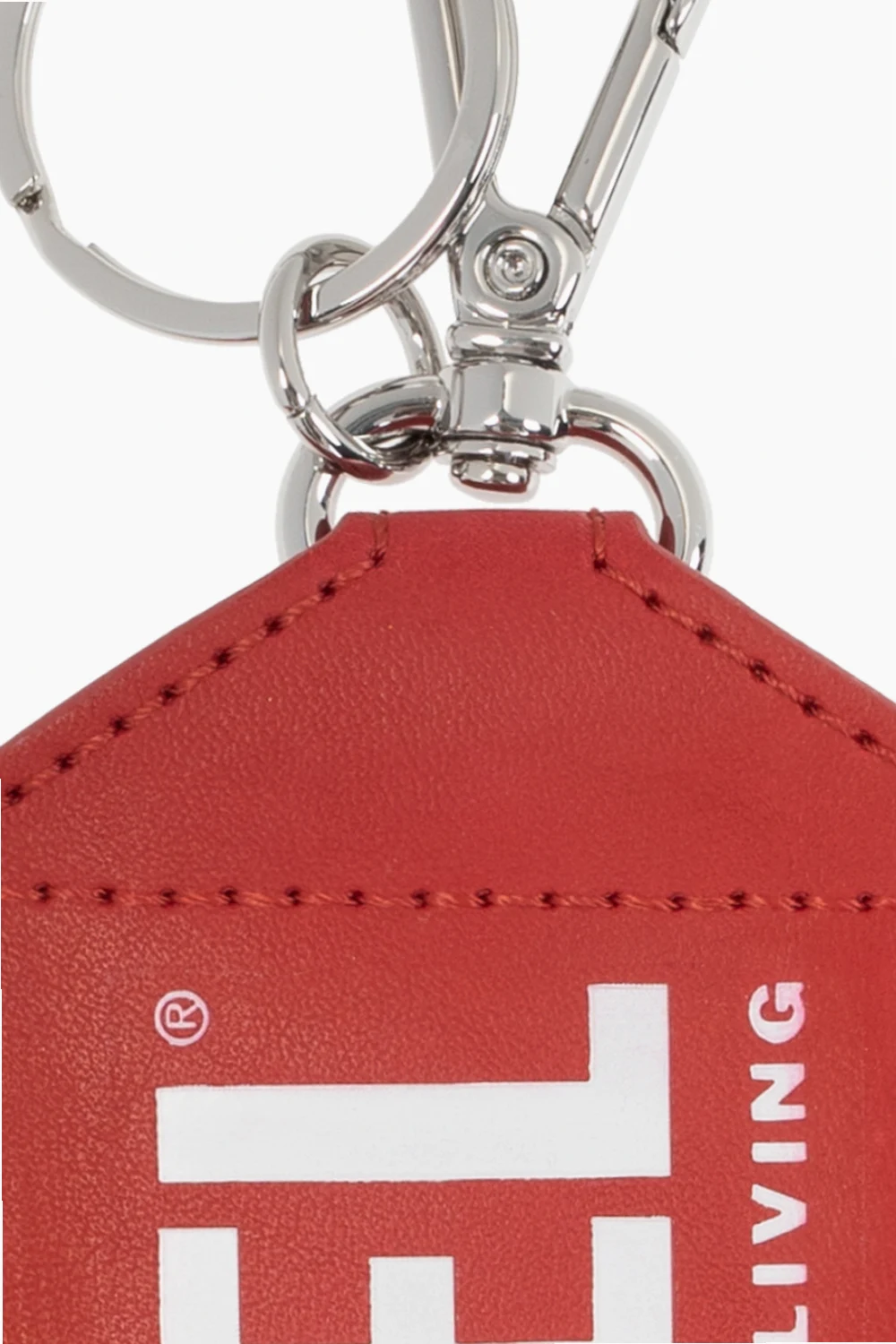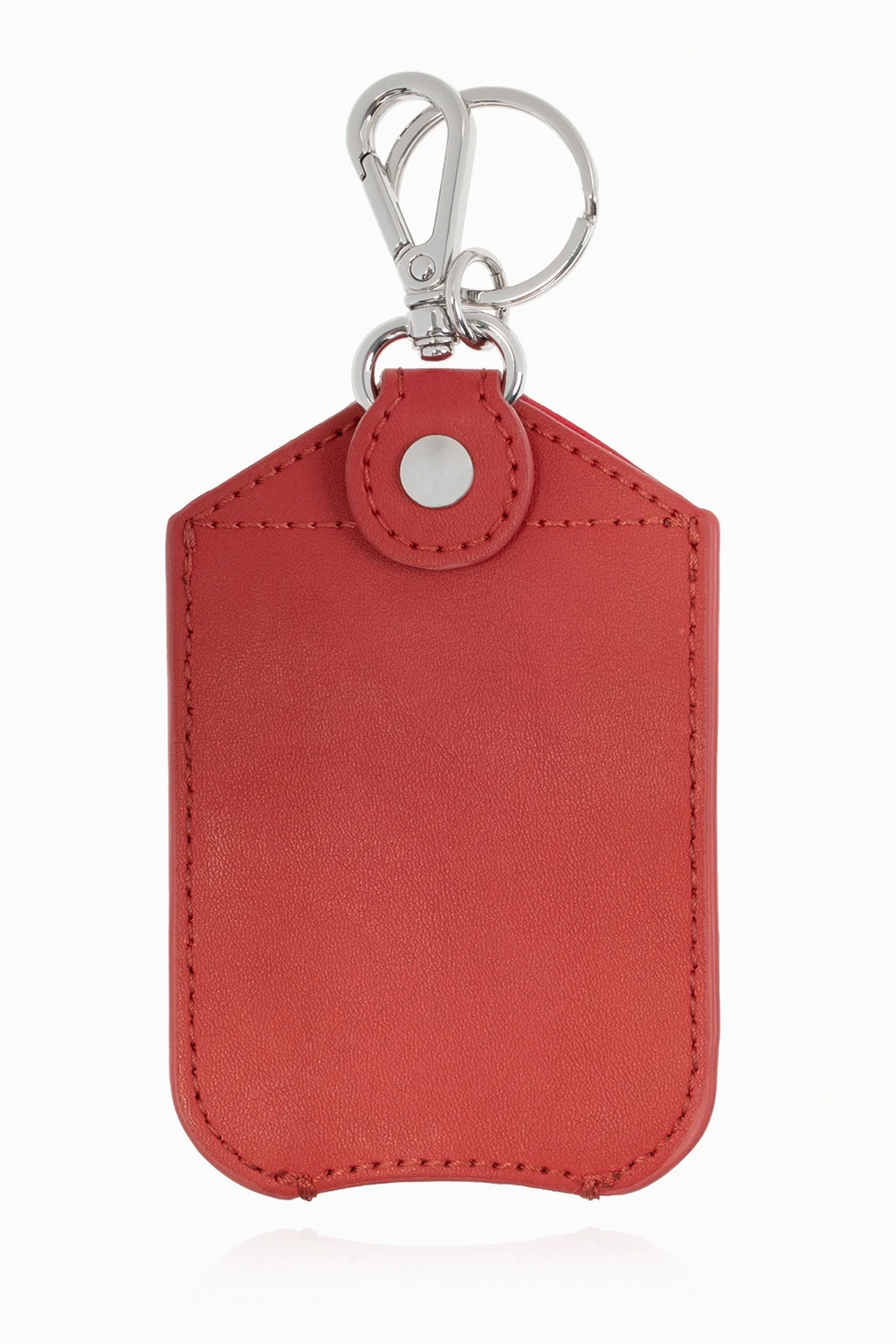 Czerwone etui na środek do dezynfekcji rąk Diesel. Ozdobione nadrukowanym białym logo. Brelok w kolorze srebrnym.