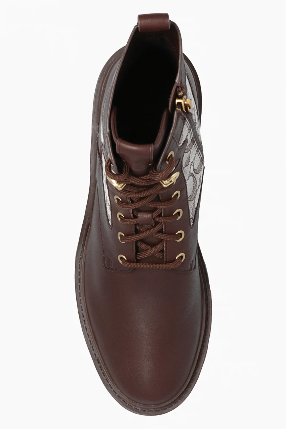 Brązowo-kremowe, sznurowane buty za kostkę, model ‘Citysole’ Coach. Wykonane ze skóry oraz wykończone płótnem ozdobionym monogramem. Z boku zapięcie na zamek. Na języku naszywka z wytłoczonym logo. Brązowa, gumowa podeszwa z transparentnym wykończeniem.