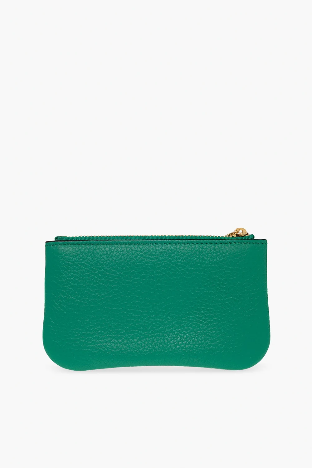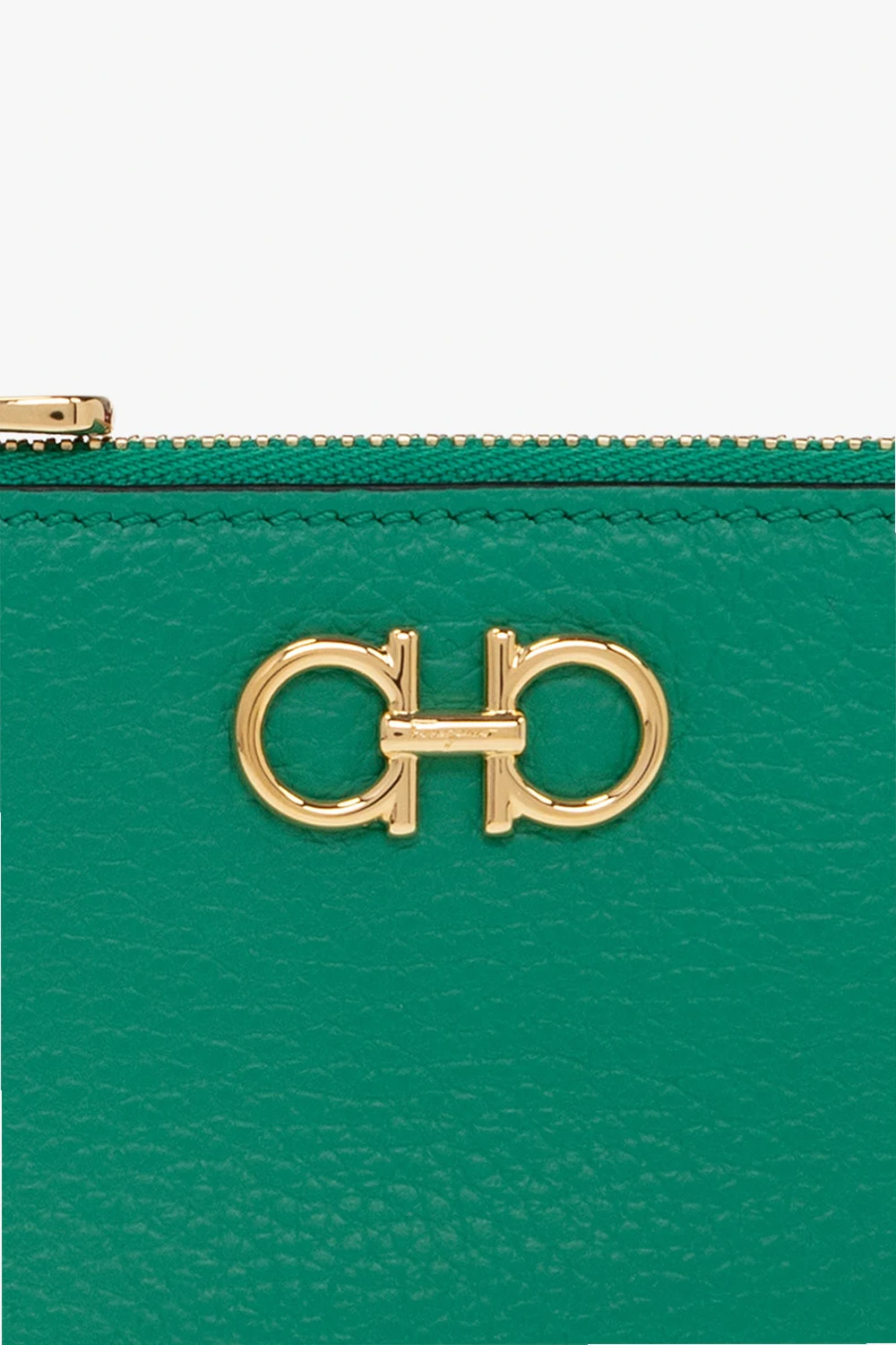 Zielone etui na klucze FERRAGAMO. Wykonane ze skóry. Zamykane na zamek. Z przodu metalowa aplikacja w kształcie logo w kolorze złotym. Wewnątrz komora i brelok na klucze.