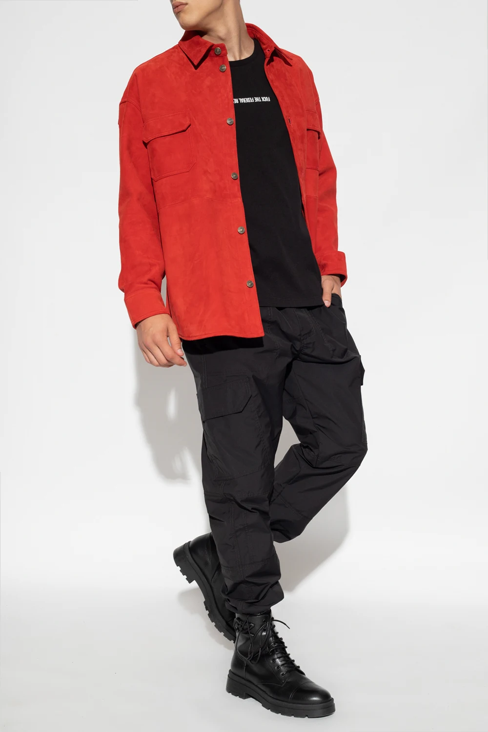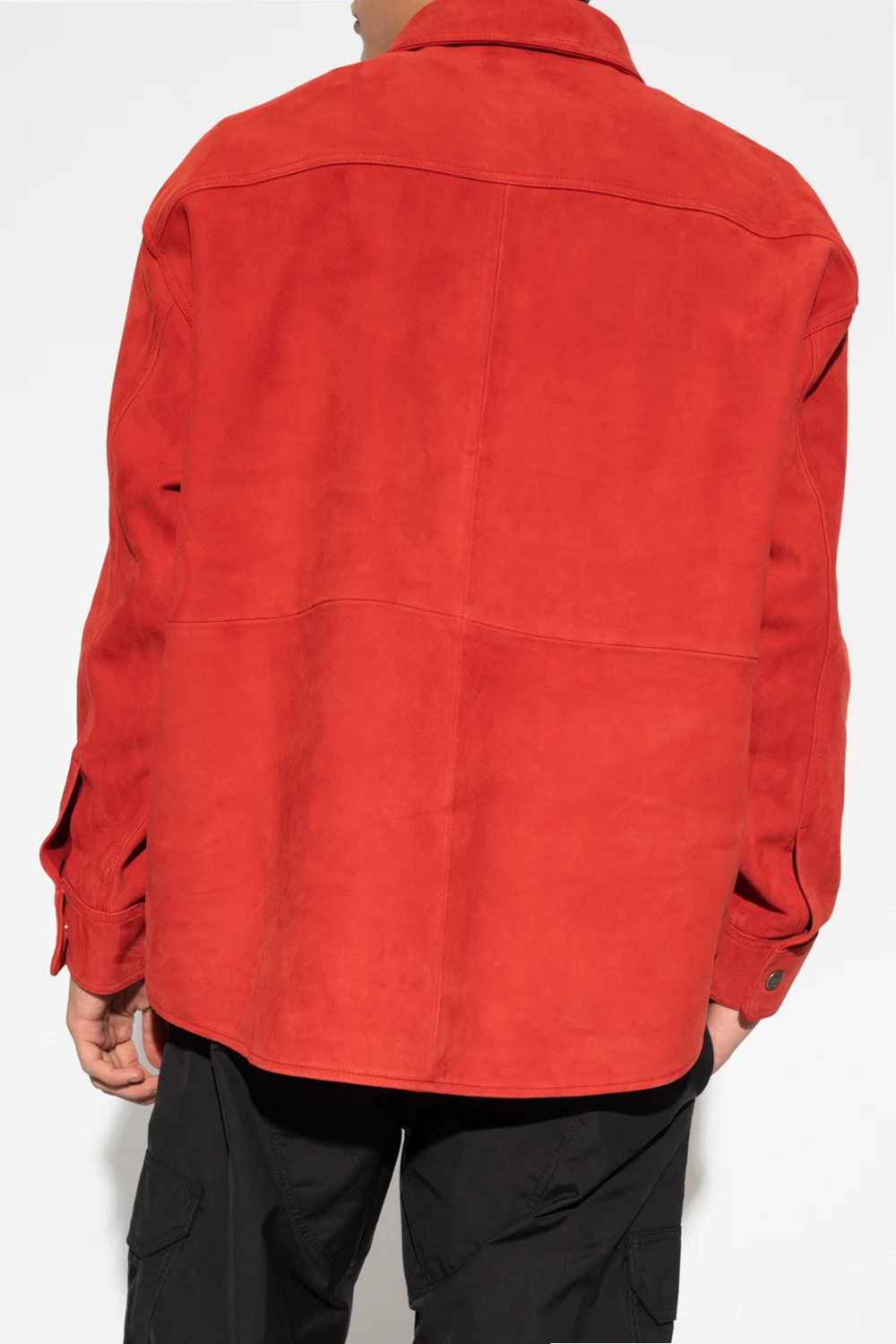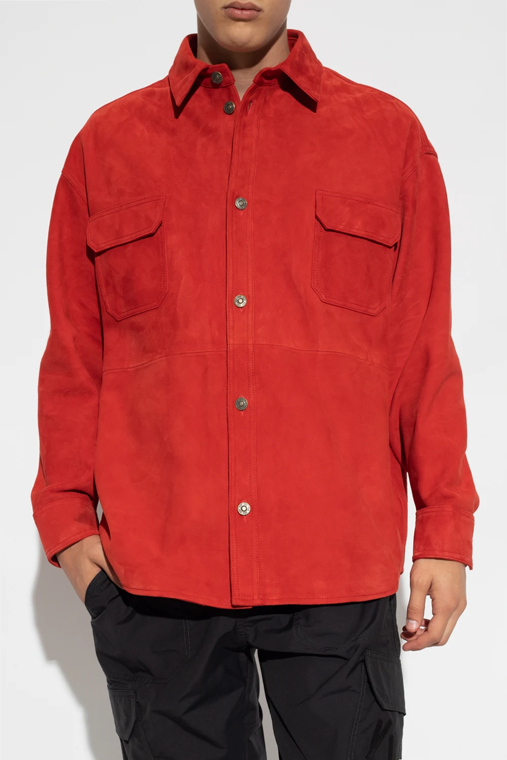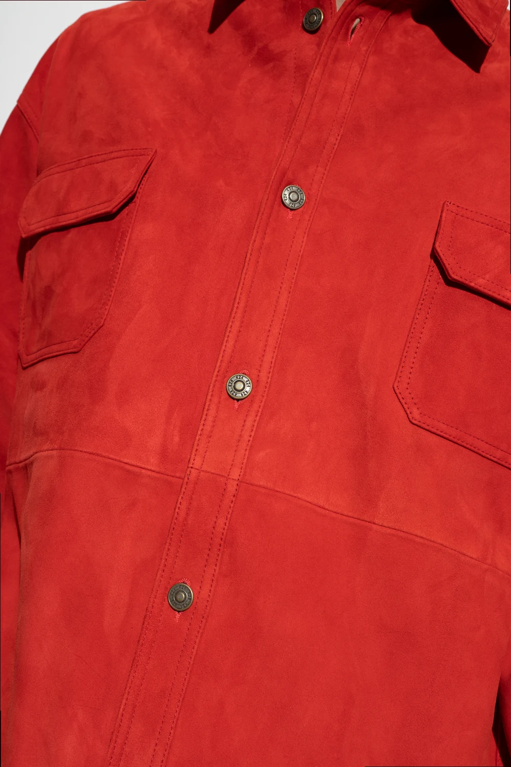 Czerwona koszula 424. Wykonana z zamszu jagnięcego. Zapinana na guziki z wytłoczonym logo. Z przodu dwie kieszenie z patką zapinaną na zatrzask. Długie rękawy, mankiety zapinane na guzik.