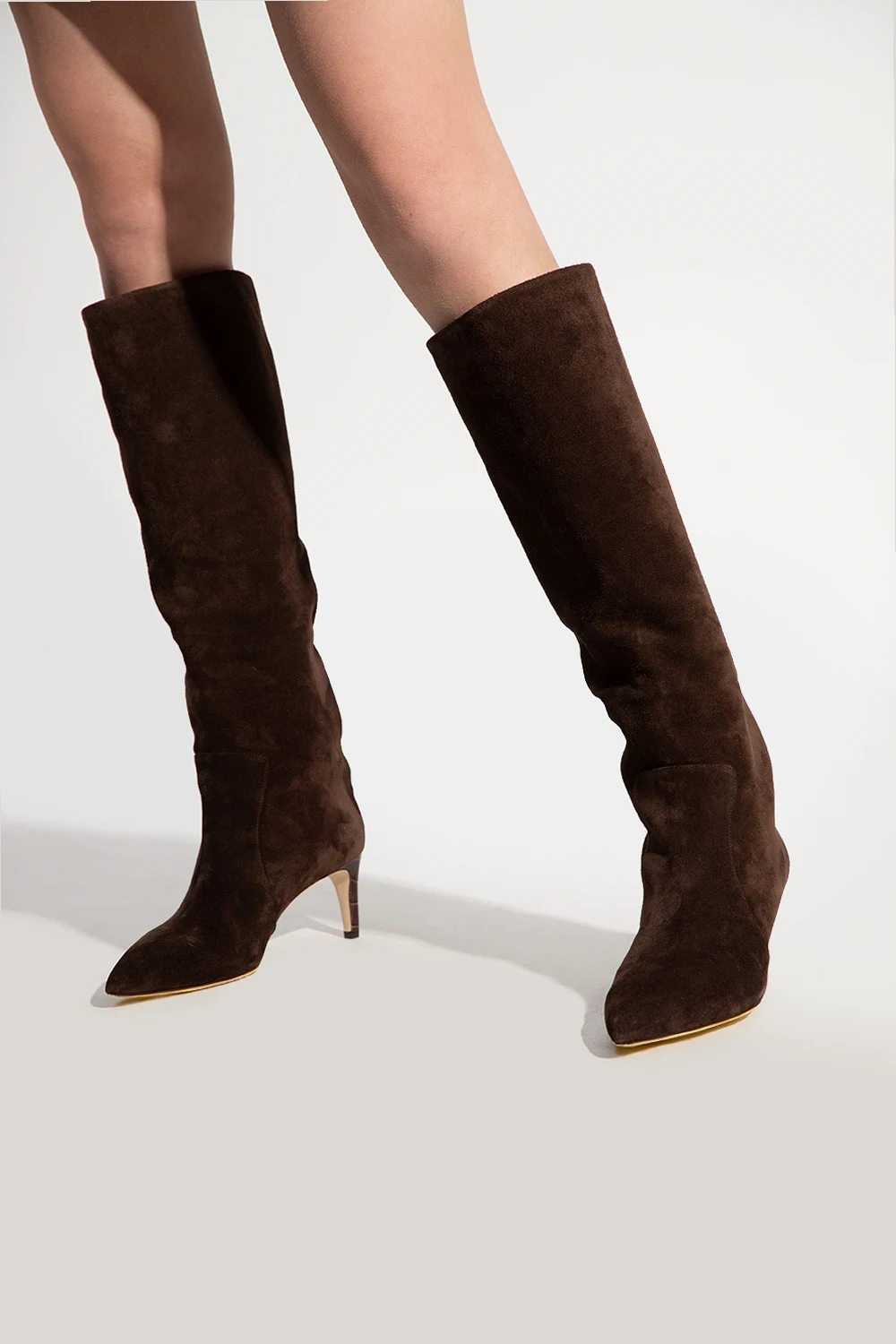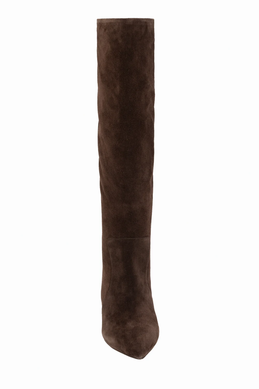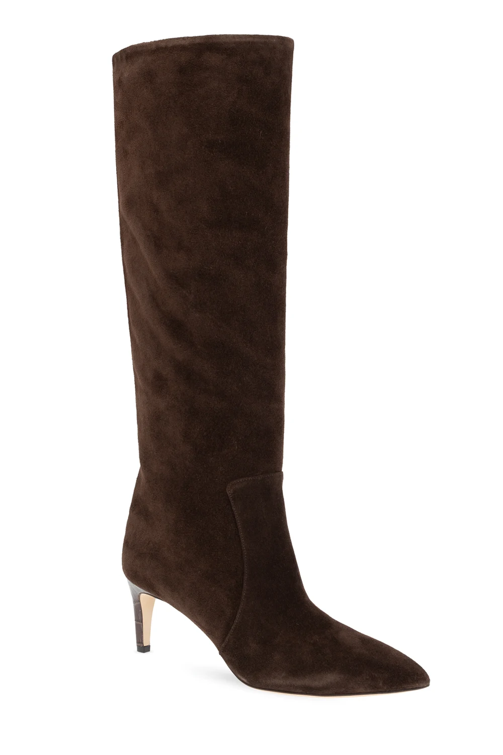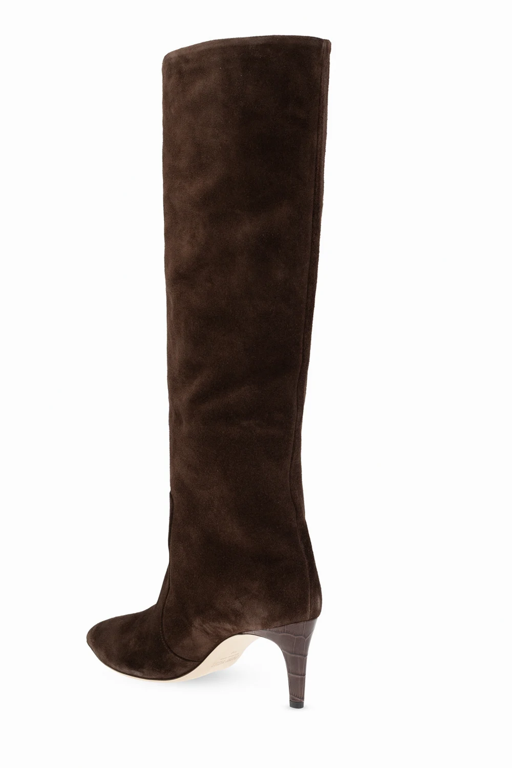 Ciemnobrązowe kozaki na obcasie, model 'Stiletto' Paris Texas. Wykonane z cielęcego zamszu. Nosek w szpic. Beżowa, skórzana podeszwa.