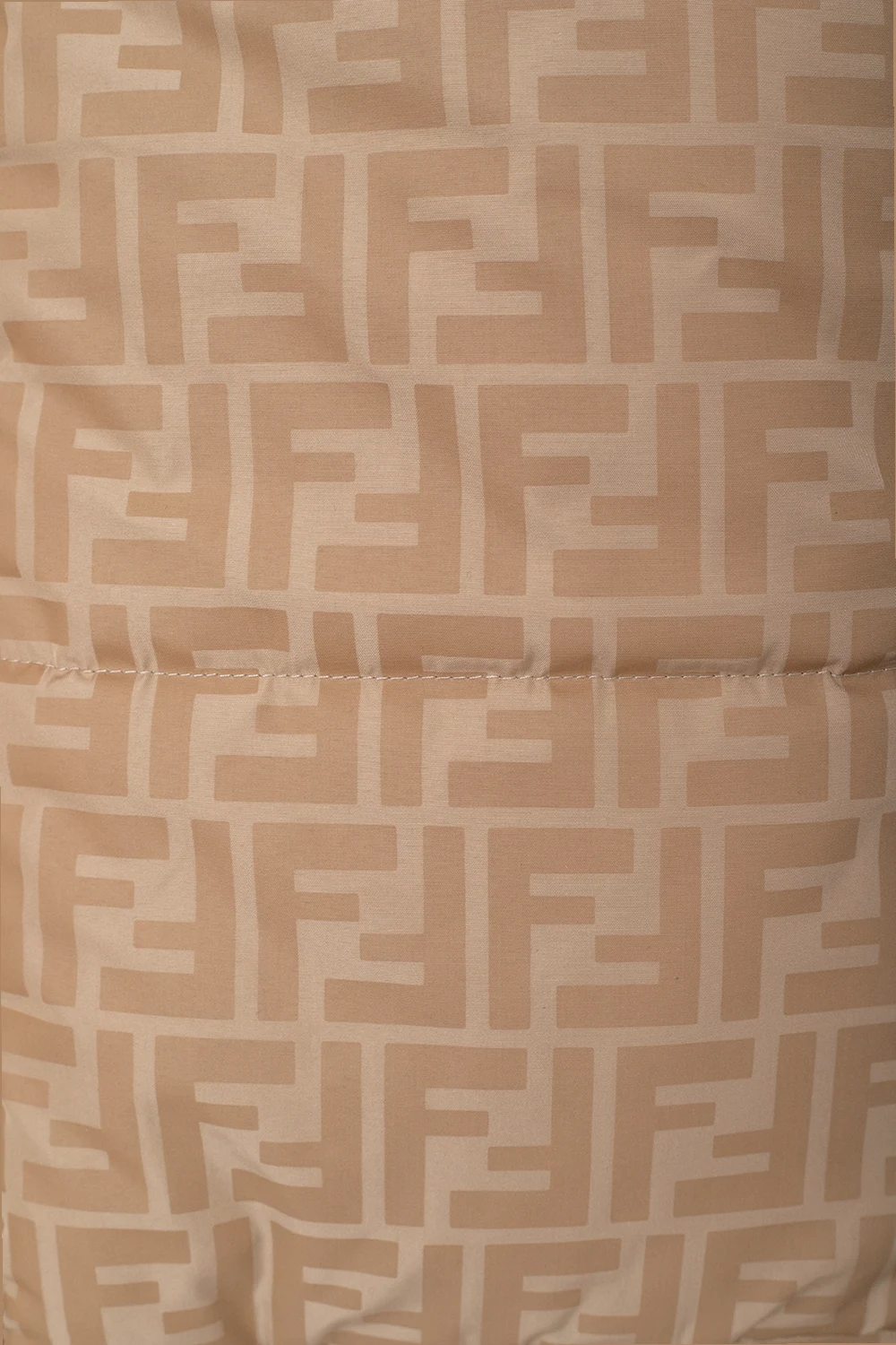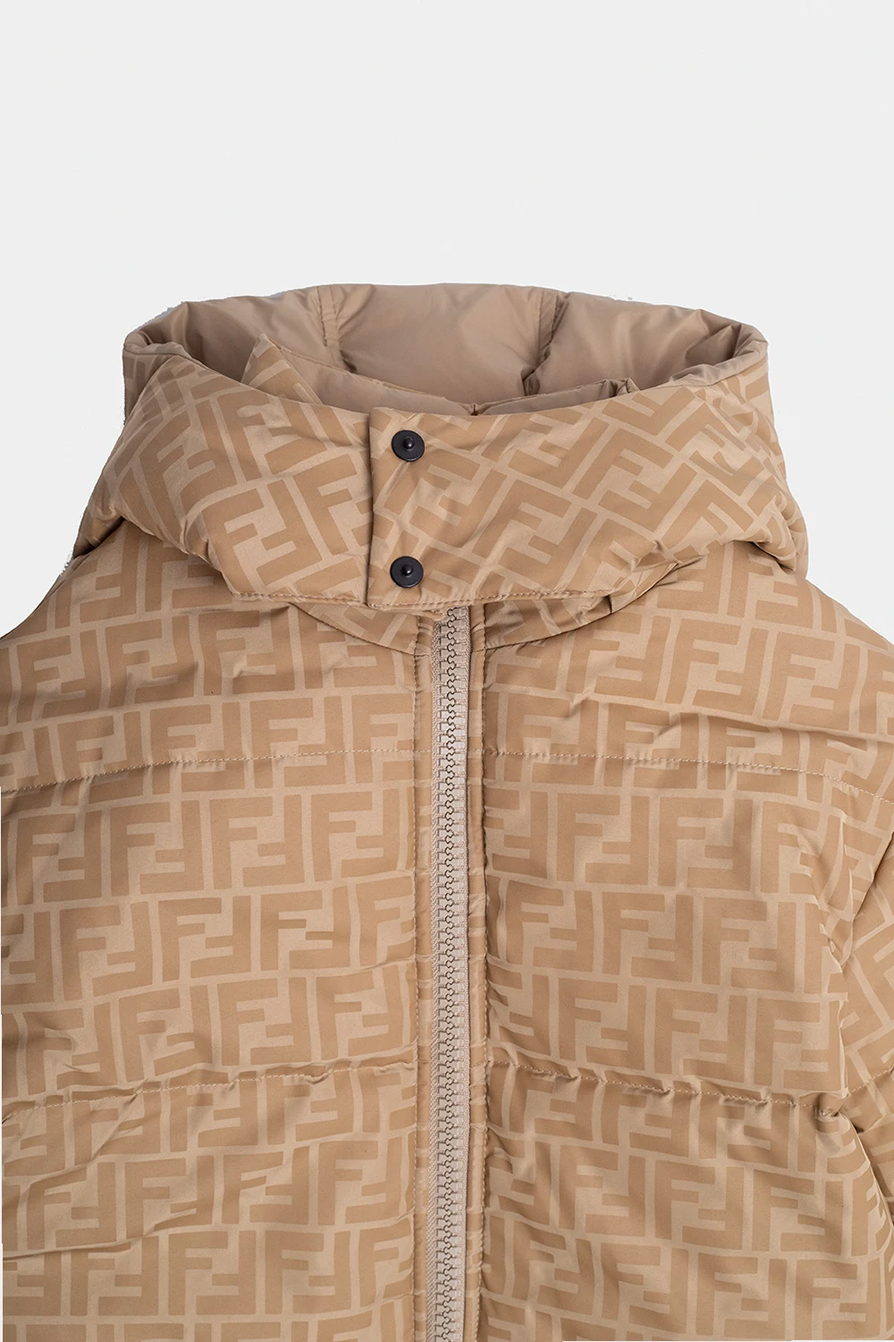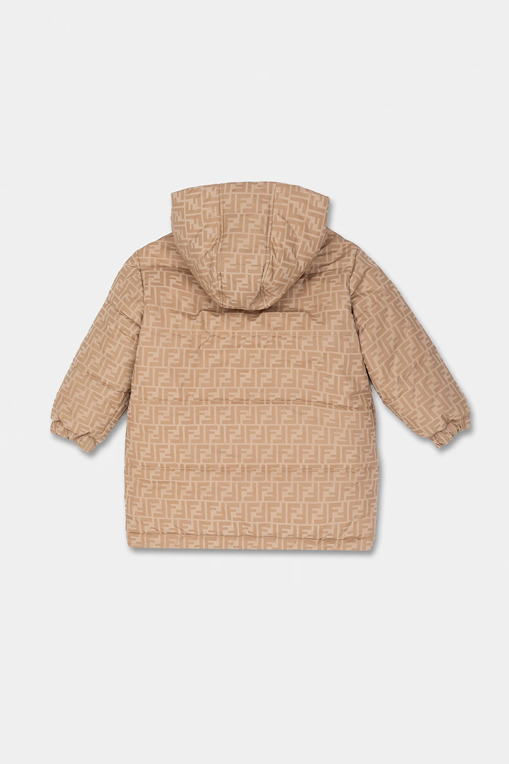 Beżowo-brązowa kurtka puchowa Fendi Kids. Zapinana na zamek. Ozdobiona wzorem z monogramem. Dwie wsuwane kieszenie. Odpinany kaptur. Warstwa wewnętrzna w kolorze jasnobrązowym. Długie rękawy wykończone ściągaczem.