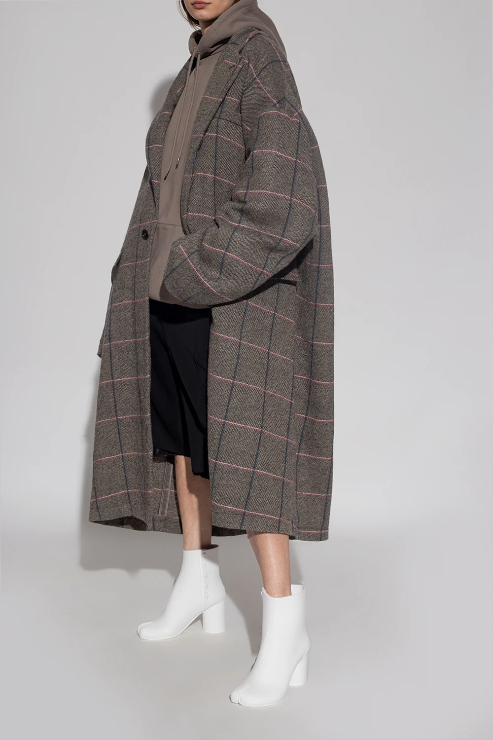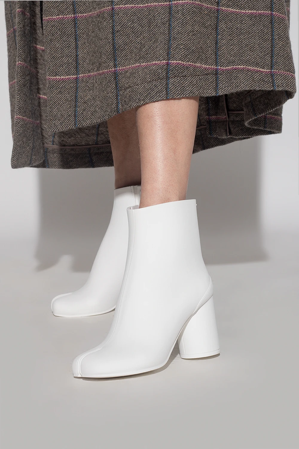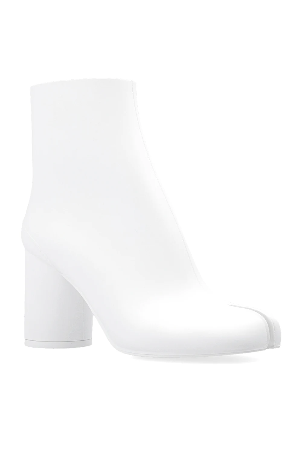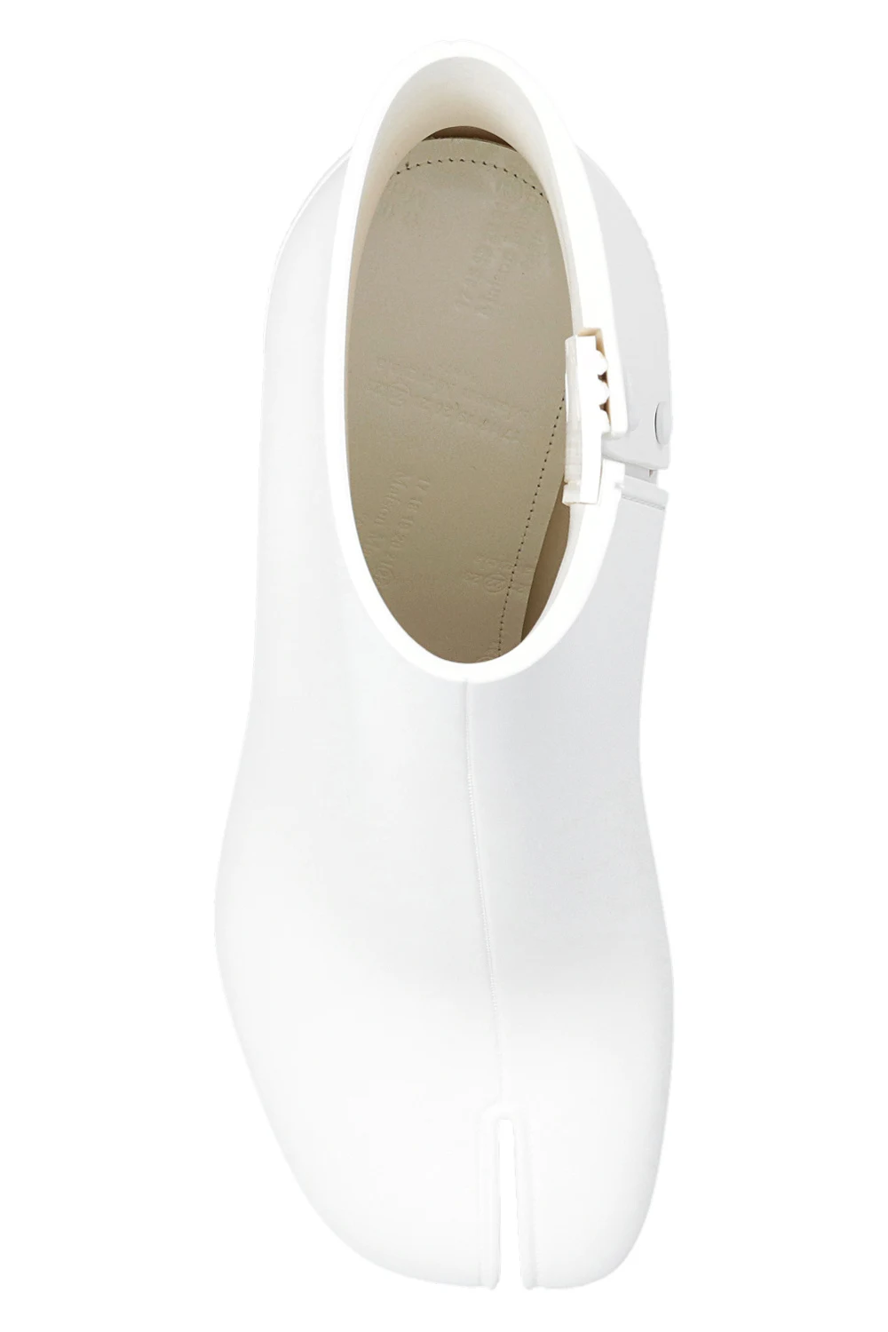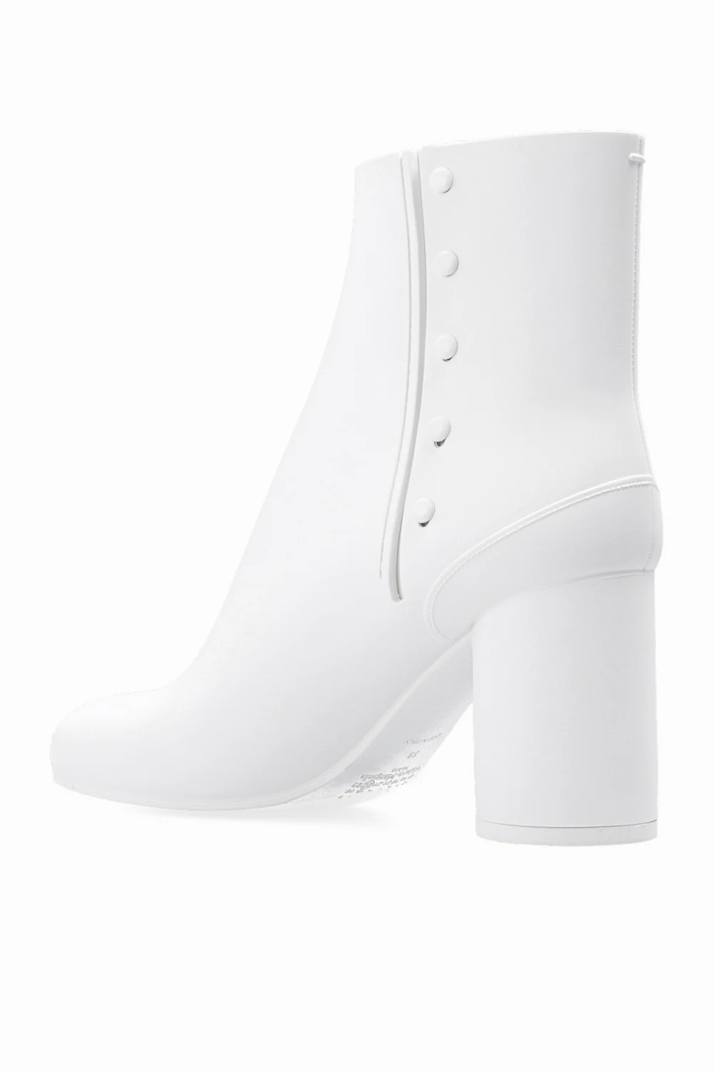 Białe, gumowe botki z wycięciem ‘Tabi’ Maison Margiela. Z boku zapinane na guziki. Okrągły obcas. Biała podeszwa.