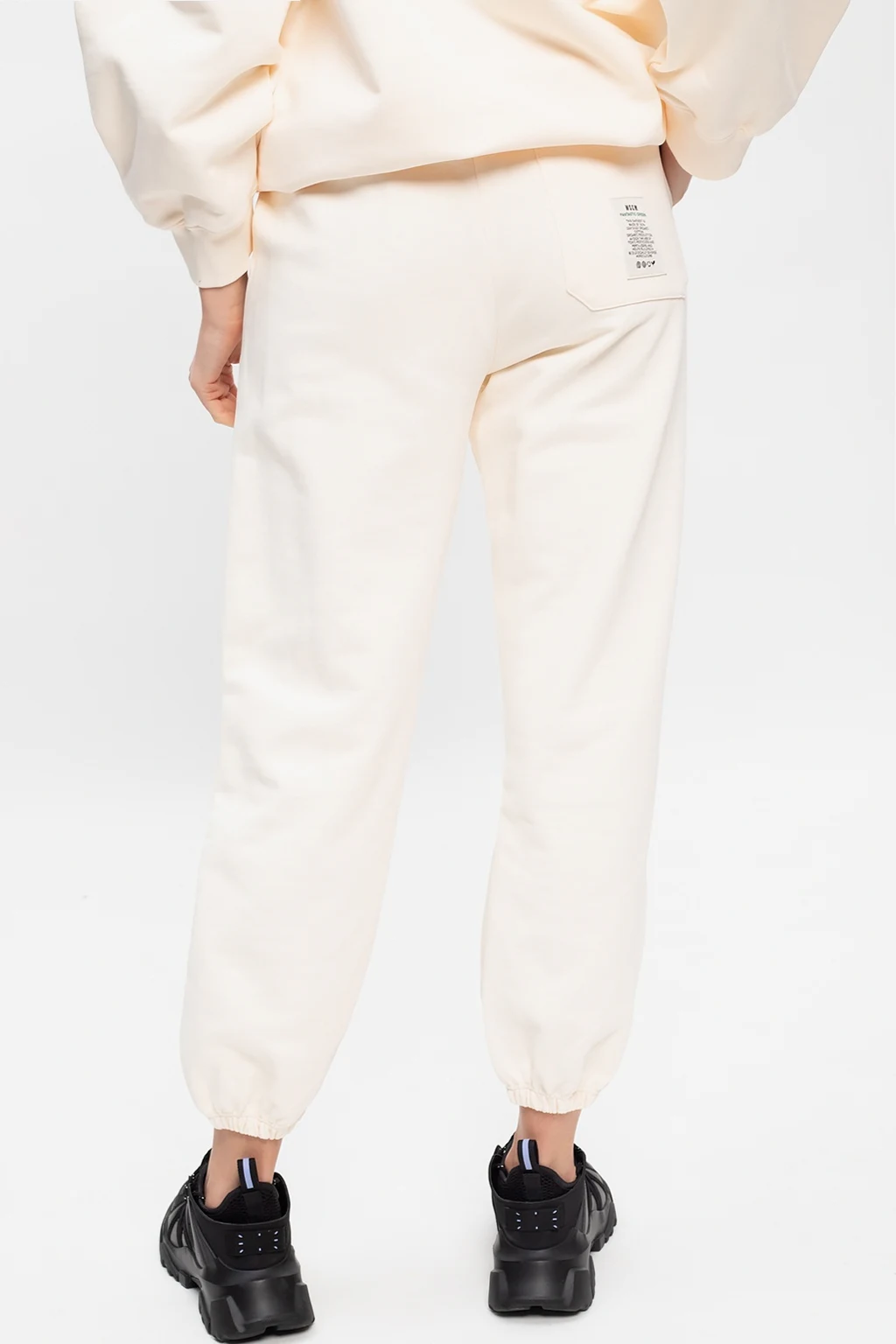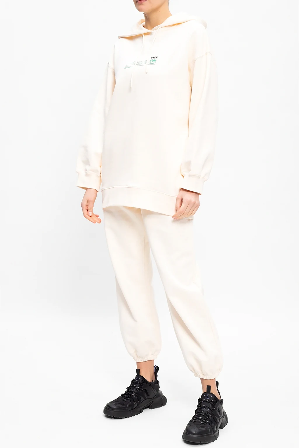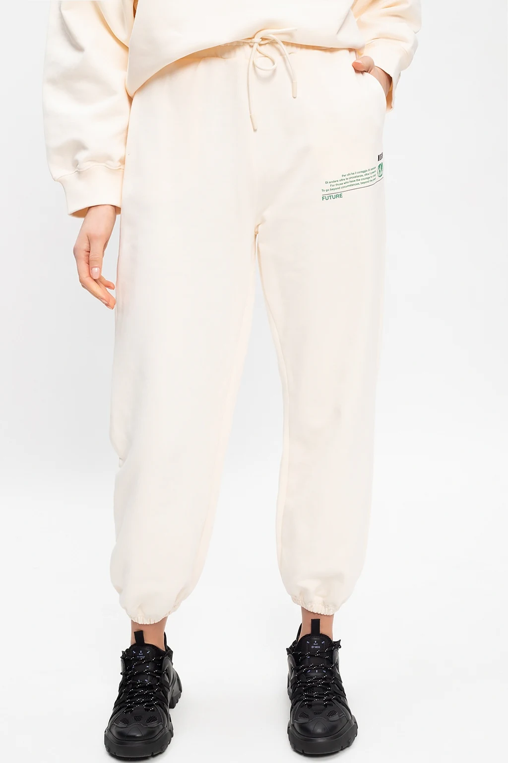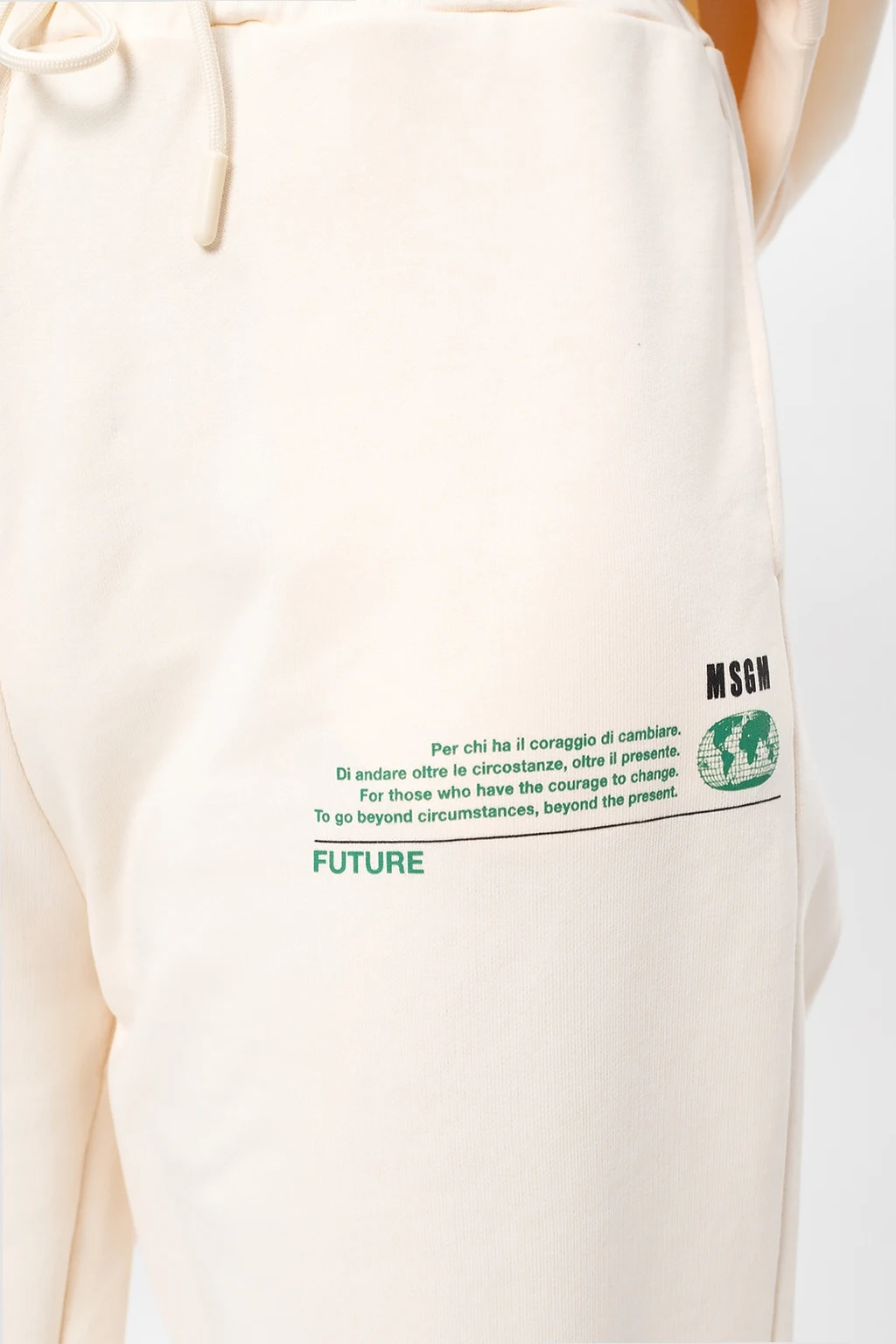 Kremowe, bawełniane spodnie dresowe MSGM. Ściągane trokami. Trzy wsuwane kieszenie: dwie z przodu oraz jedna z tyłu. Ozdobione nadrukowanym wzorem z logo w kolorze zielono-czarnym.