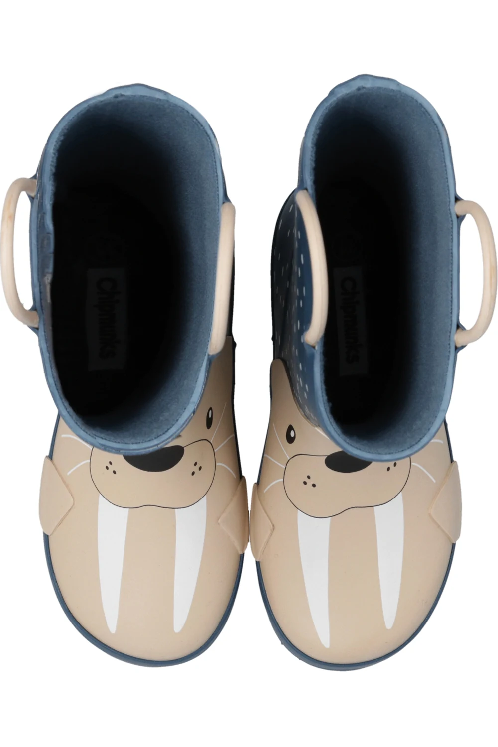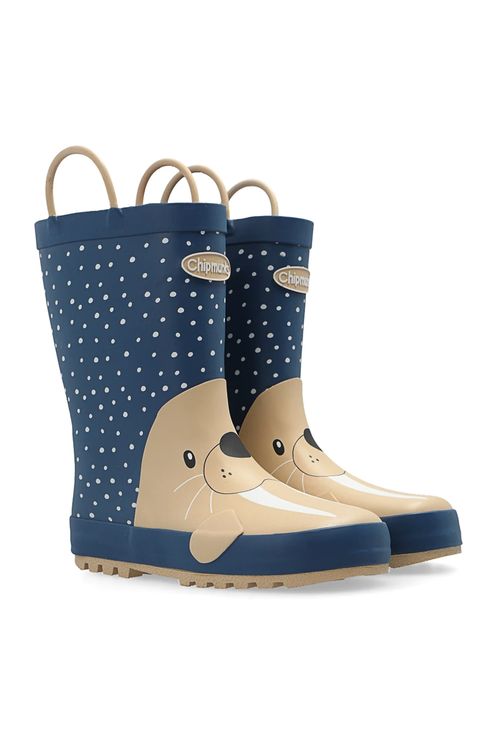 Granatowo-beżowo-białe, wodoodporne kalosze, model ‘Chipmunks Waldo’ Chipmunks. Ozdobione wzorem z motywem zwierzęcym oraz wypukłym logo. Dwie półokrągłe rączki ułatwiające wsuwanie. Tekstylne wnętrze. Beżowa, gumowa podeszwa.