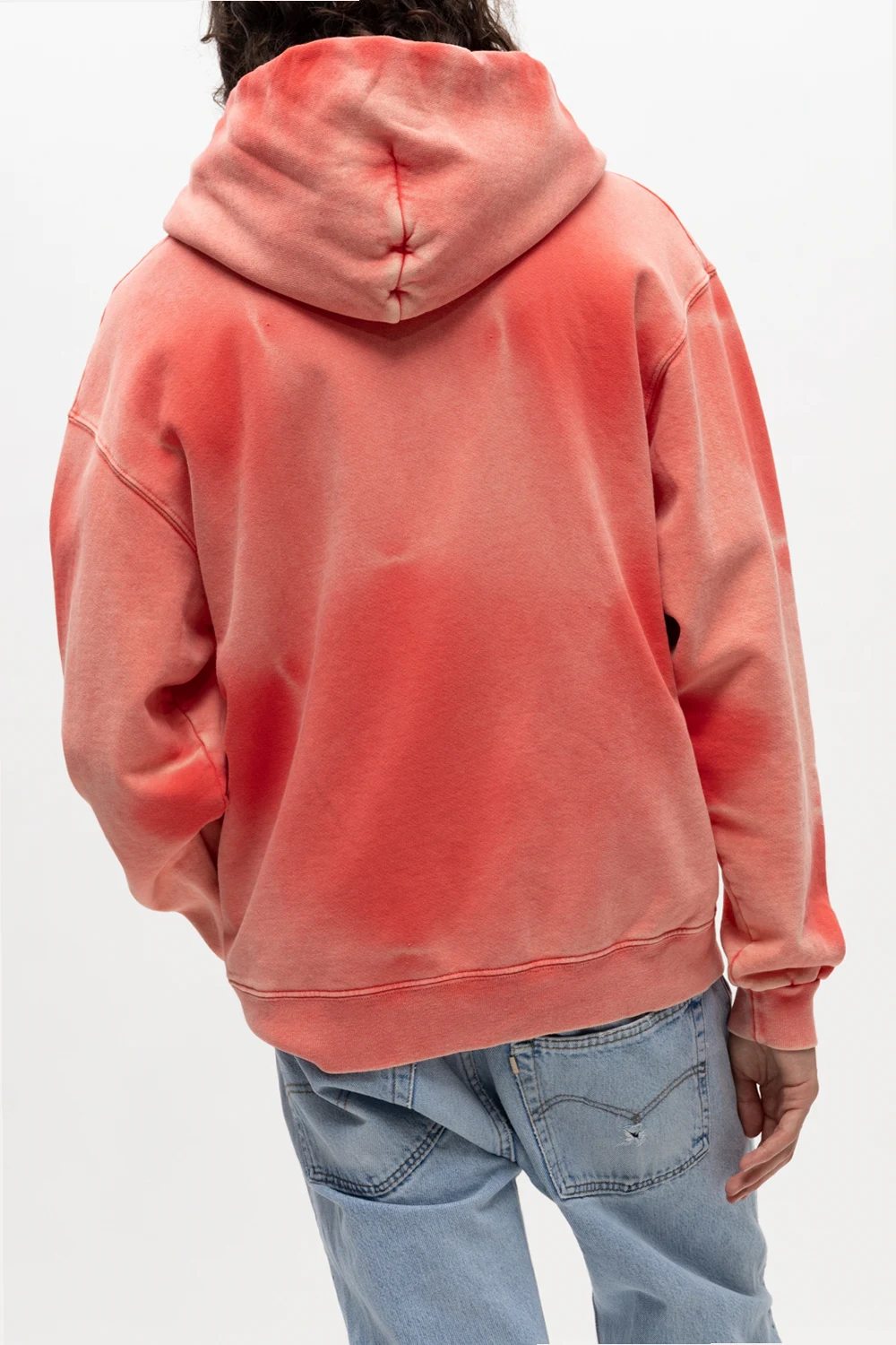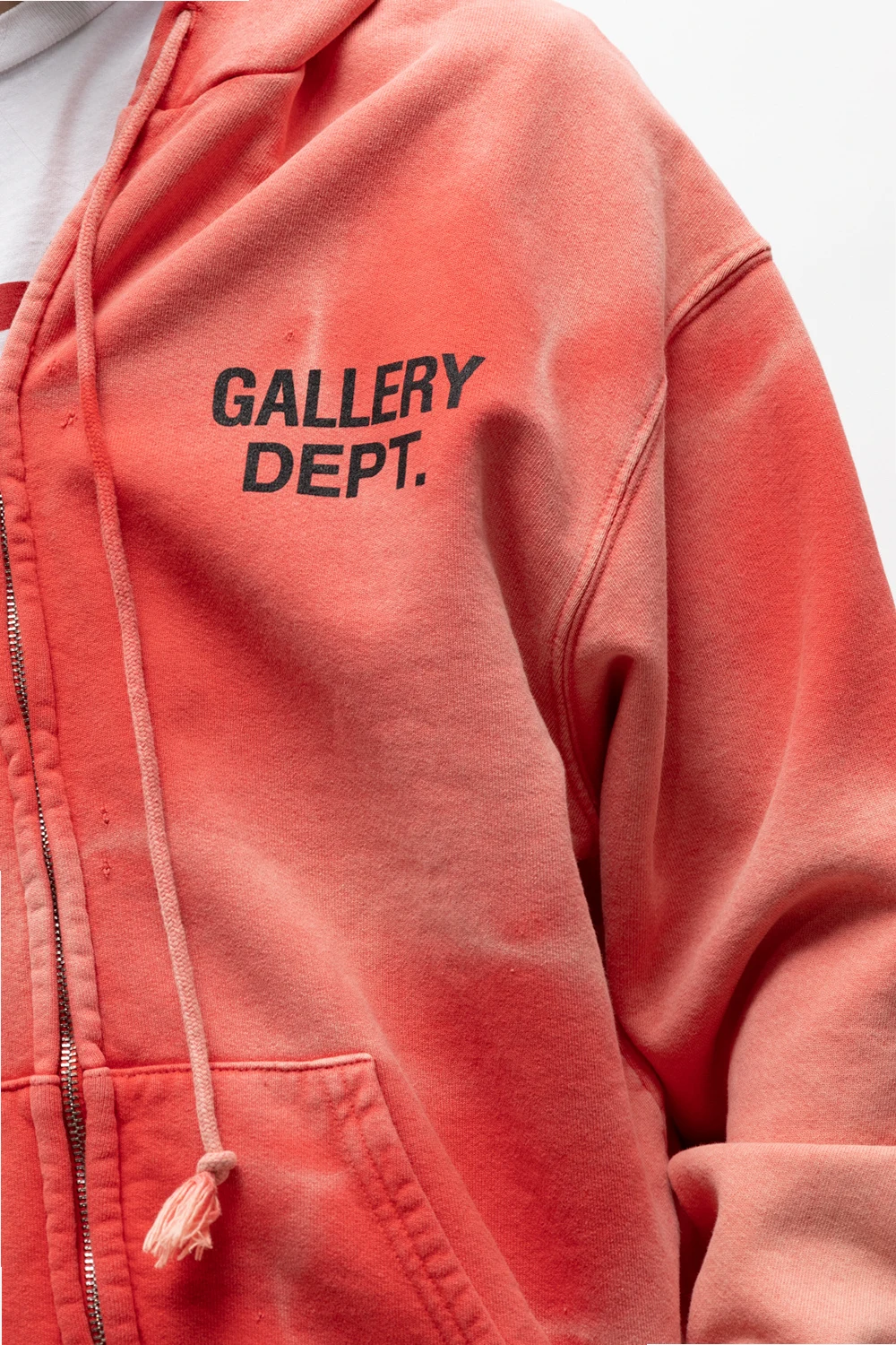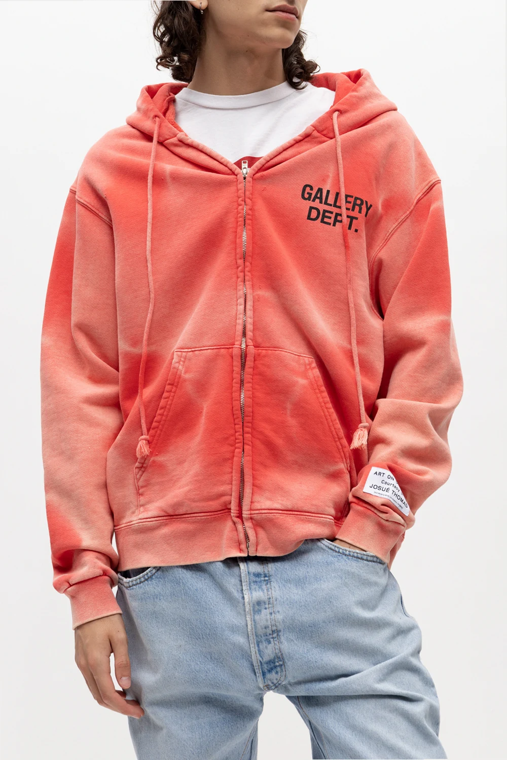 Czerwona bluza GALLERY DEPT. Wykonana z bawełny. Zapinana na zamek. Ozdobiona czarnym nadrukiem z logo oraz efektem znoszenia. Dwie wsuwane kieszenie. Kaptur ściągany trokami. Dół i długie rękawy wykończone ściągaczem.