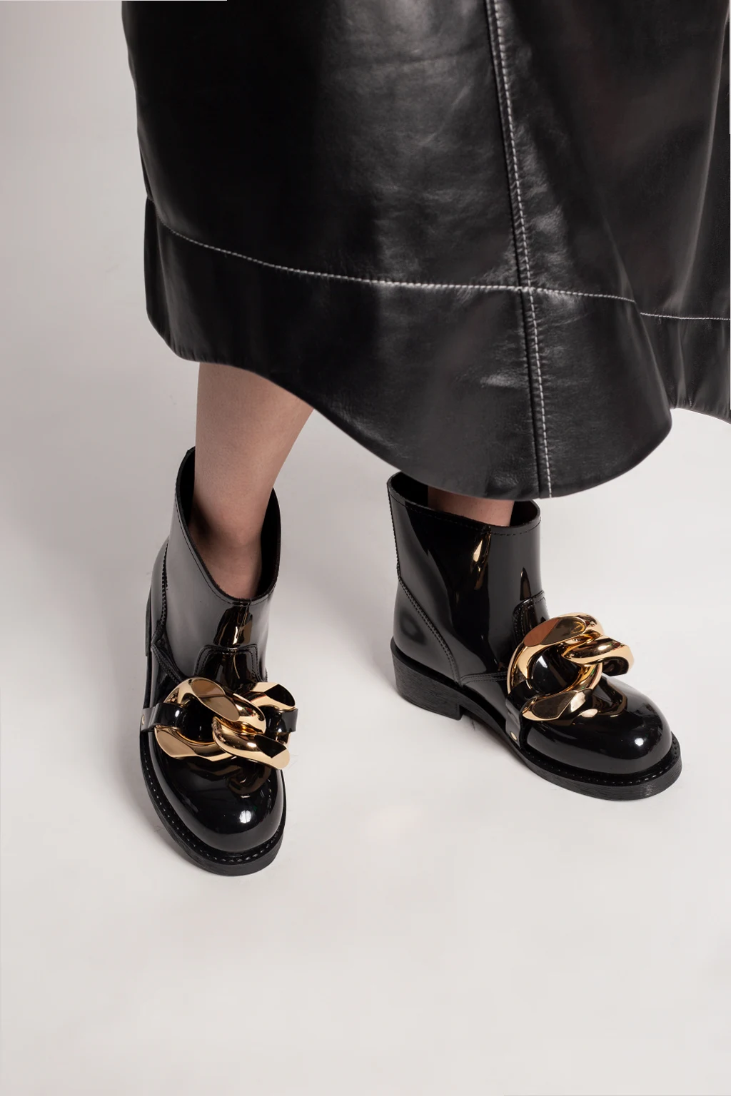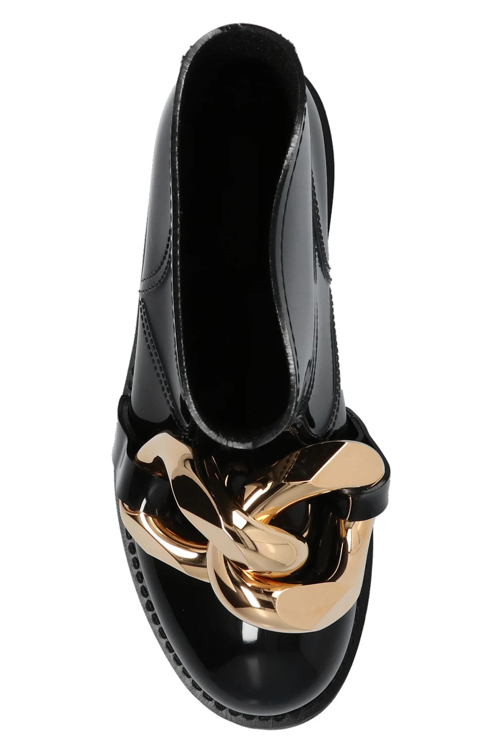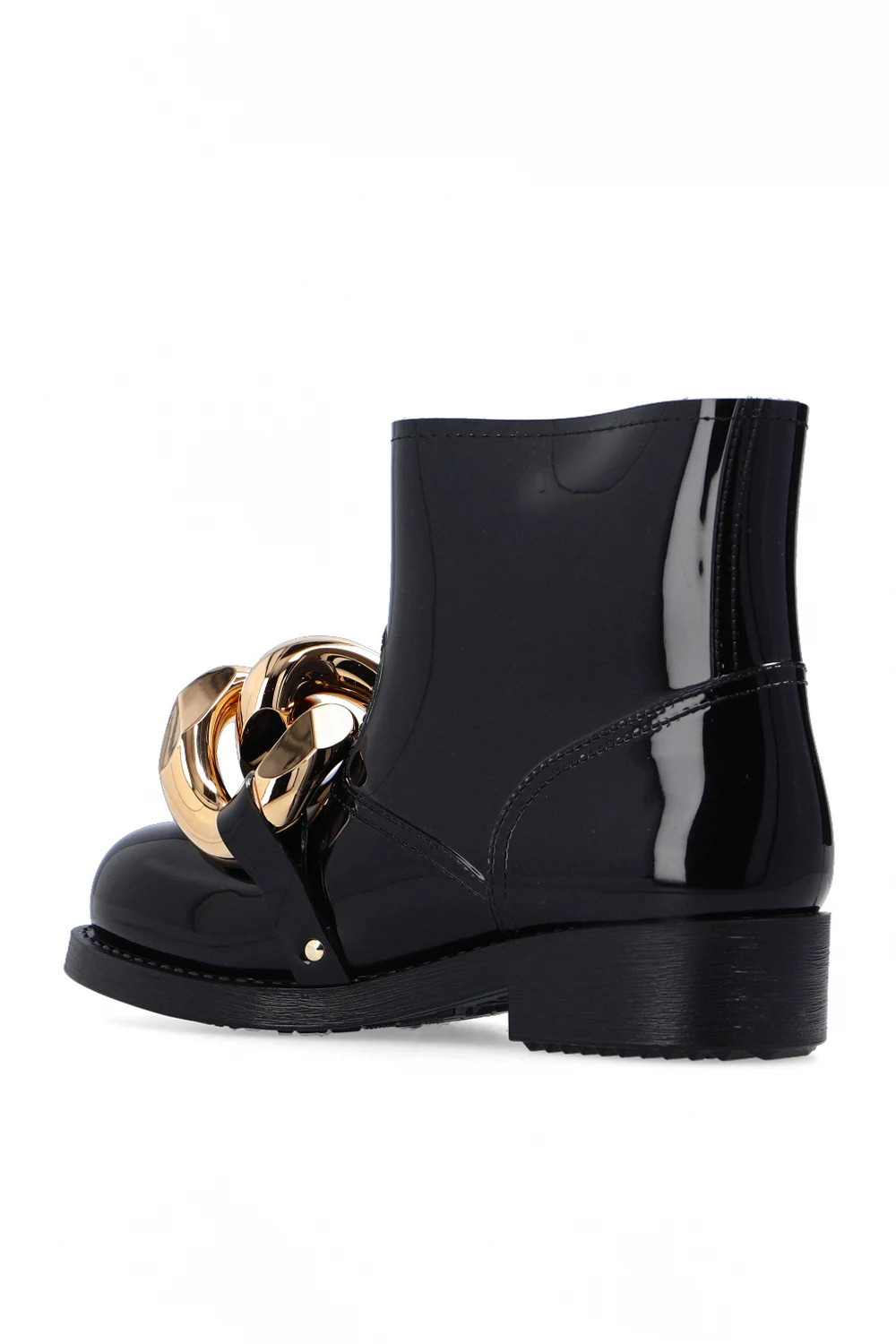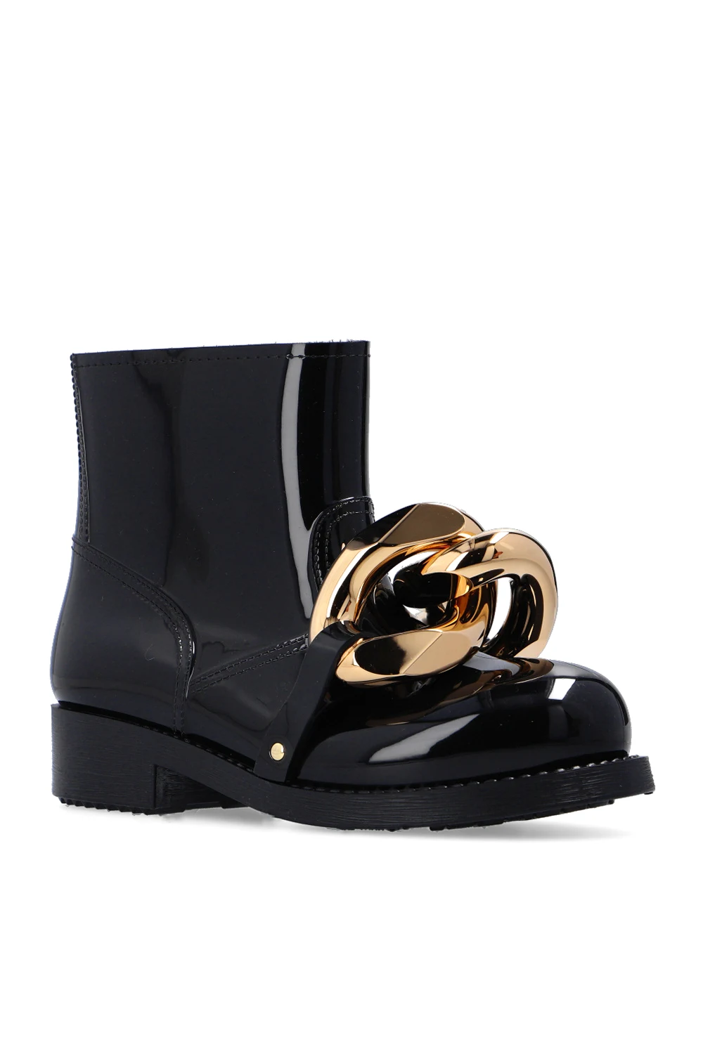 Czarne, krótkie kalosze JW Anderson. Z przodu metalowa aplikacja w kształcie ogniw łańcucha w kolorze złotym. Gumowa podeszwa w kolorze czarnym.
