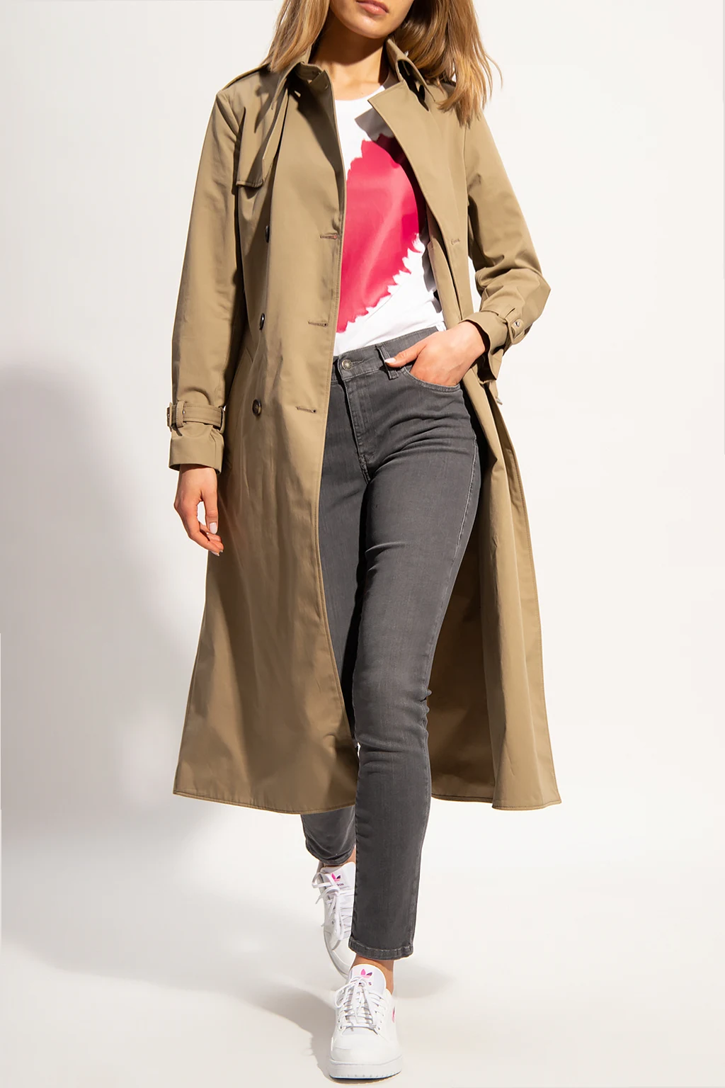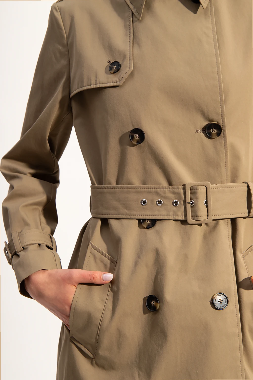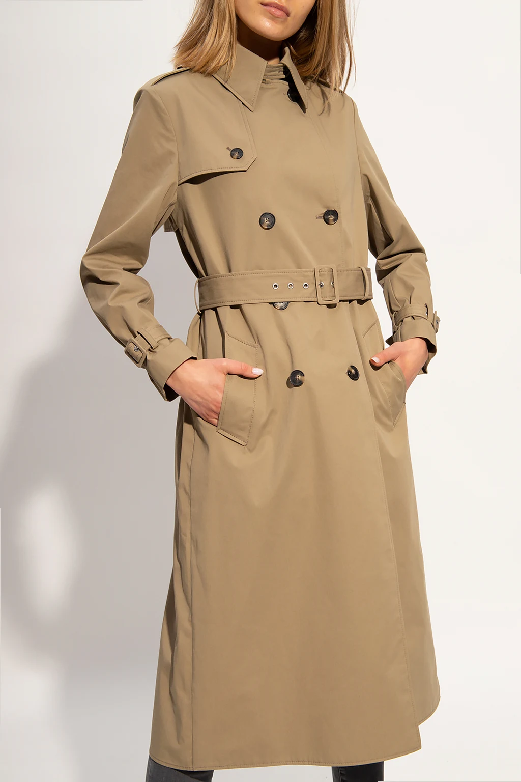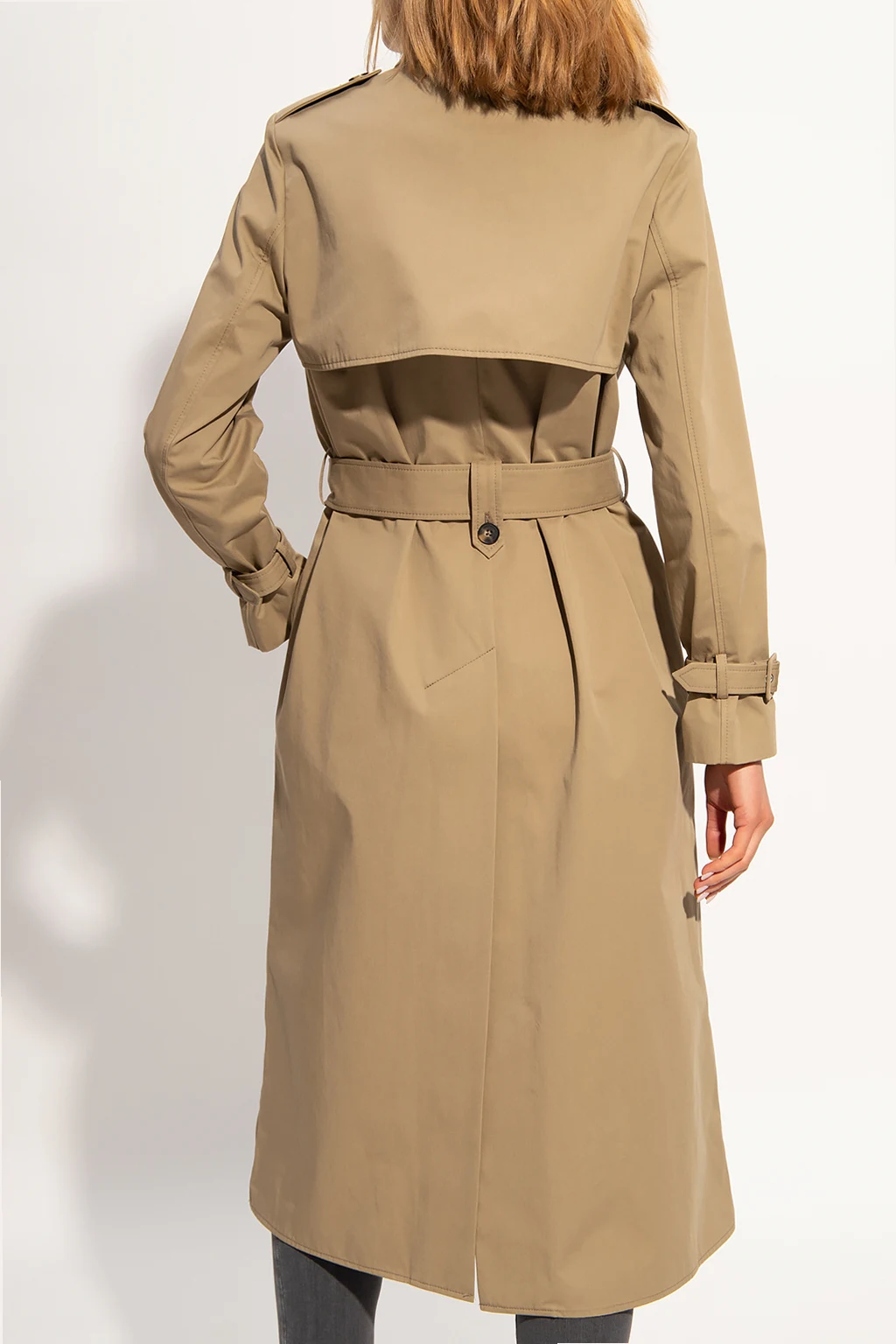 Beżowy, bawełniany trencz Zadig & Voltaire x DÉFILÉ. Dwurzędowy, zapinany na guziki. W talii pasek z klamrą. Na ramionach pagony. Z przodu dwie kieszenie. Długie rękawy. Z tyłu rozcięcie.