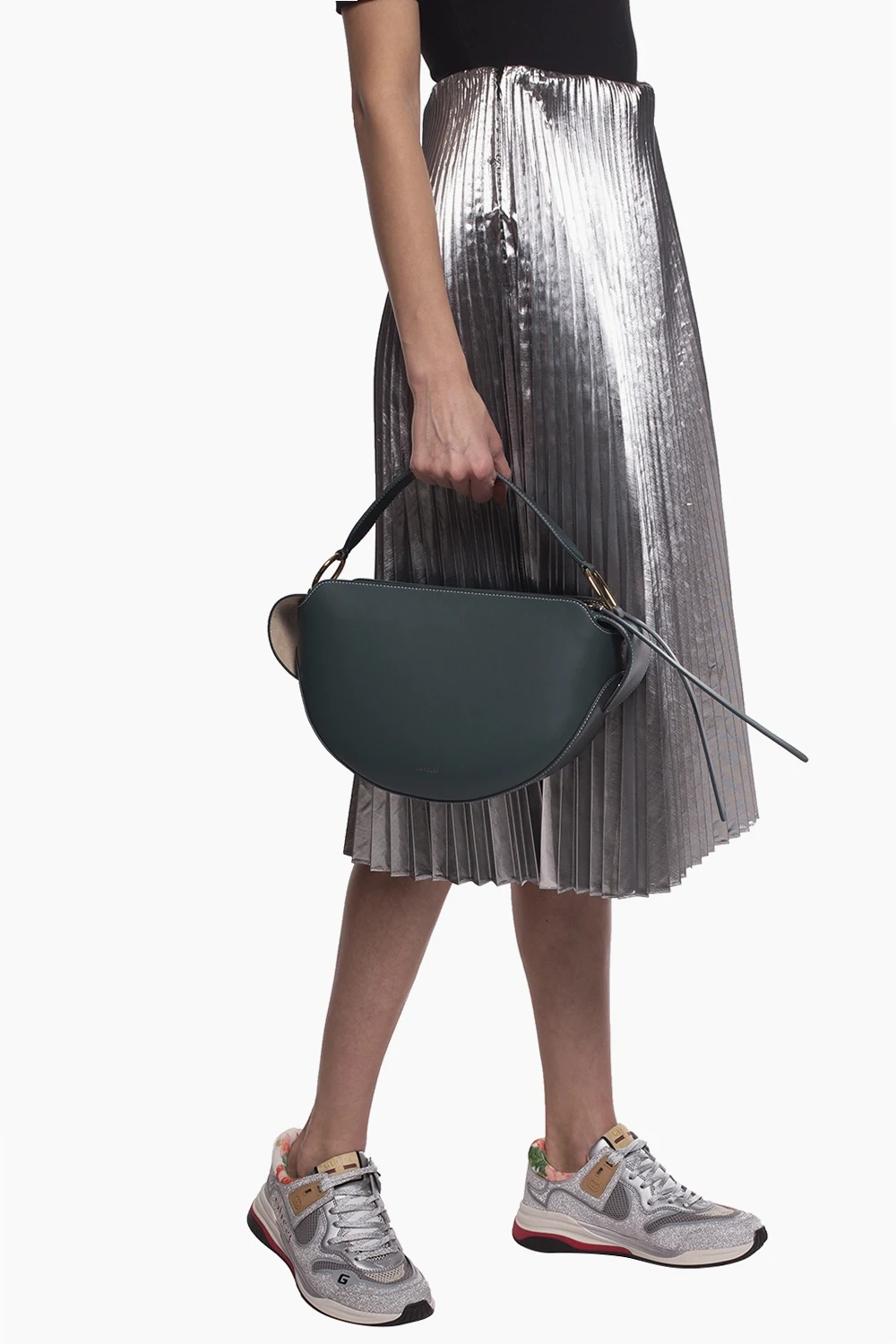 Szara torba na ramię, model ‘Yara’ Wandler, rozmiar 'big'. Wykonana ze skóry cielęcej i zamszu. Zamykana na zamki z frędzlami. Z przodu ozdobiona nadrukowanym logo w kolorze złotym. Z tyłu kieszeń zamykana na zamek. Odpinany pasek na ramię. Wewnątrz jedna komora. Metalowe elementy w kolorze złotym.