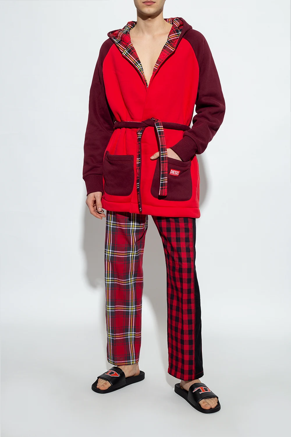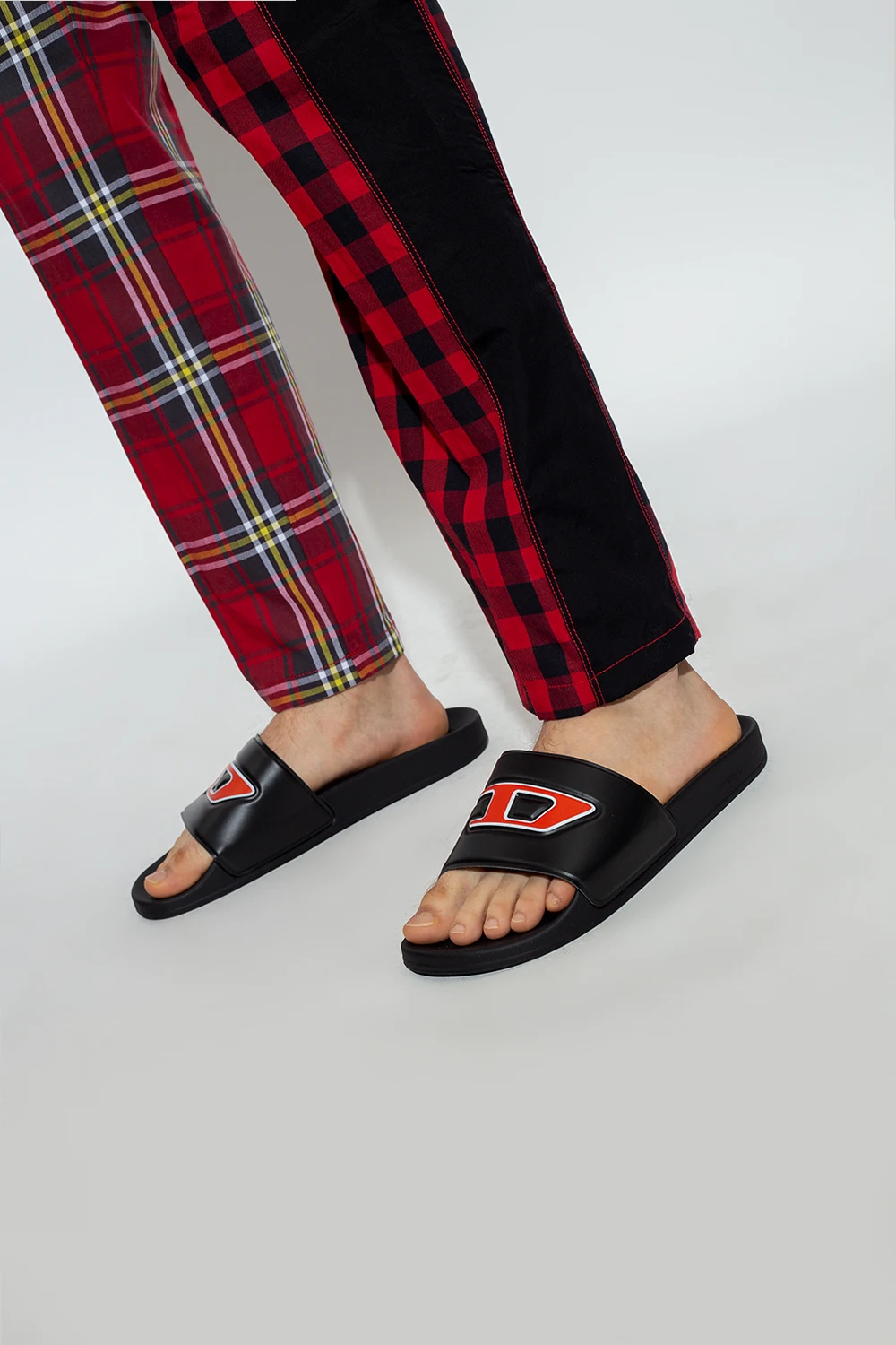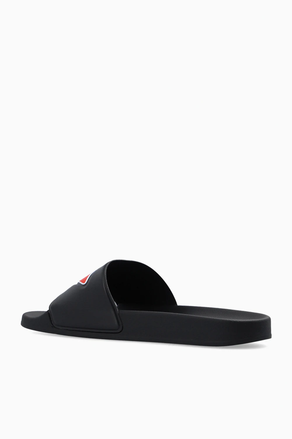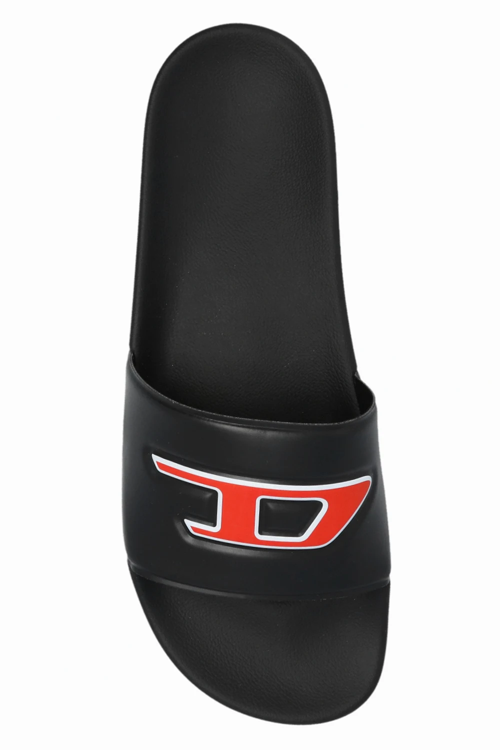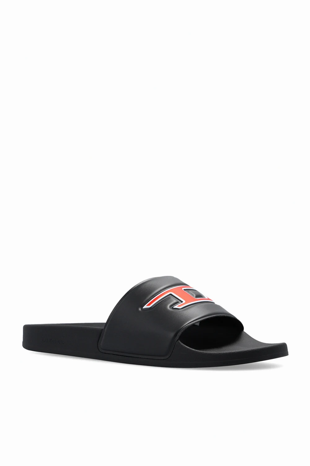 Czarne klapki, model 'SA-MAYEMI' Diesel. Z przodu ozdobione wypukłym logo w kolorze czerwono-białym. Czarna, gumowa podeszwa.