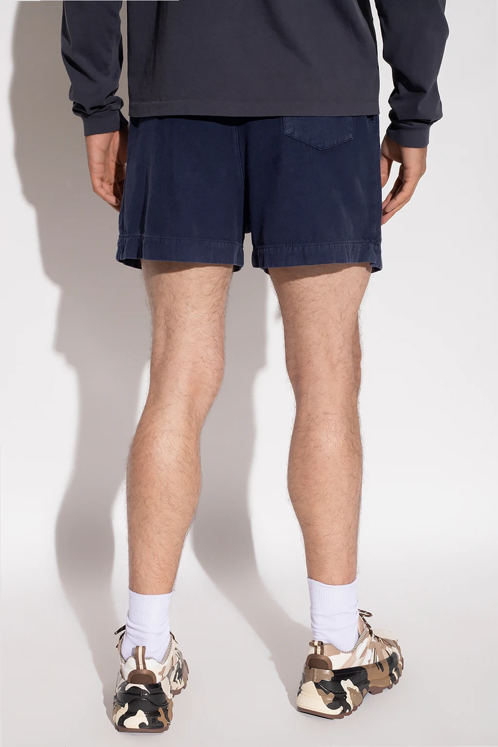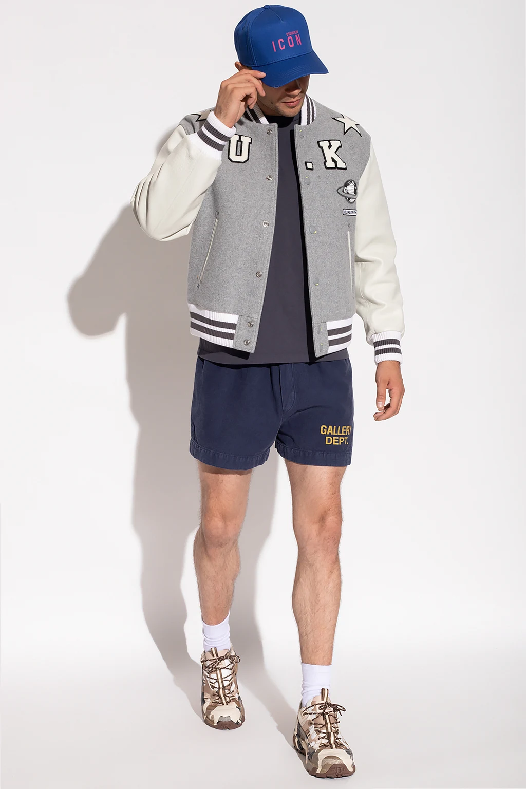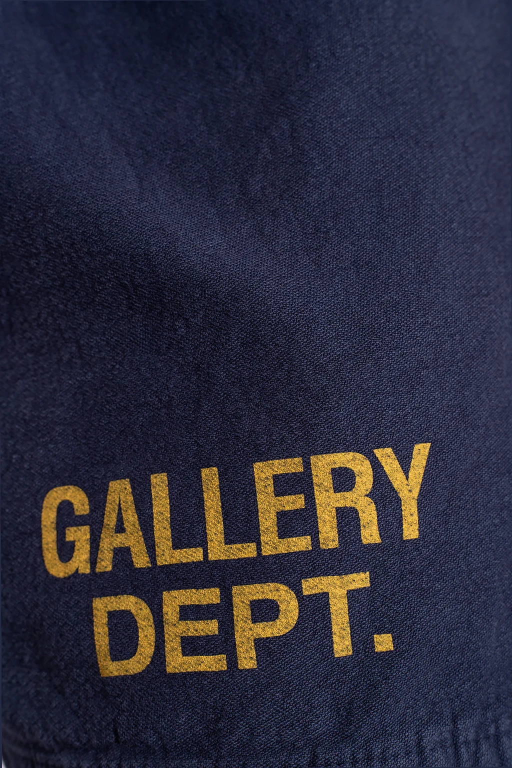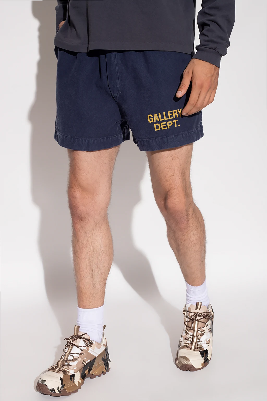 Granatowe szorty GALLERY DEPT. Wykonane z bawełny. W pasie wszyta guma ściągana trokami. Ozdobione żółtym nadrukiem z logo. Trzy wsuwane kieszenie.