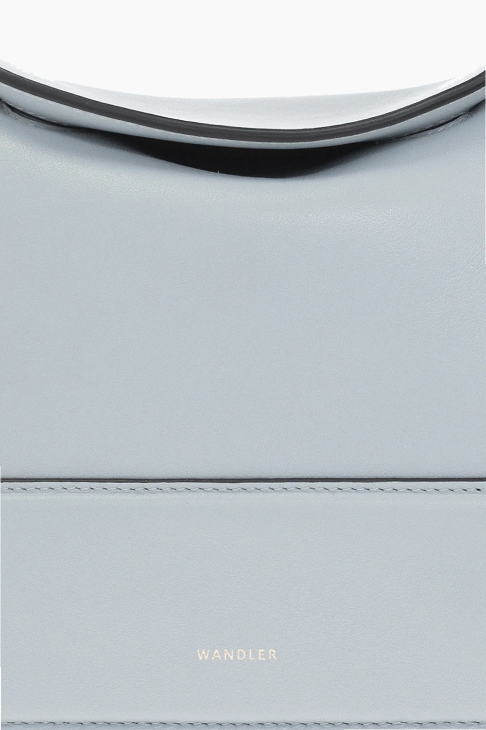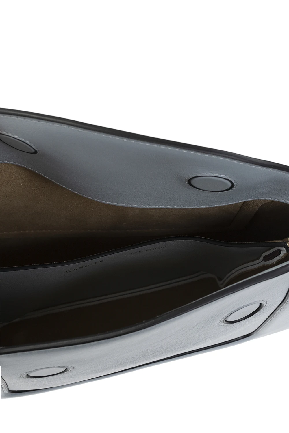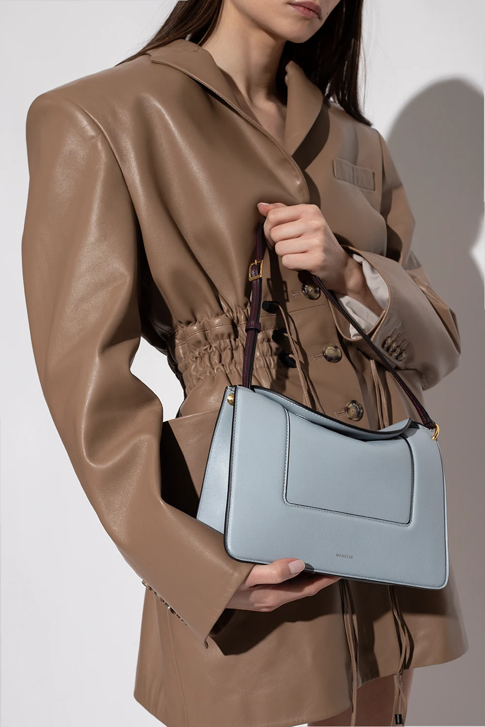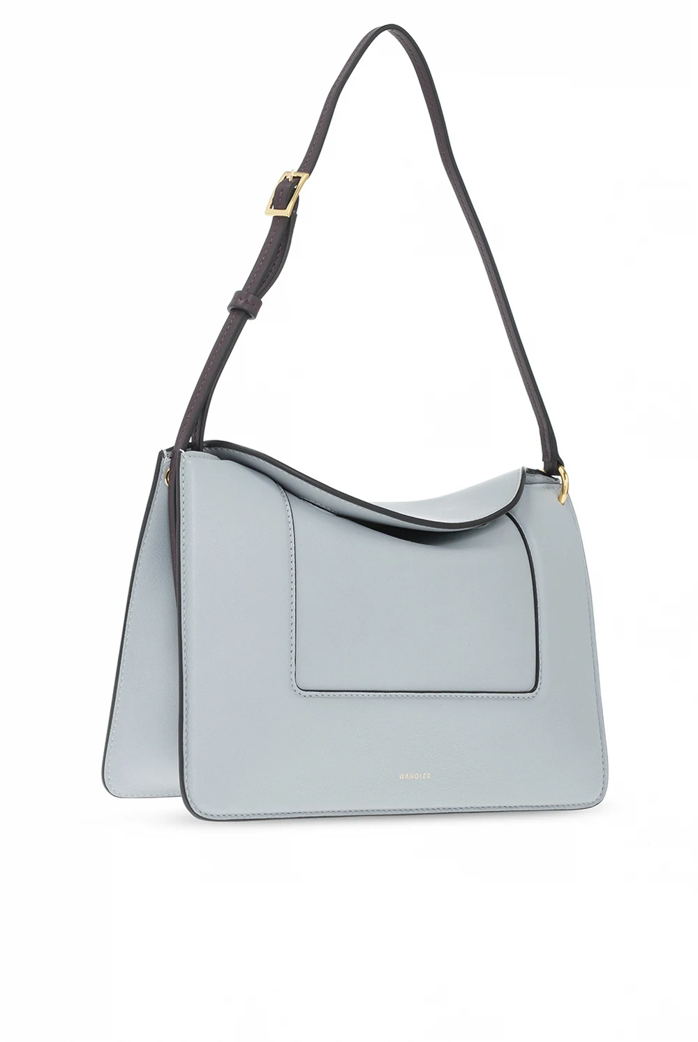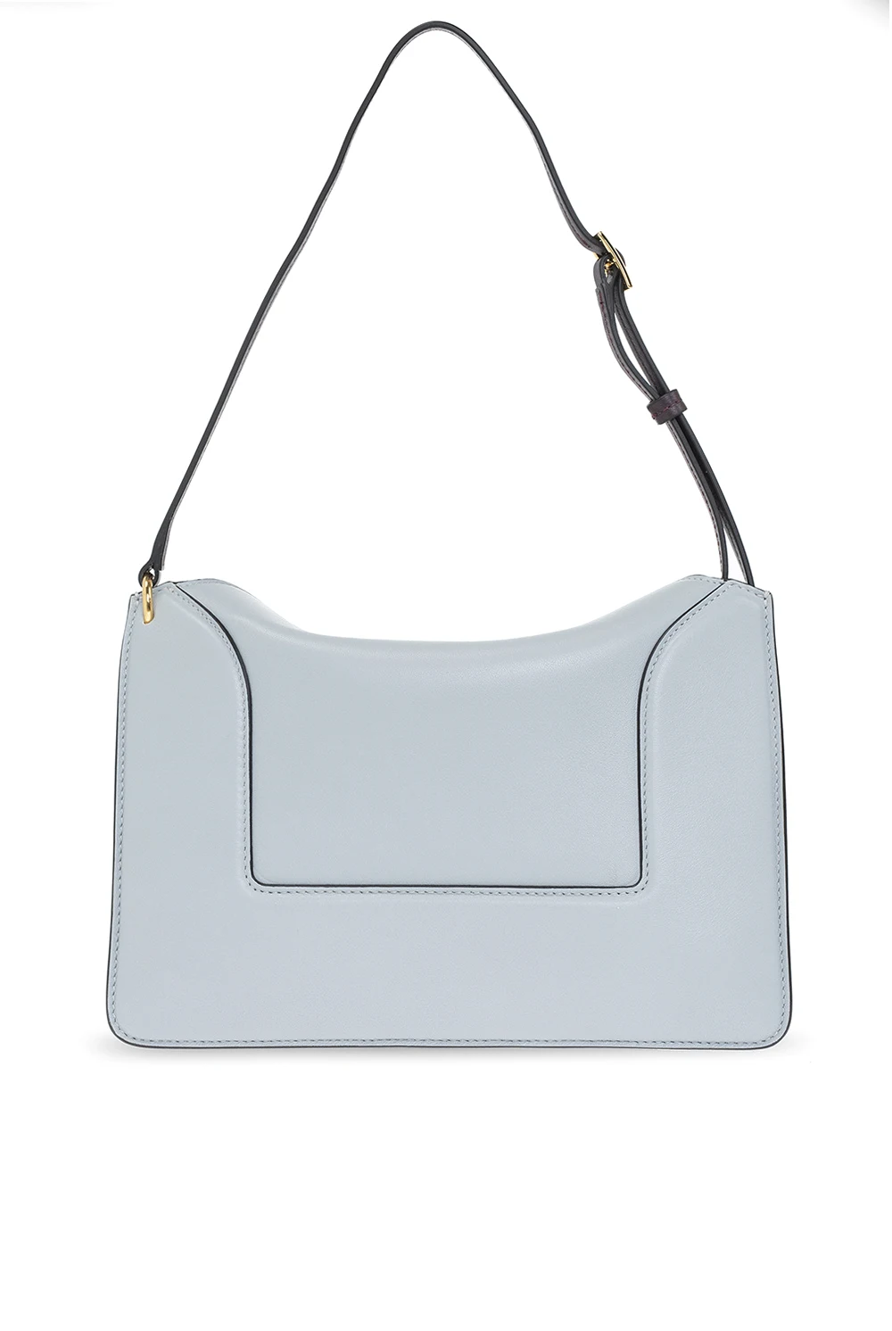 Niebieskoszara torba na ramię, model ‘Penelope’ Wandler. Wykonana ręcznie ze skóry cielęcej. Zamykana na magnetyczne zatrzaski. Z przodu nadrukowane logo w kolorze złotym. Ciemnofioletowy pas na ramię z możliwością regulacji długości. Warstwa wewnętrzna w kolorze beżowym. Wewnątrz dwie komory. Metalowe elementy w kolorze złotym.