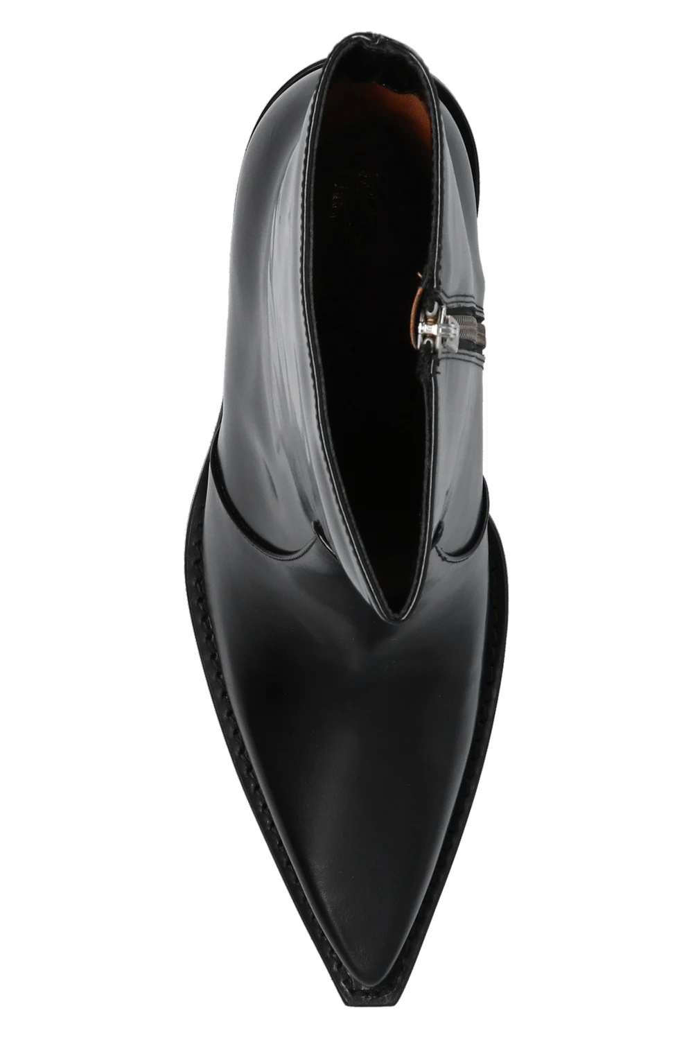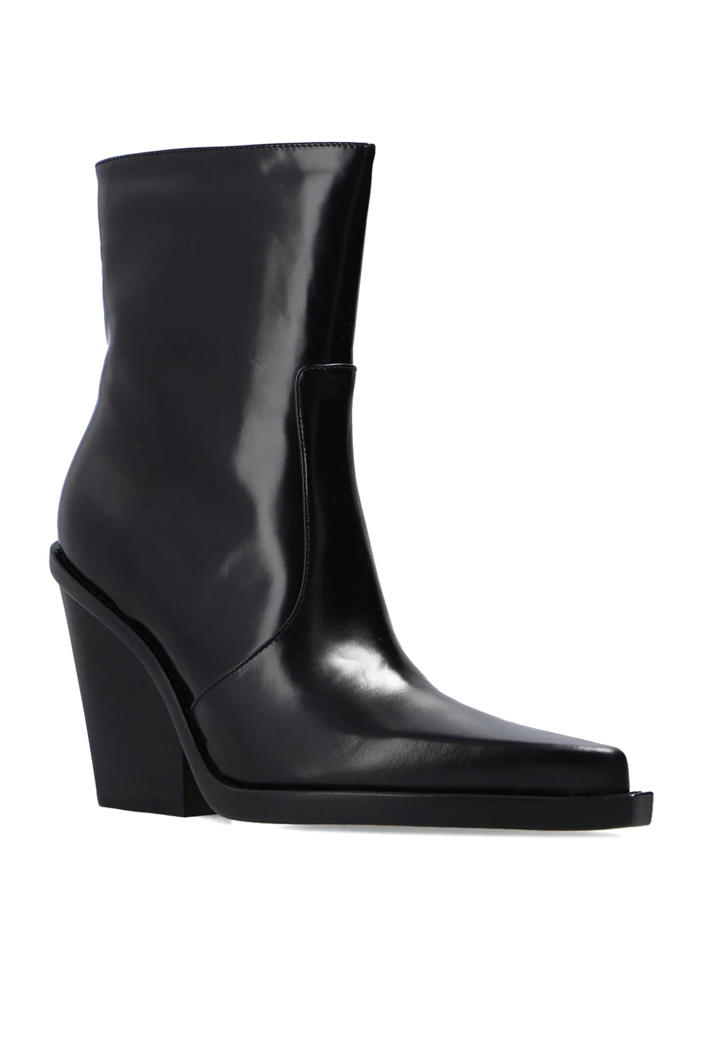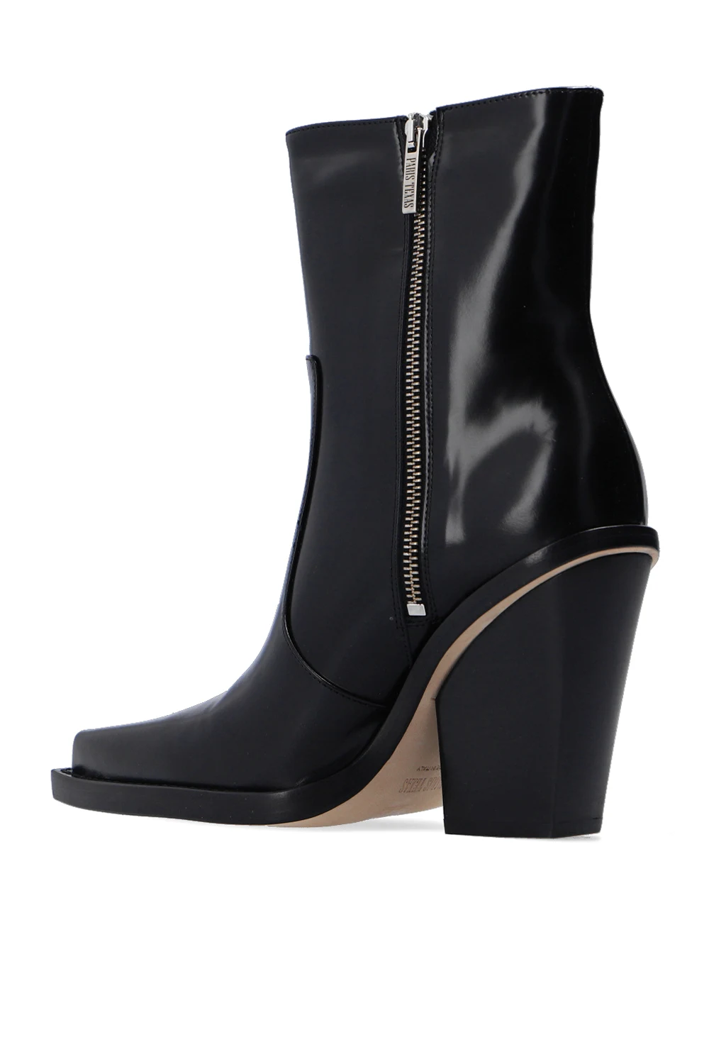 Czarne botki na obcasie, model ‘Rodeo’ Paris Texas. Wykonane z lakierowanej skóry cielęcej. Z boku zapinane na zamek. Nosek w szpic. Beżowa, skórzana podeszwa.
