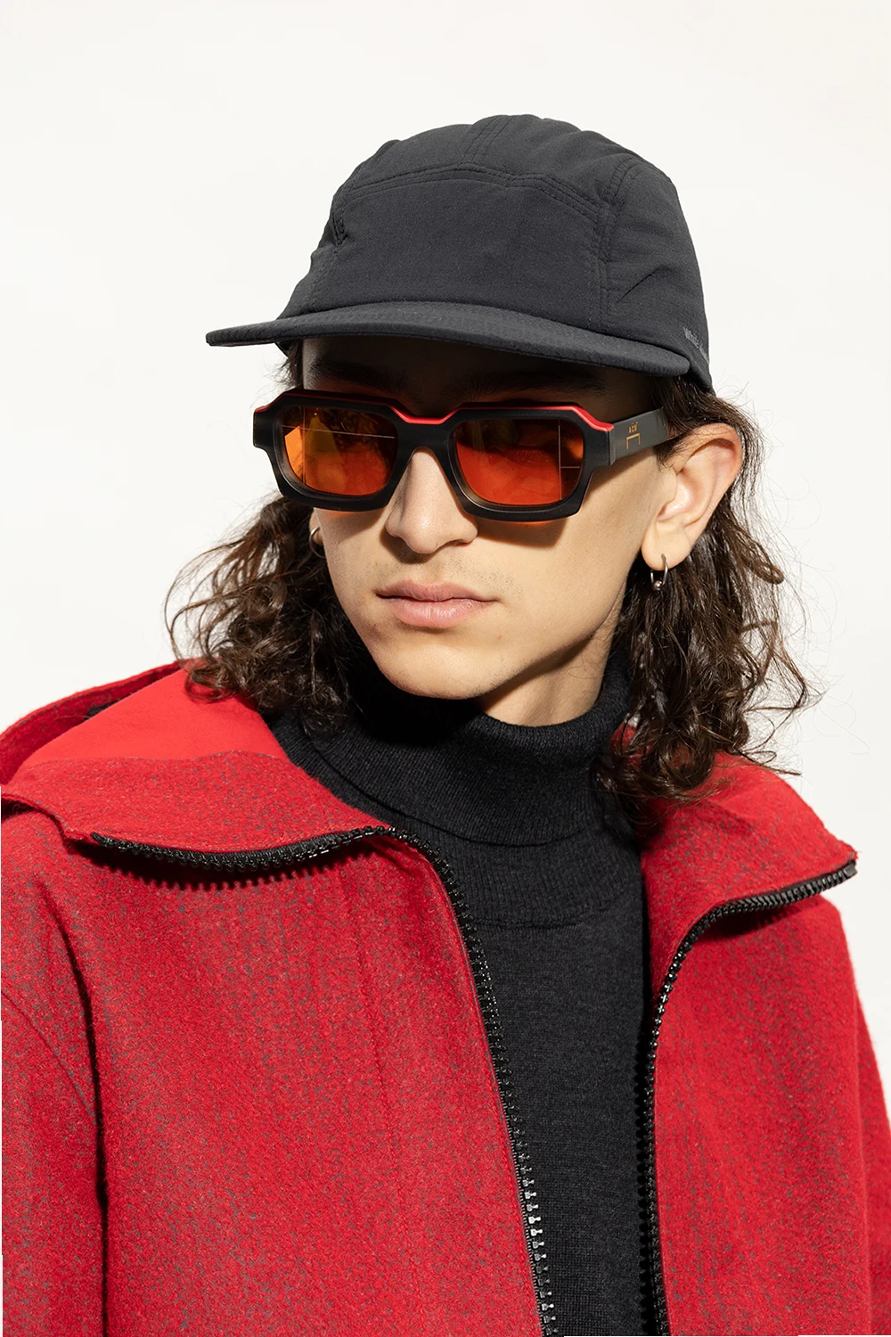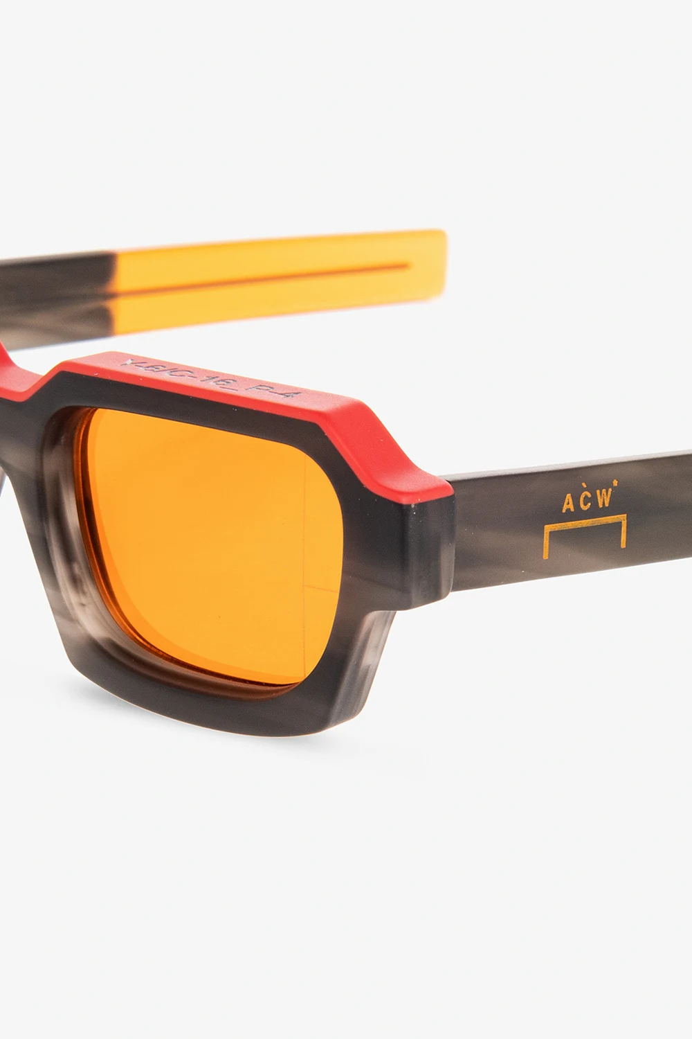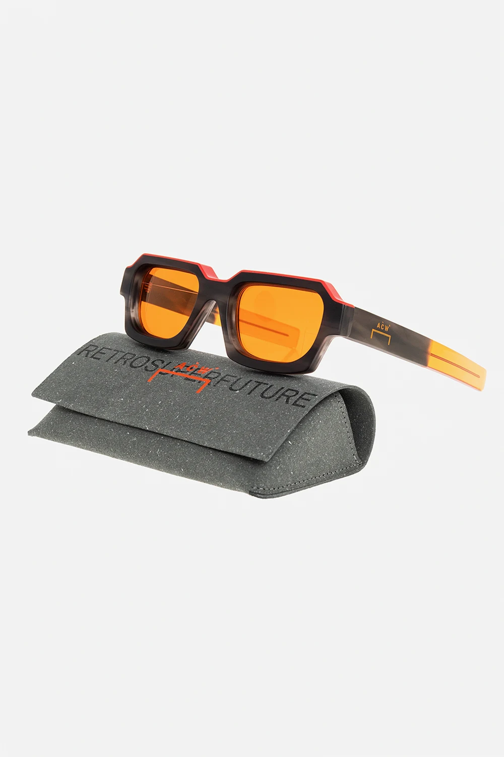 Ciemnoszaro-czerwono-pomarańczowe okulary przeciwsłoneczne, model ‘Caro’ A-COLD-WALL* x Retrosuperfuture. Częściowo wykonane z włoskiego acetatu. Prostokątne oprawki. Dekoracyjny wzór imitujący marmur. Ozdobione wytłoczonym wzorem z logo. Wykończone laserowo wytrawionym systemem kodowania ACW*. Pomarańczowe szkła ze 100% ochroną przed promieniowaniem UV. Dołączone etui.