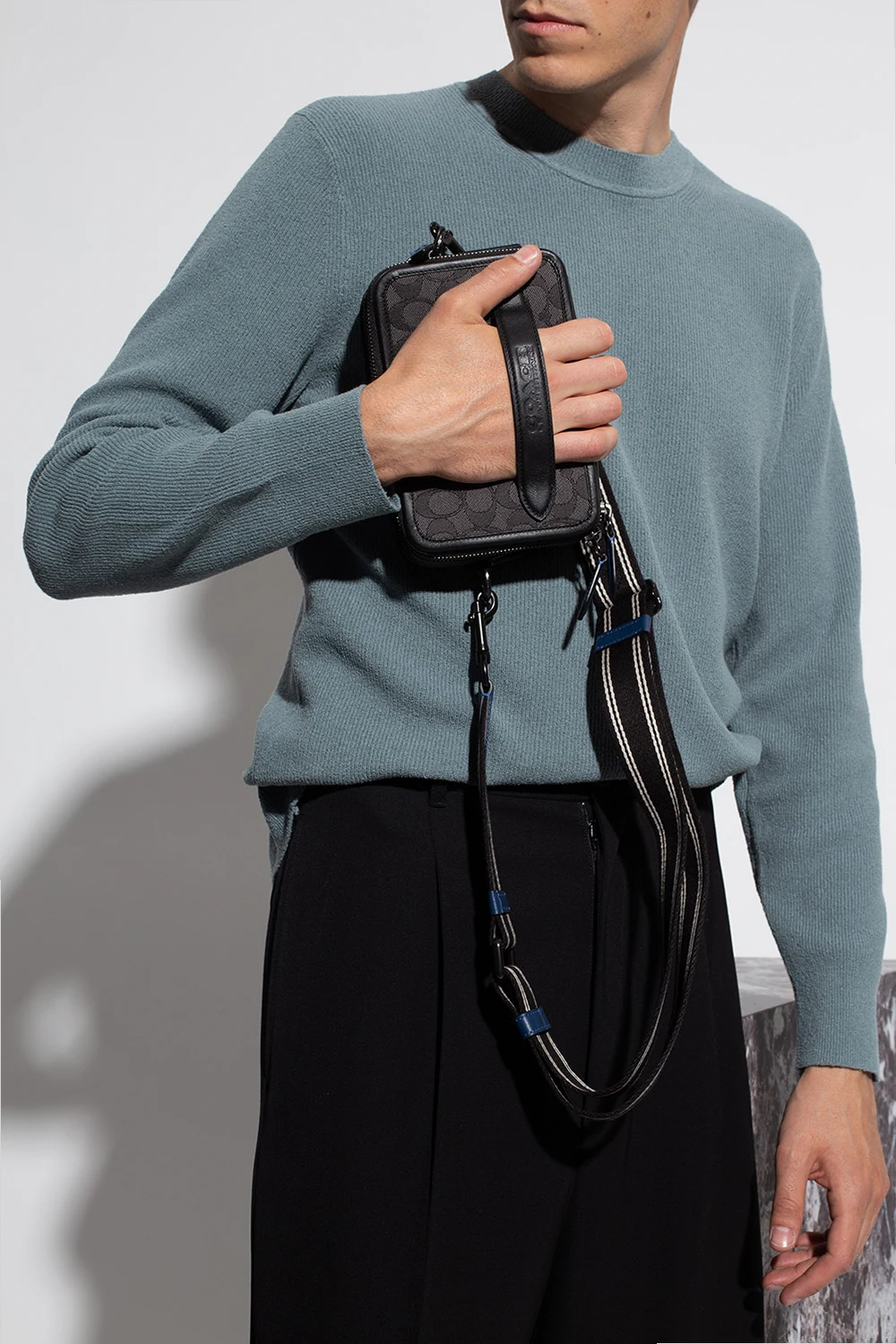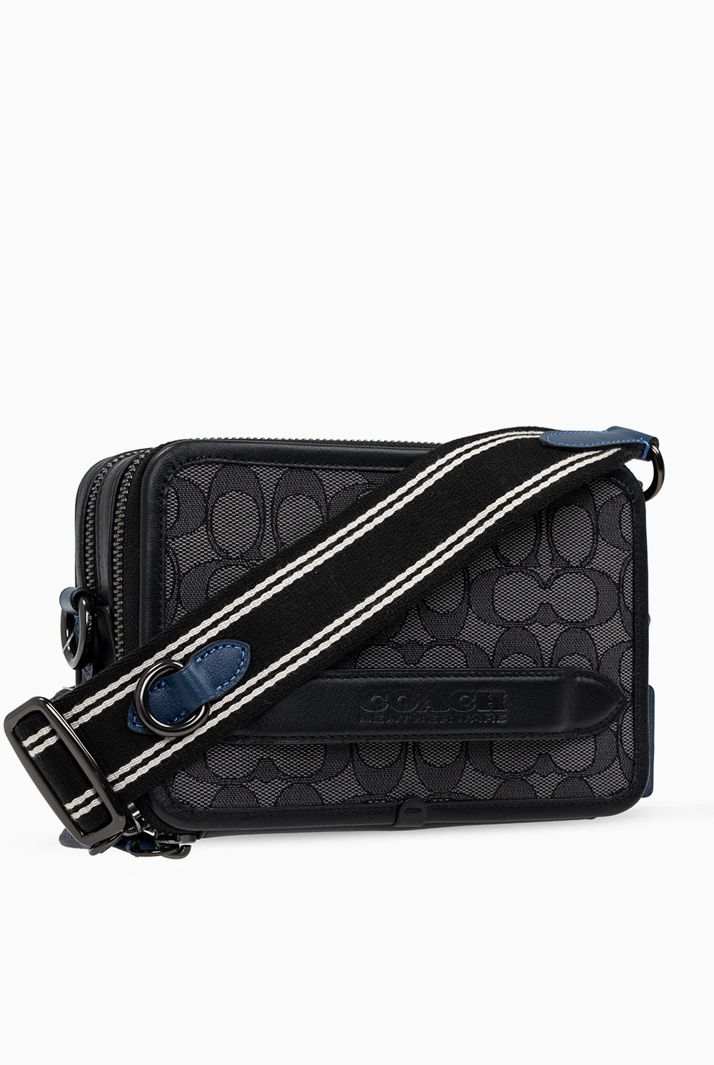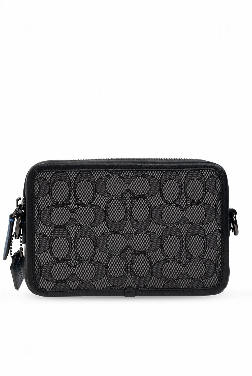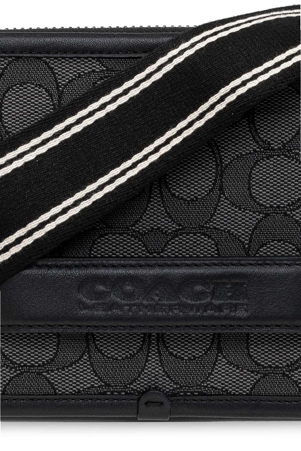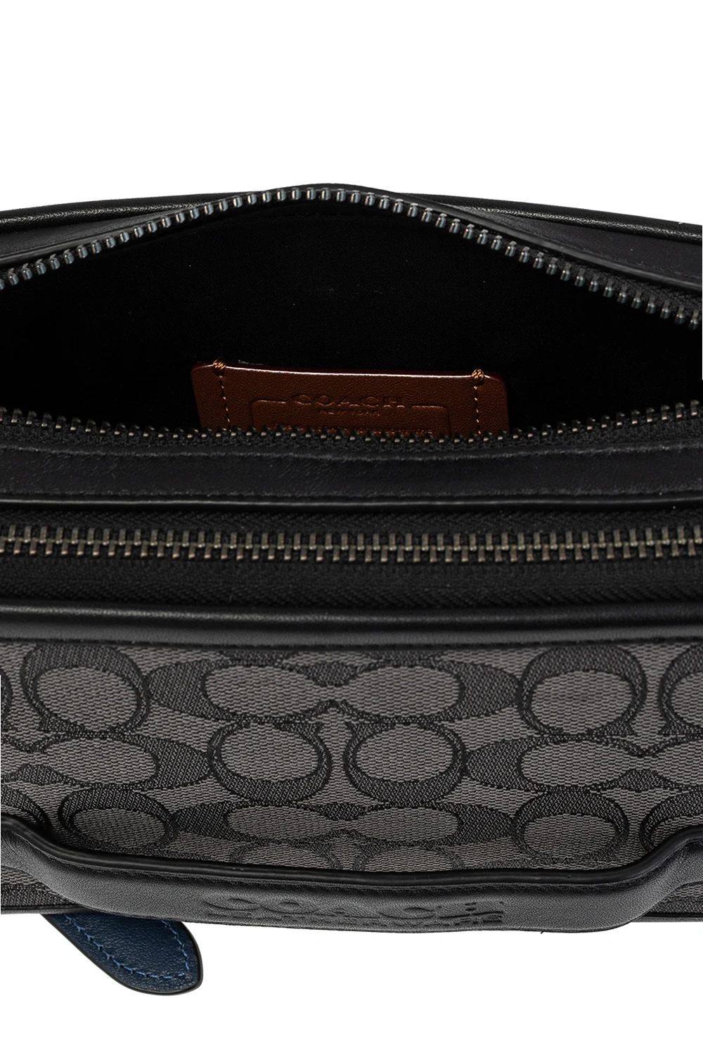 Szaro-czarna torba na ramię, model 'Charter' Coach. Wykończona skórą cielęcą. Zamykana na zamki. Ozdobiona wyszytym wzorem z logo. Półokrągła rączka. Odpinany pasek na ramię z możliwością regulacji długości. Wewnątrz dwie oddzielne komory. W jednej wsuwana kieszeń i sześć miejsc na karty.
