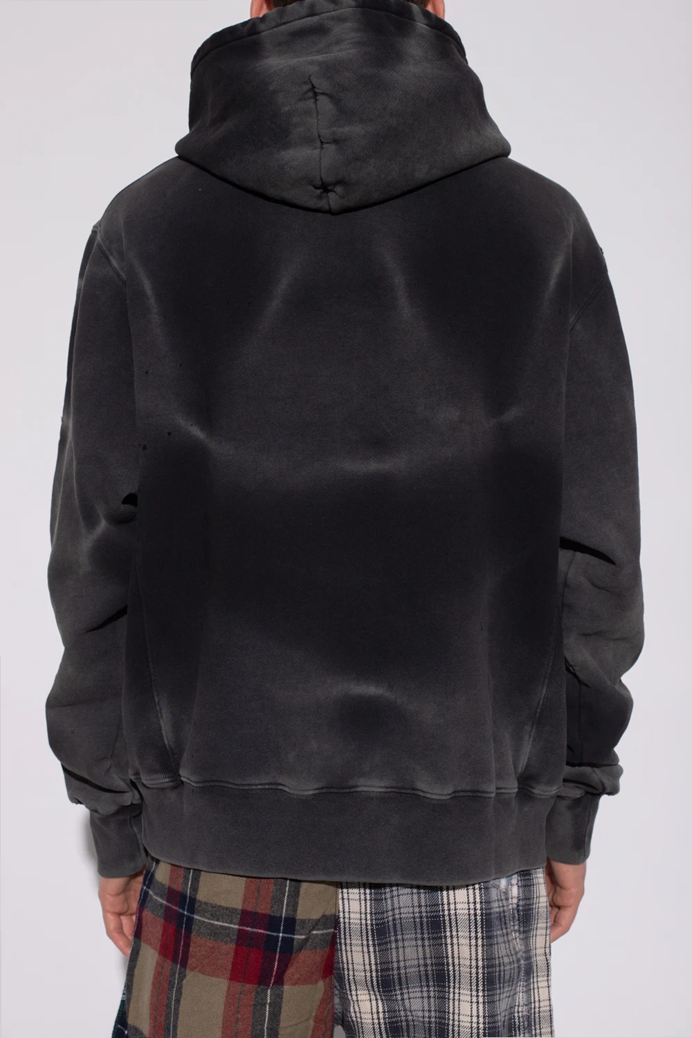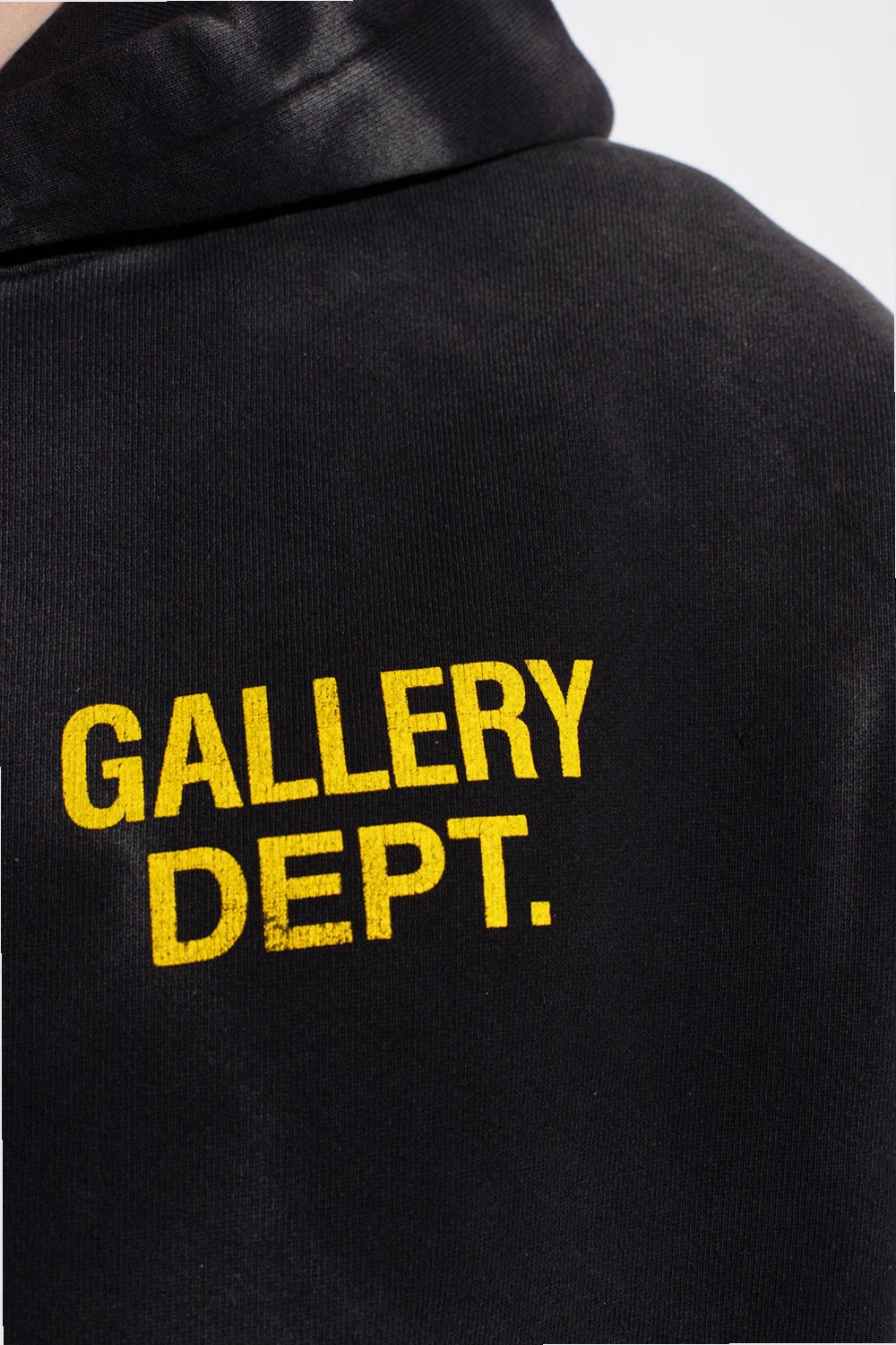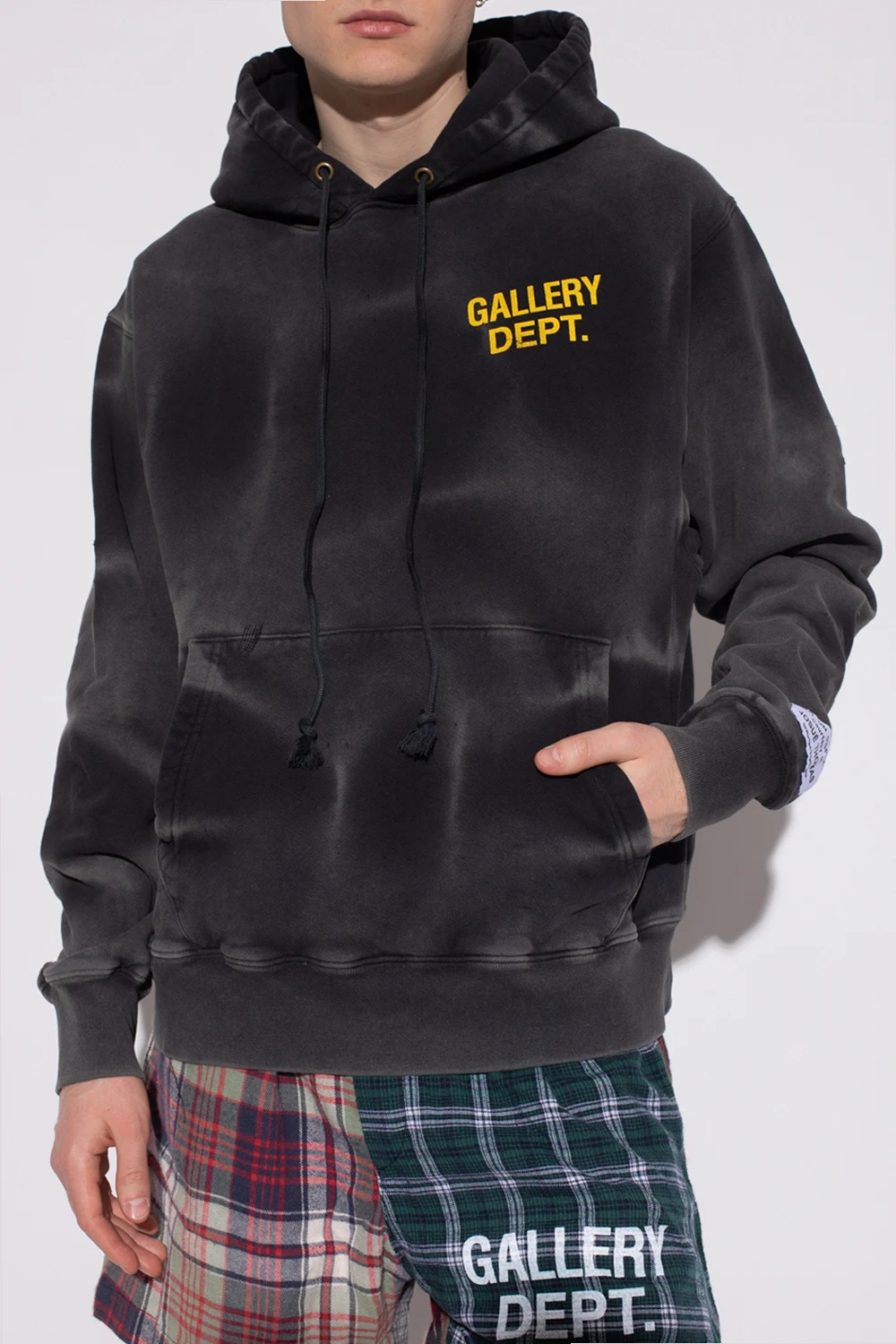 Czarna bluza z efektem ‘vintage’ GALLERY DEPT. Wykonana z bawełny. Kaptur ściągany trokami. Z przodu ozdobiona nadrukowanym logo w kolorze żółtym. Wsuwana kieszeń. Na rękawie biało-czarna naszywka z logo. Długie rękawy i dół zakończone ściągaczem.