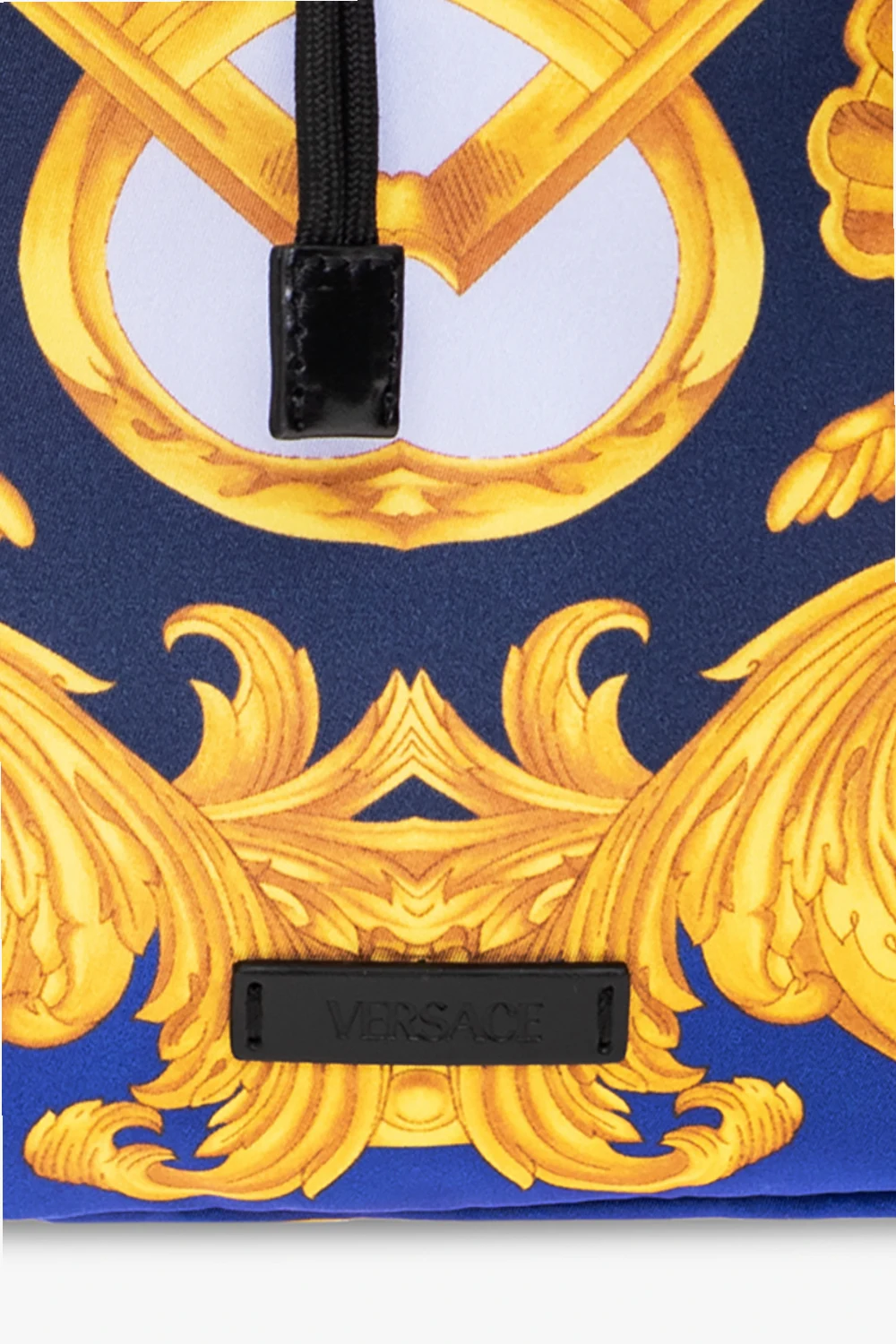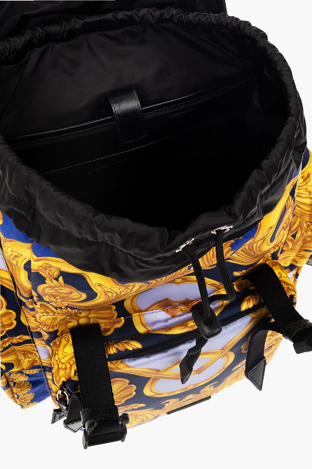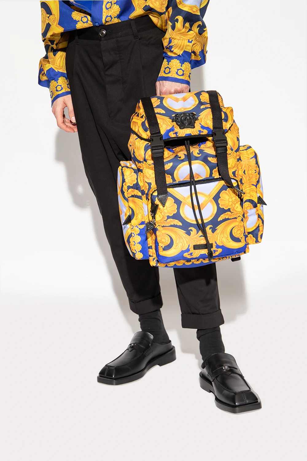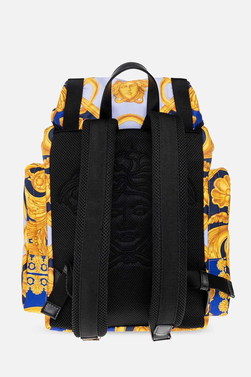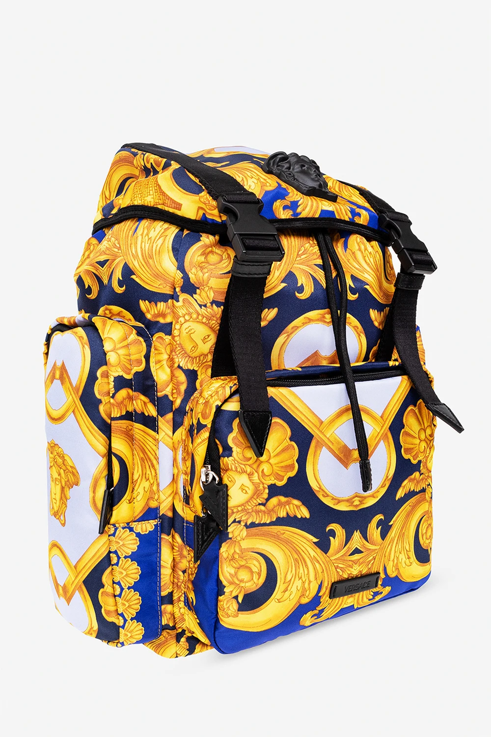 Niebiesko-granatowy plecak Versace. Wykonany z materiału. Zamykany na zatrzaski i ściągany trokami. Ozdobiony nadrukiem 'Barocco 660’ w kolorze żółto-pomarańczowym. Z przodu naszywka z logo i charakterystyczna głowa Meduzy. Trzy kieszenie zapinane na zamek: jedna z przodu i po bokach. Półokrągła rączka. Regulowane szelki. Wewnątrz komora, kieszeń zapinana na rzep i wsuwana kieszeń.