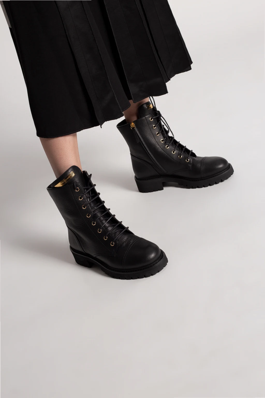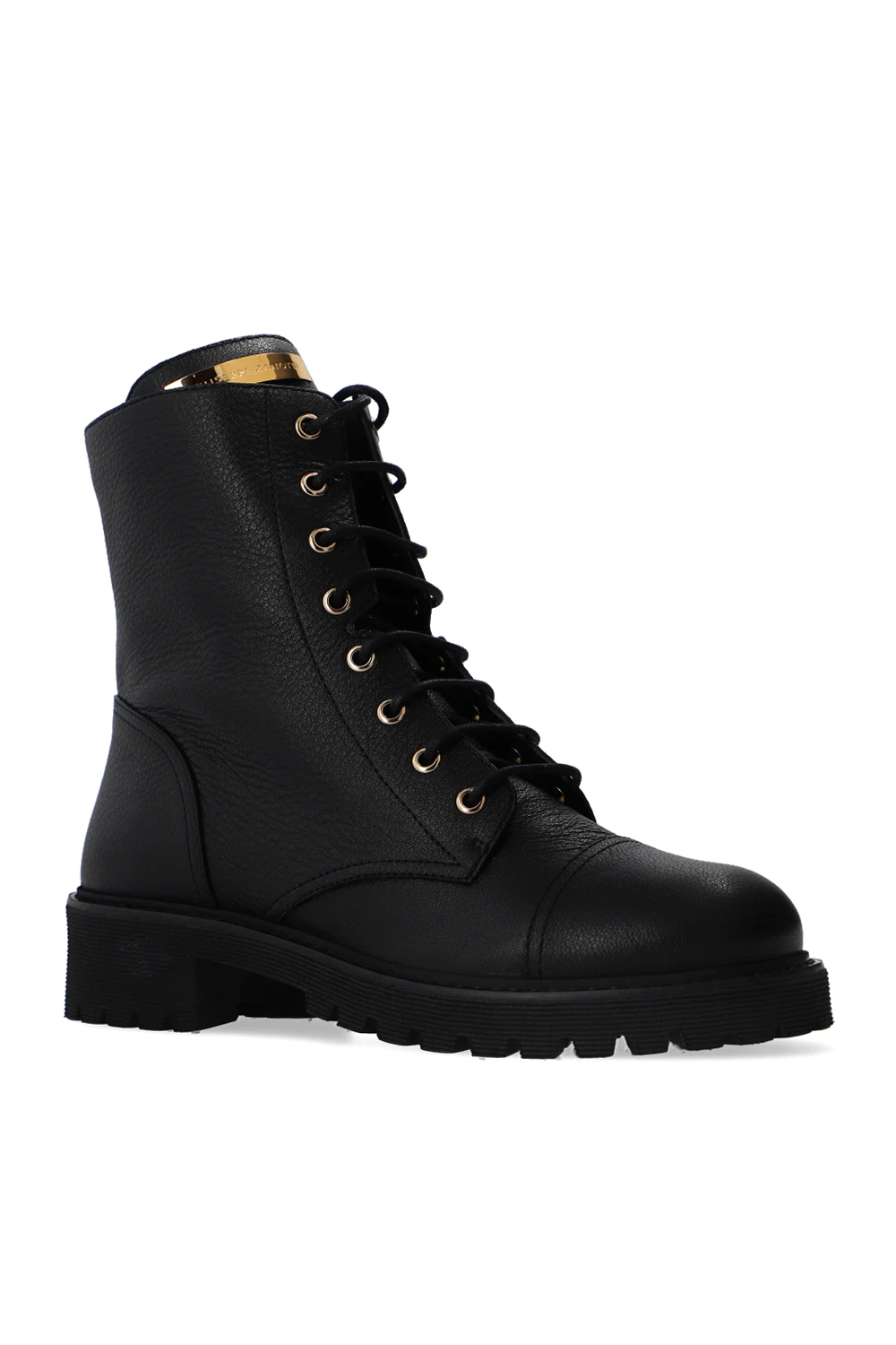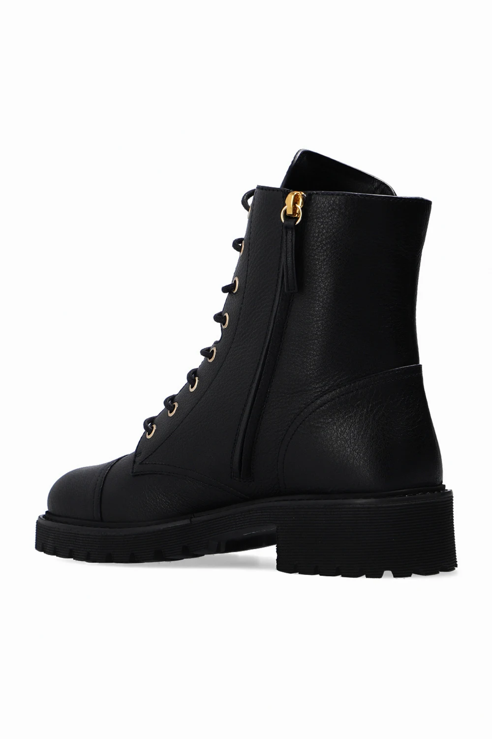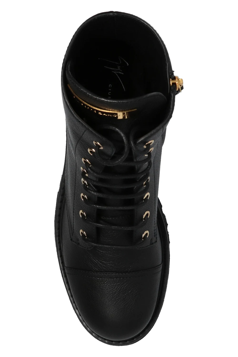 Czarne, sznurowane botki Giuseppe Zanotti. Wykonane ze skóry. Z boku zapinane na zamek. Na języku metalowa aplikacja z wytłoczonym logo. Czarna, gumowa podeszwa. Metalowe elementy w kolorze złotym.