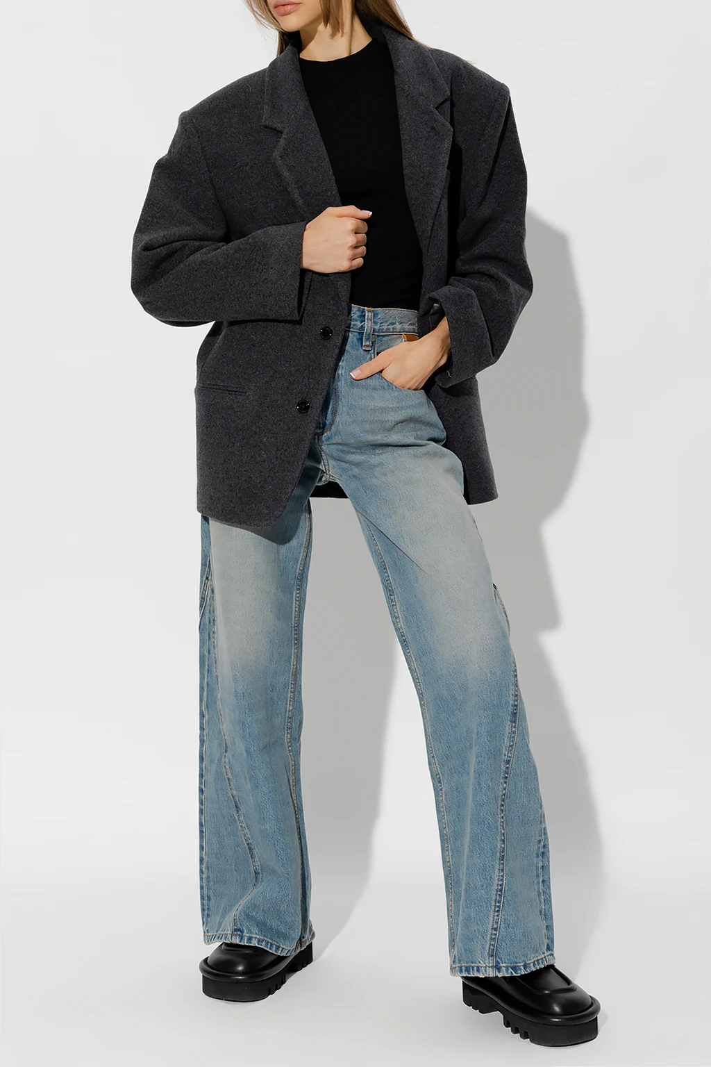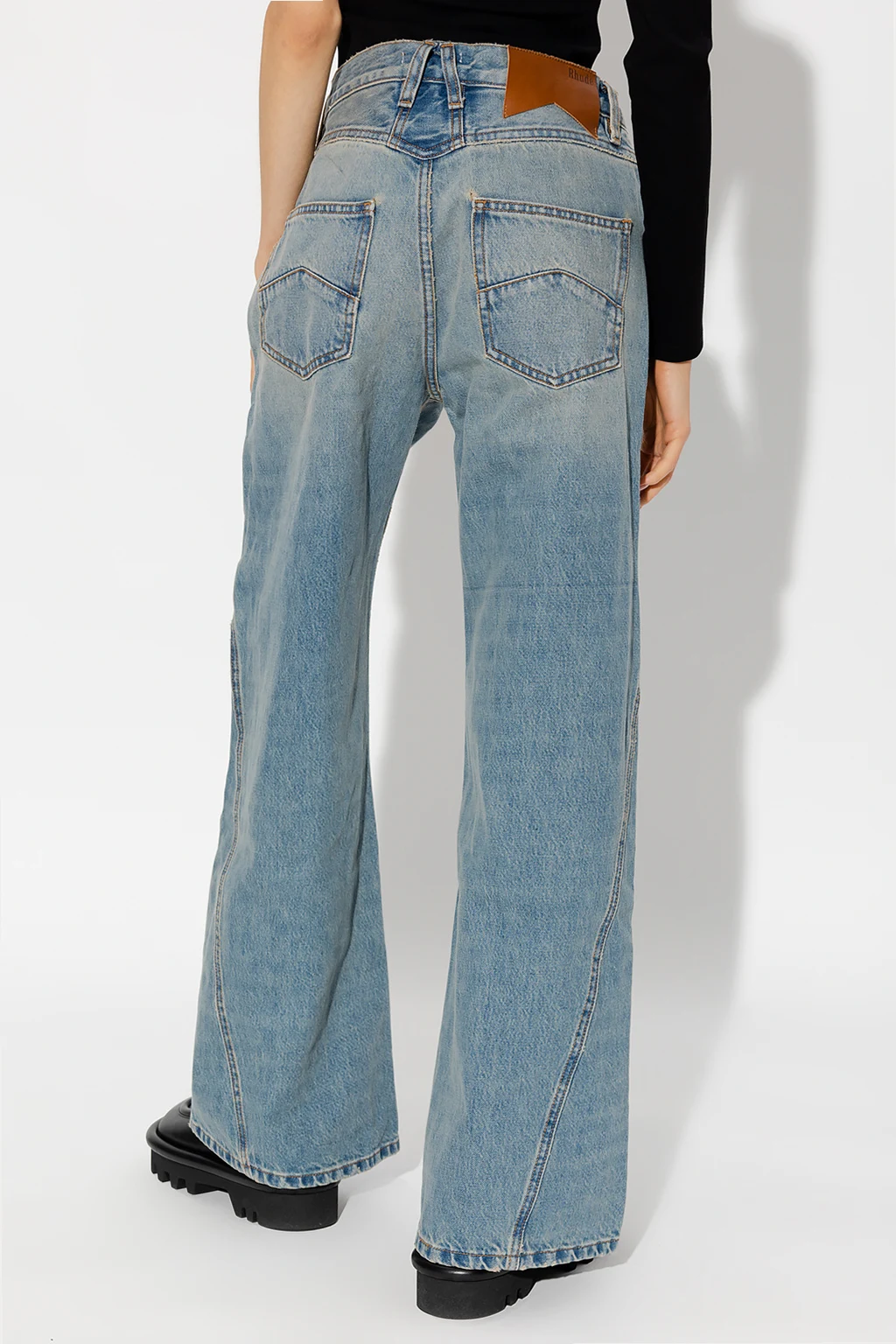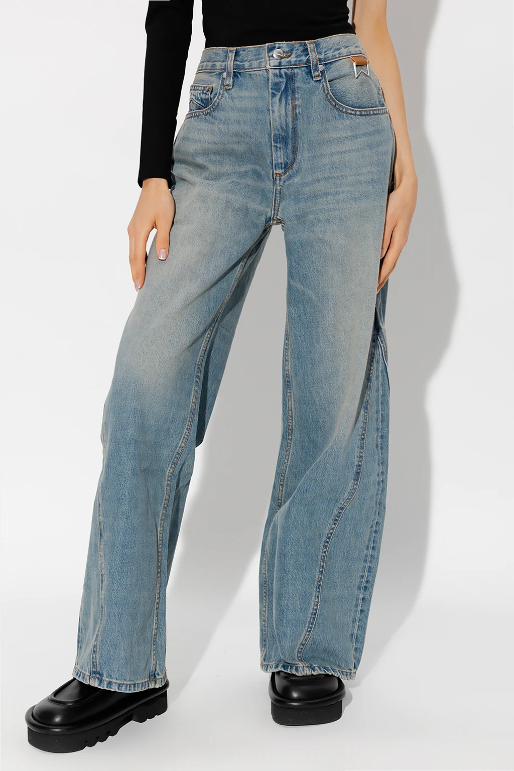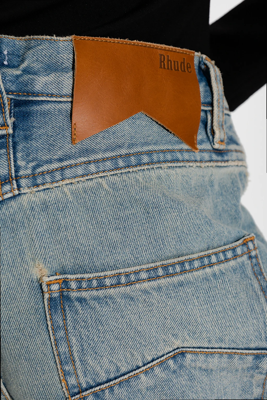Niebieskie jeansy Rhude. Zapinane na zamek i guzik. Metalowe aplikacje w kolorze srebrnym. Pięć kieszeni: trzy z przodu i dwie wsuwane z tyłu. Szerokie nogawki o prostym kroju z przeszyciami.