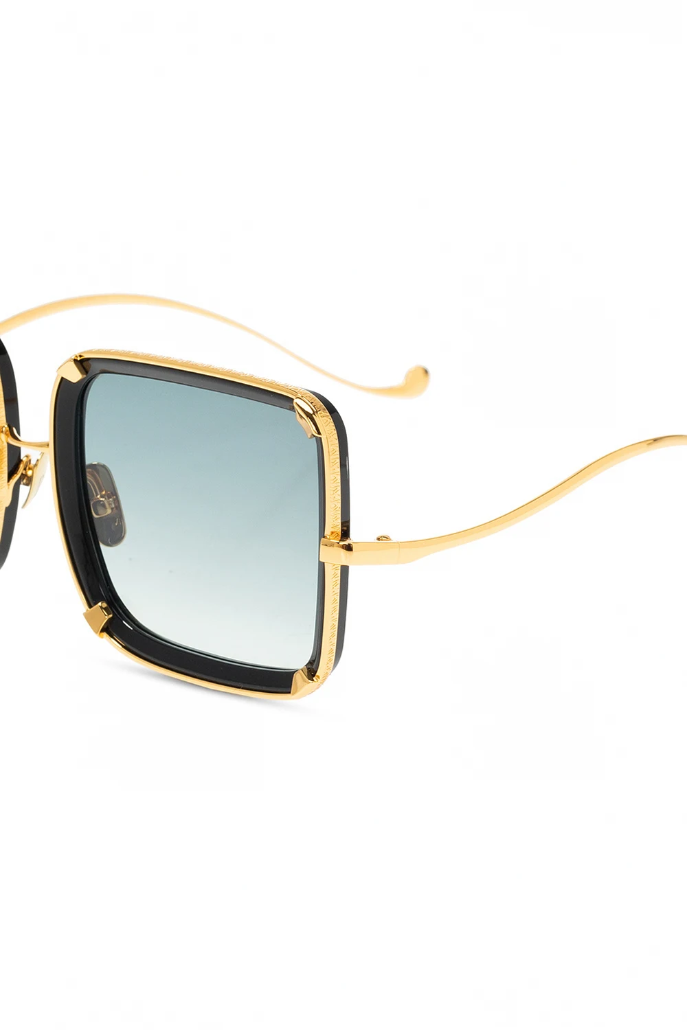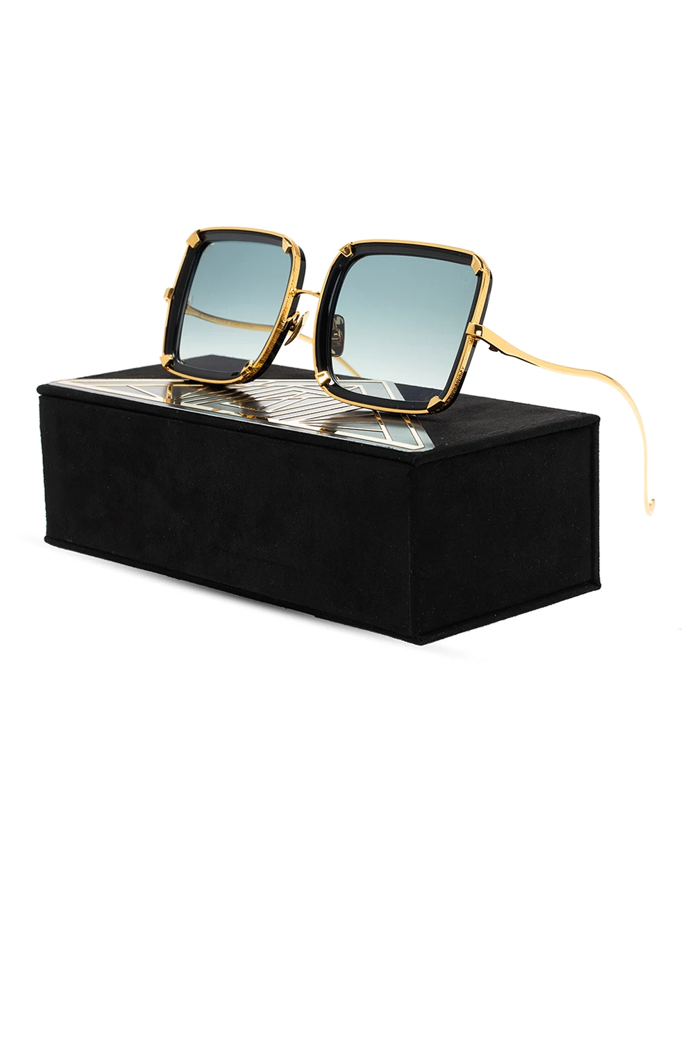 Okulary przeciwsłoneczne w kolorze czarno-złotym, model ‘White Moon’ Anna Karin Karlsson. Pokryte 24-karatowym złotem. Ozdobione nadrukowanym logo. Czarno-szare, certyfikowane soczewki UVA/UVB. Dołączone etui.
