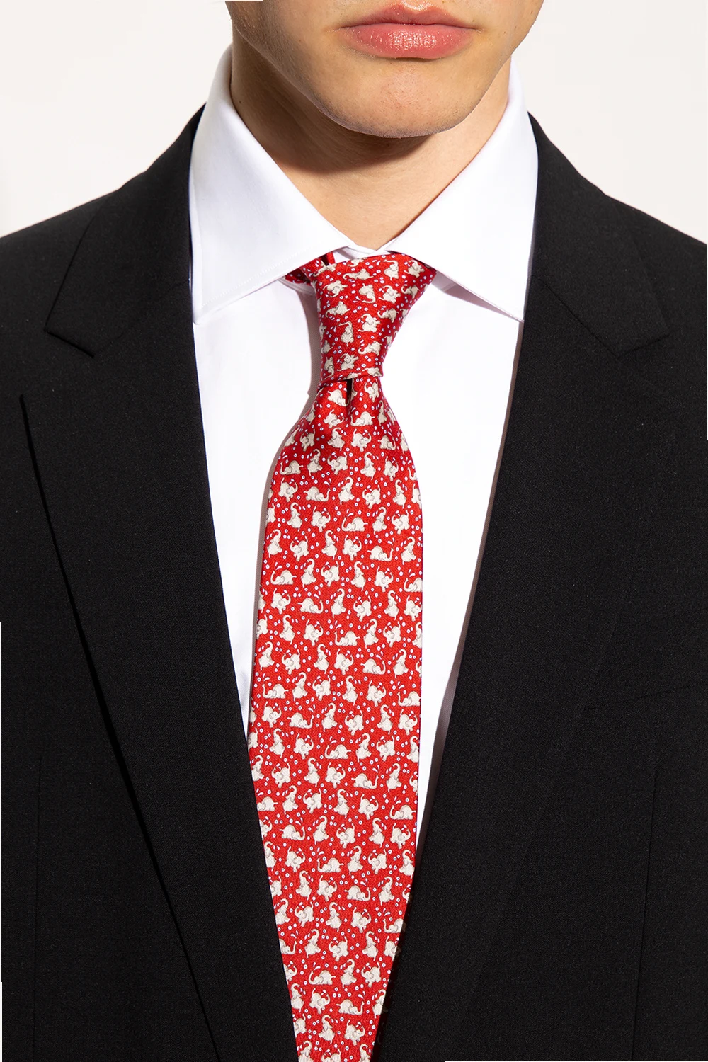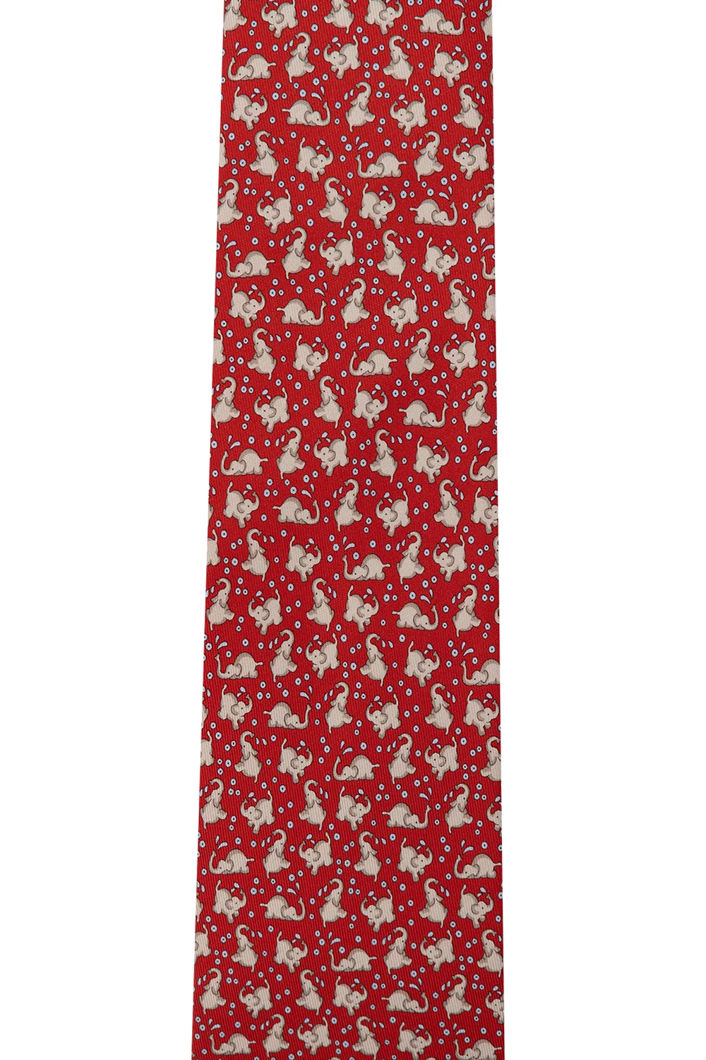 Czerwony, jedwabny krawat Salvatore Ferragamo. Ozdobiony wyszytym beżowo-niebieskim wzorem z motywem słonia.