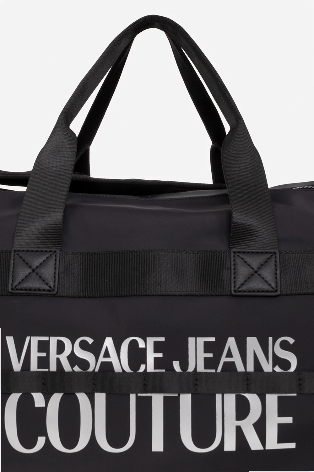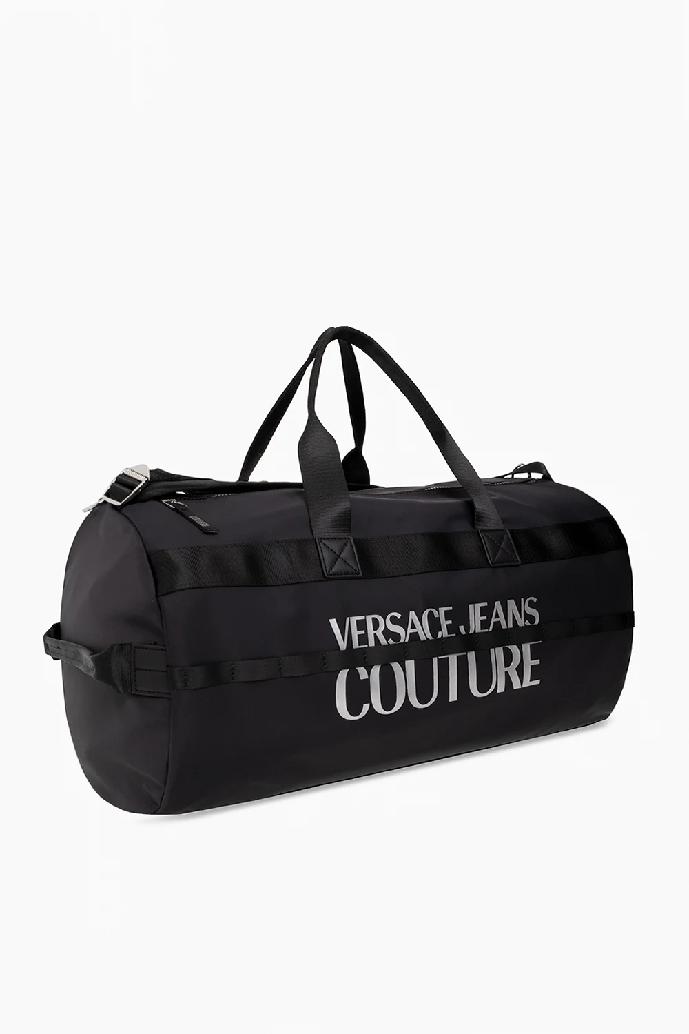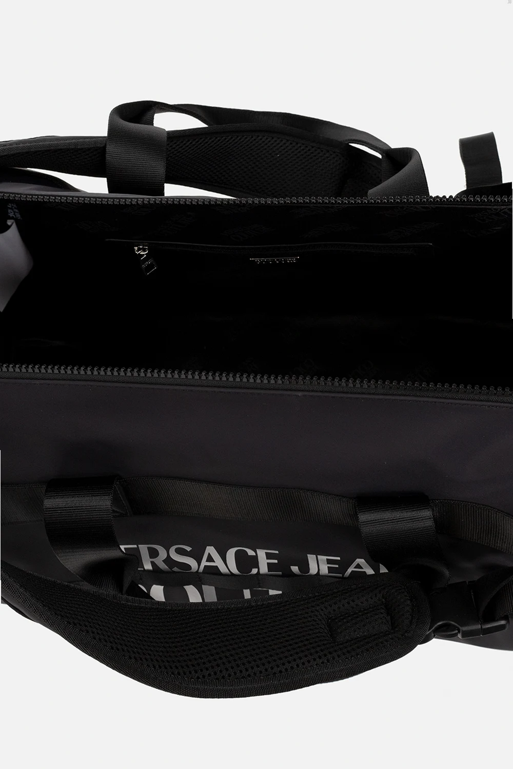 Czarna torba podróżna Versace Jeans Couture. Zamykana na rzep oraz dwa zamki. Z przodu ozdobiona nadrukowanym logo w kolorze srebrnym. Dwie półokrągłe rączki, na górze krótki uchwyt. Dwie regulowane szelki-możliwość noszenia jako plecak. Odpinany pas na ramię z możliwością regulacji długości. Wewnątrz komora z trzema kieszeniami: dwie wsuwane oraz zamykana na zamek. Metalowe wykończenie w kolorze srebrnym.