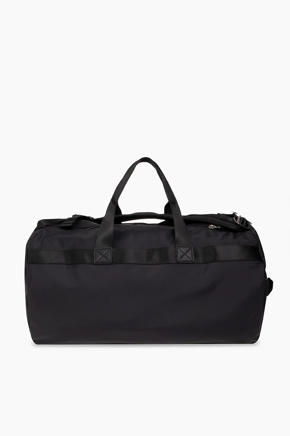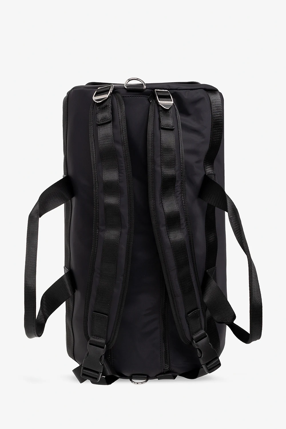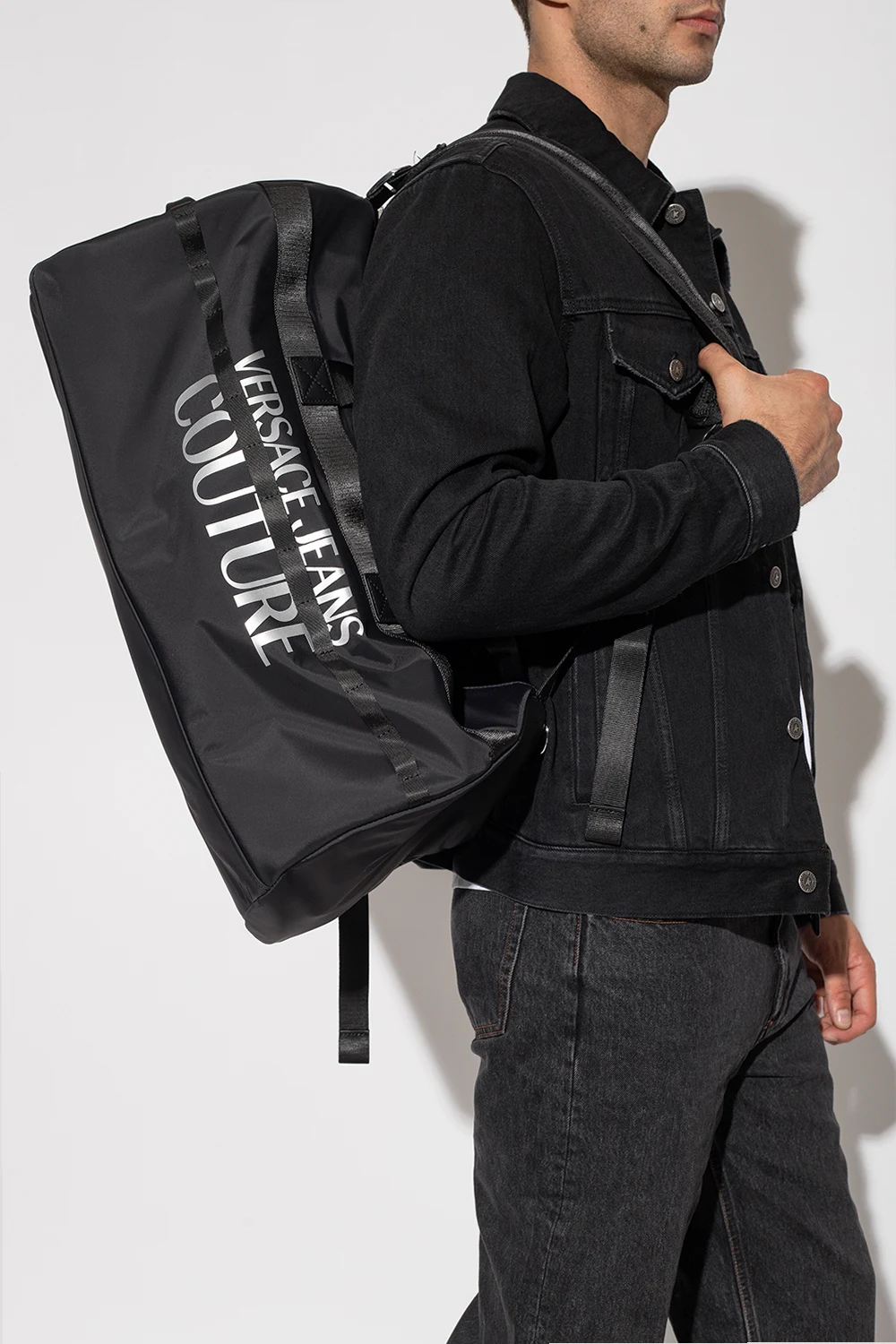 Czarna torba podróżna Versace Jeans Couture. Zamykana na rzep oraz dwa zamki. Z przodu ozdobiona nadrukowanym logo w kolorze srebrnym. Dwie półokrągłe rączki, na górze krótki uchwyt. Dwie regulowane szelki-możliwość noszenia jako plecak. Odpinany pas na ramię z możliwością regulacji długości. Wewnątrz komora z trzema kieszeniami: dwie wsuwane oraz zamykana na zamek. Metalowe wykończenie w kolorze srebrnym.