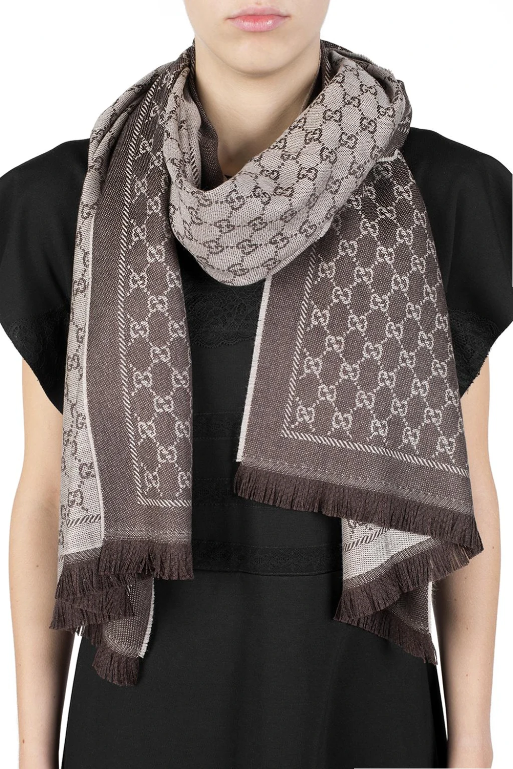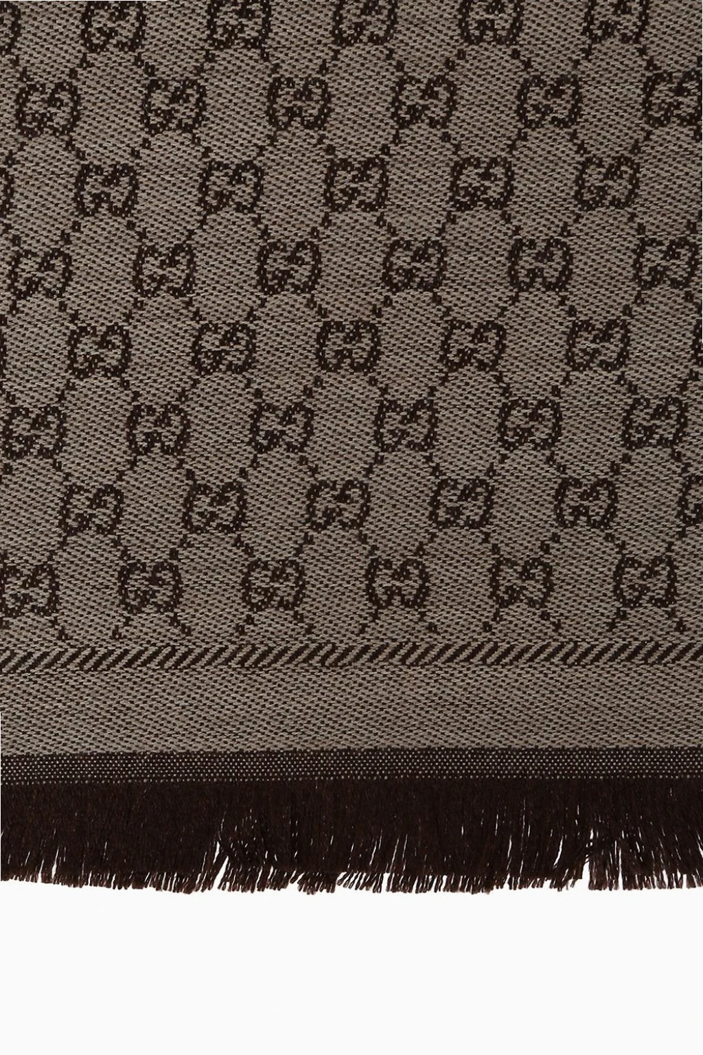 Beżowo-brązowy, wełniany szal Gucci ze wzorem 'GG Original'. Surowo wykończone brzegi.