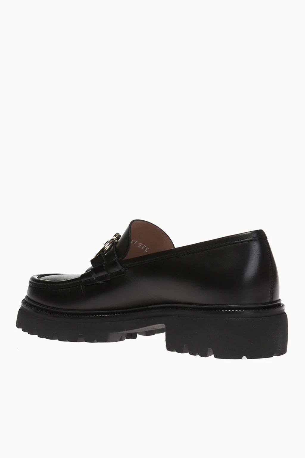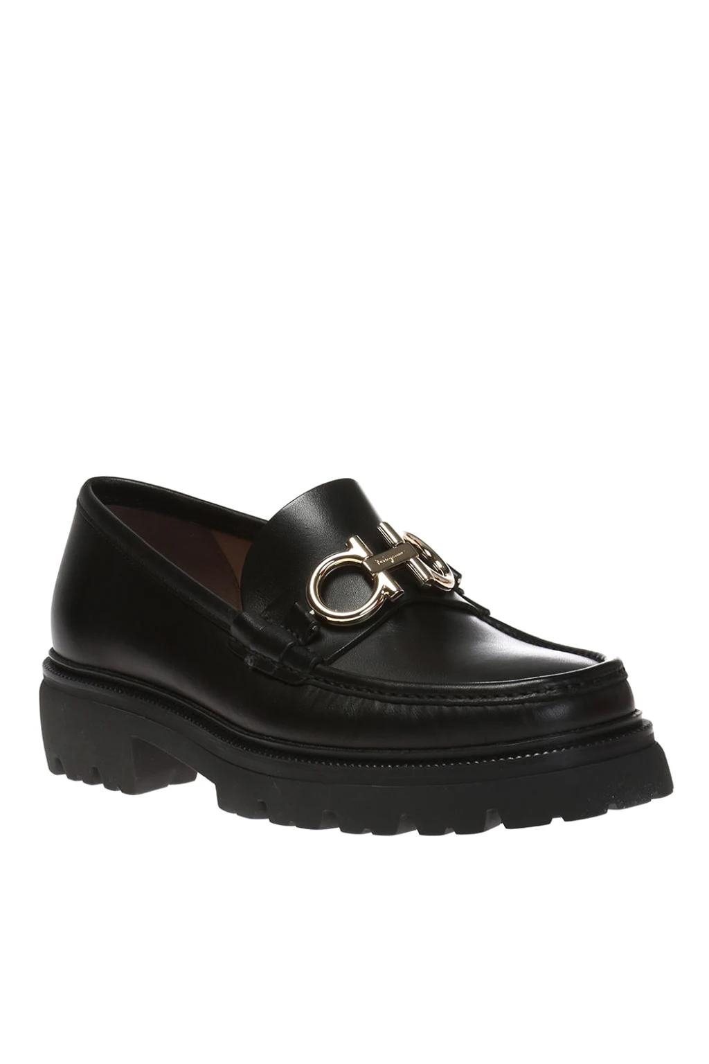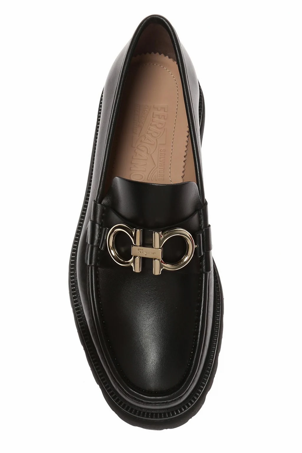 Czarne mokasyny, model 'Bleecker' Salvatore Ferragamo. Wykonane z cielęcej skóry. Ozdobione metalowym elementem w kształcie logo w kolorze złotym. Czarna, gumowa podeszwa.
