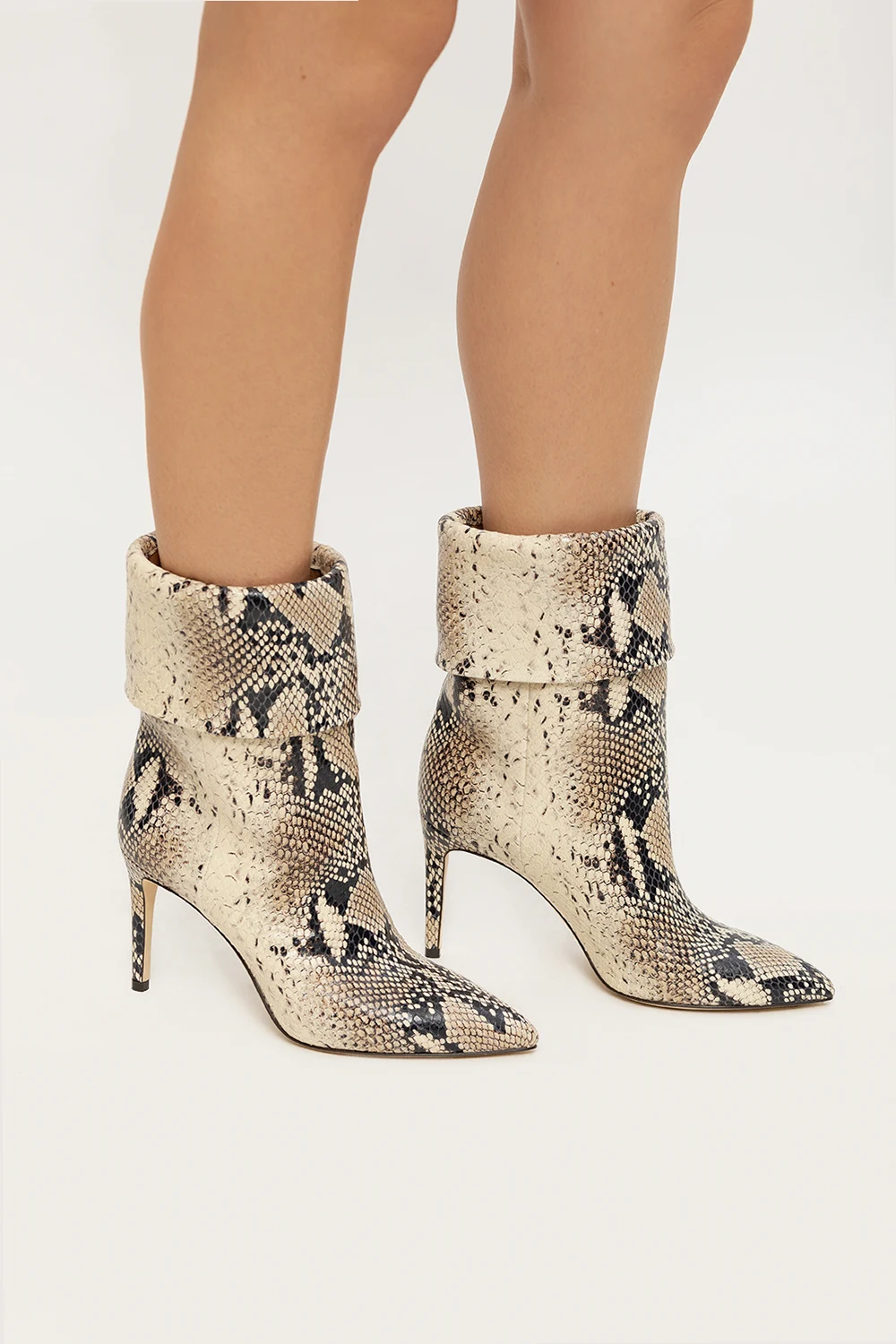 Kremowo-czarne, wsuwane botki na obcasie, model ‘Reverse’ Paris Texas. Wykonane ze skóry imitującej skórę pytona. Nosek w szpic. Jasnobeżowa, skórzana podeszwa.