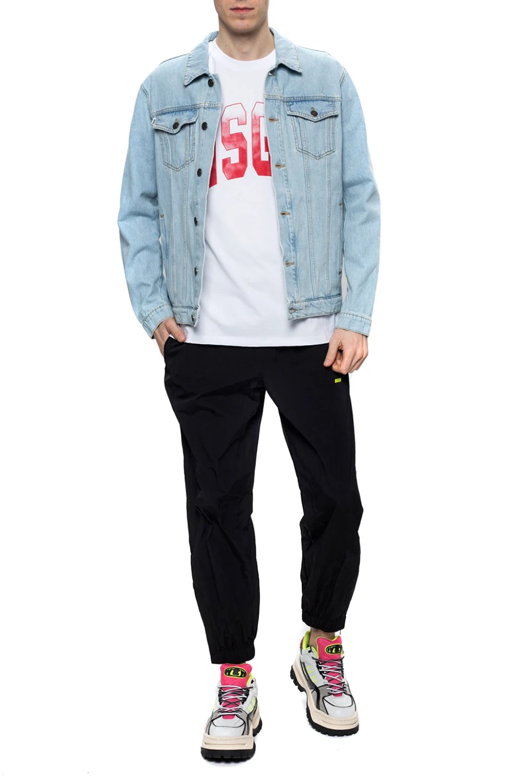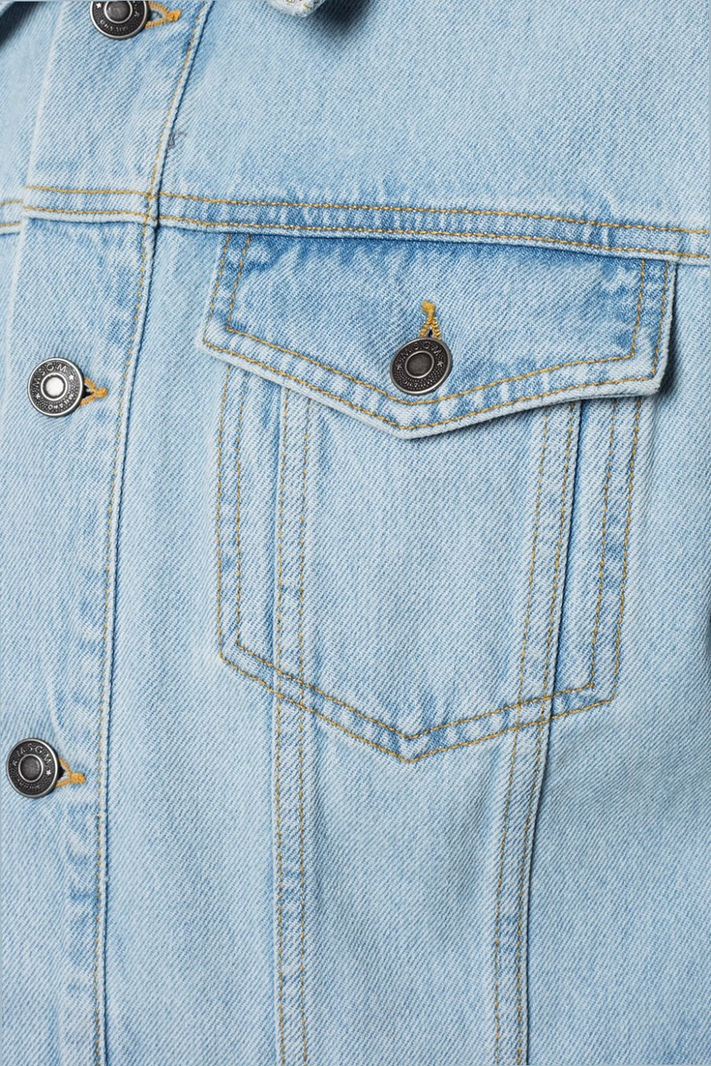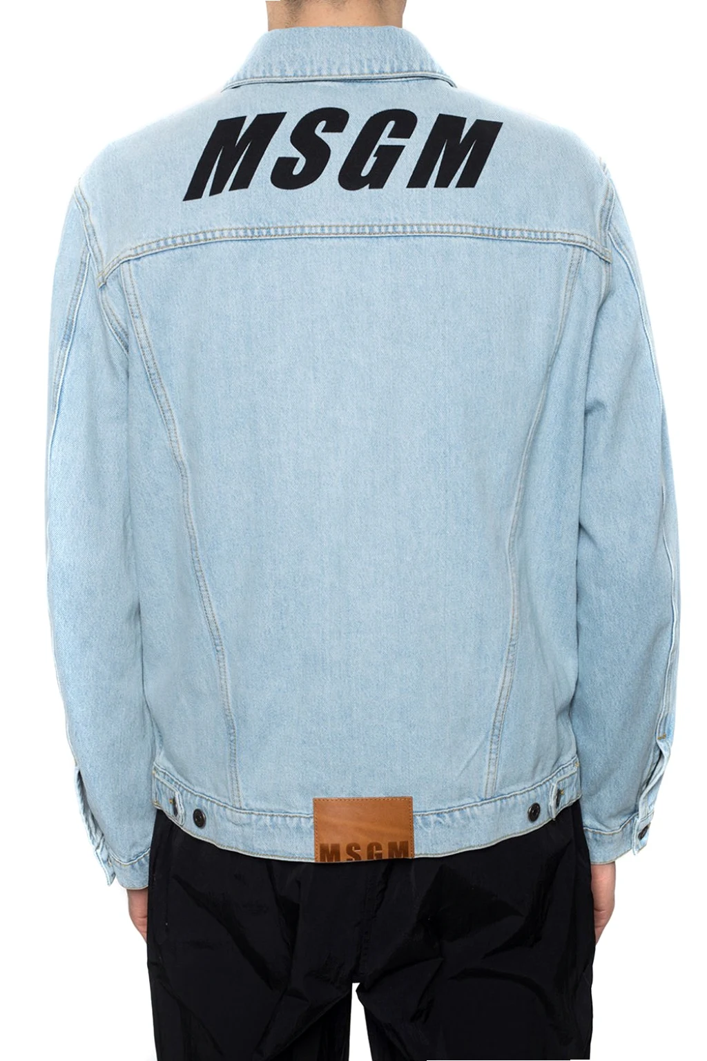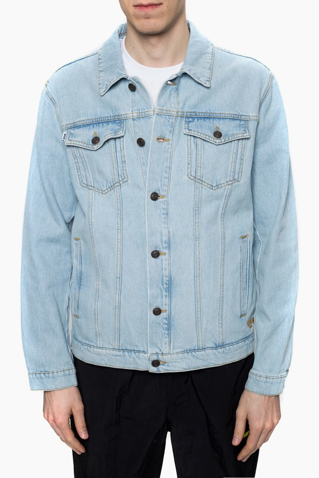 Jasnoniebieska, jeansowa kurtka MSGM. Zapinana na guziki. Cztery kieszenie – dwie wsuwane oraz dwie z patkami zapinane na guziki. Ozdobione wyszytym logo oraz skórzaną naszywką w kolorze brązowym. Rękawy zapinane na guziki.