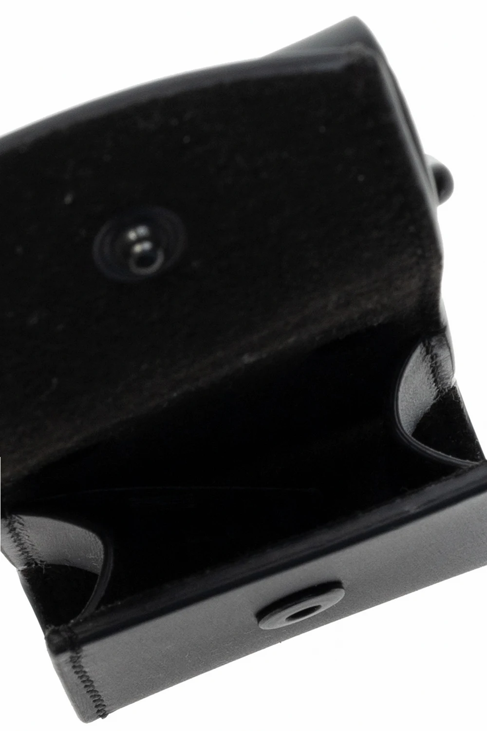 Czarne, skórzane etui na słuchawki AirPods Maison Margiela. Zamykane na zatrzask. Ozdobione wytłoczonym logo. Dołączony karabińczyk. Wewnątrz komora.