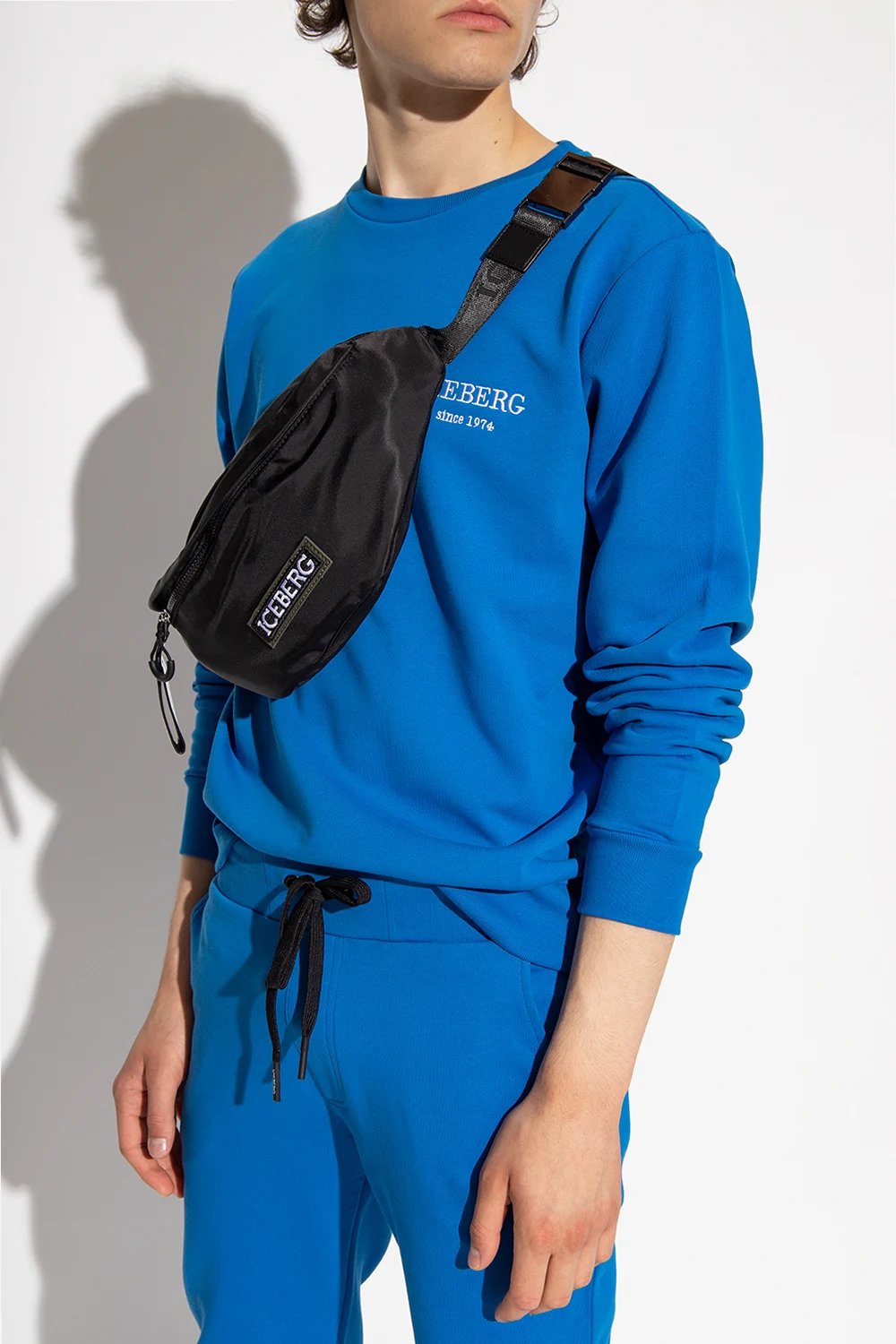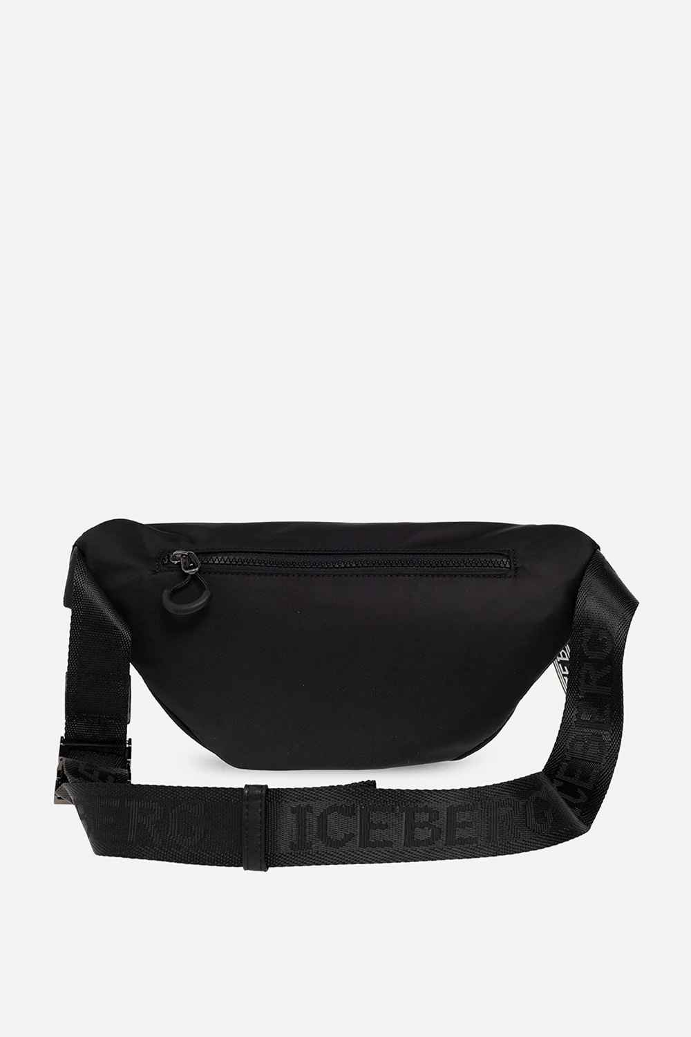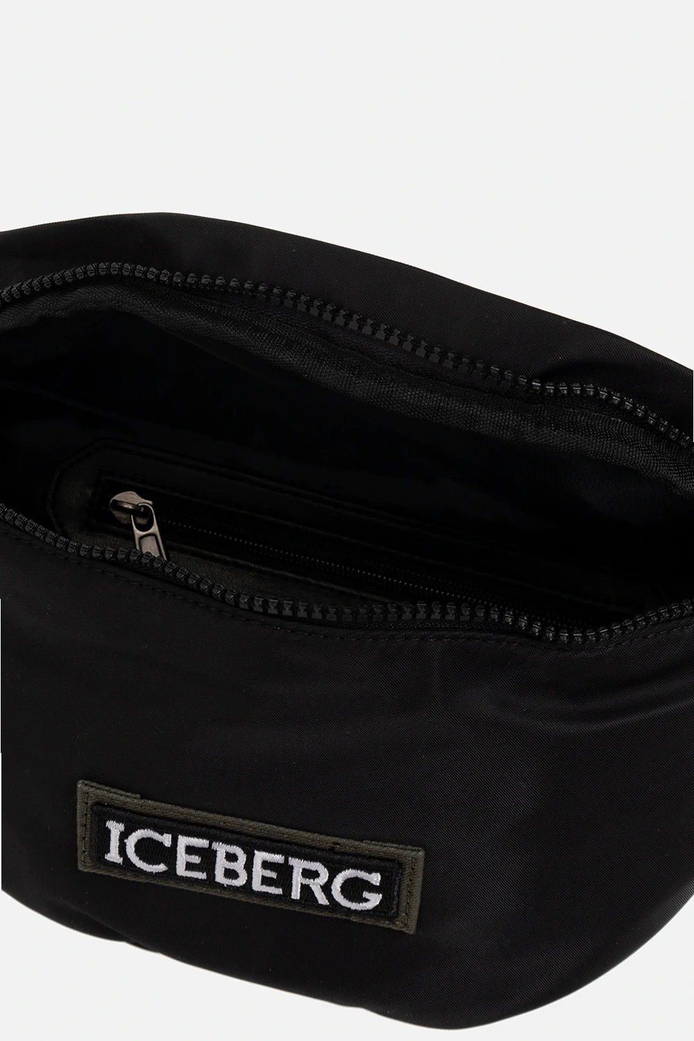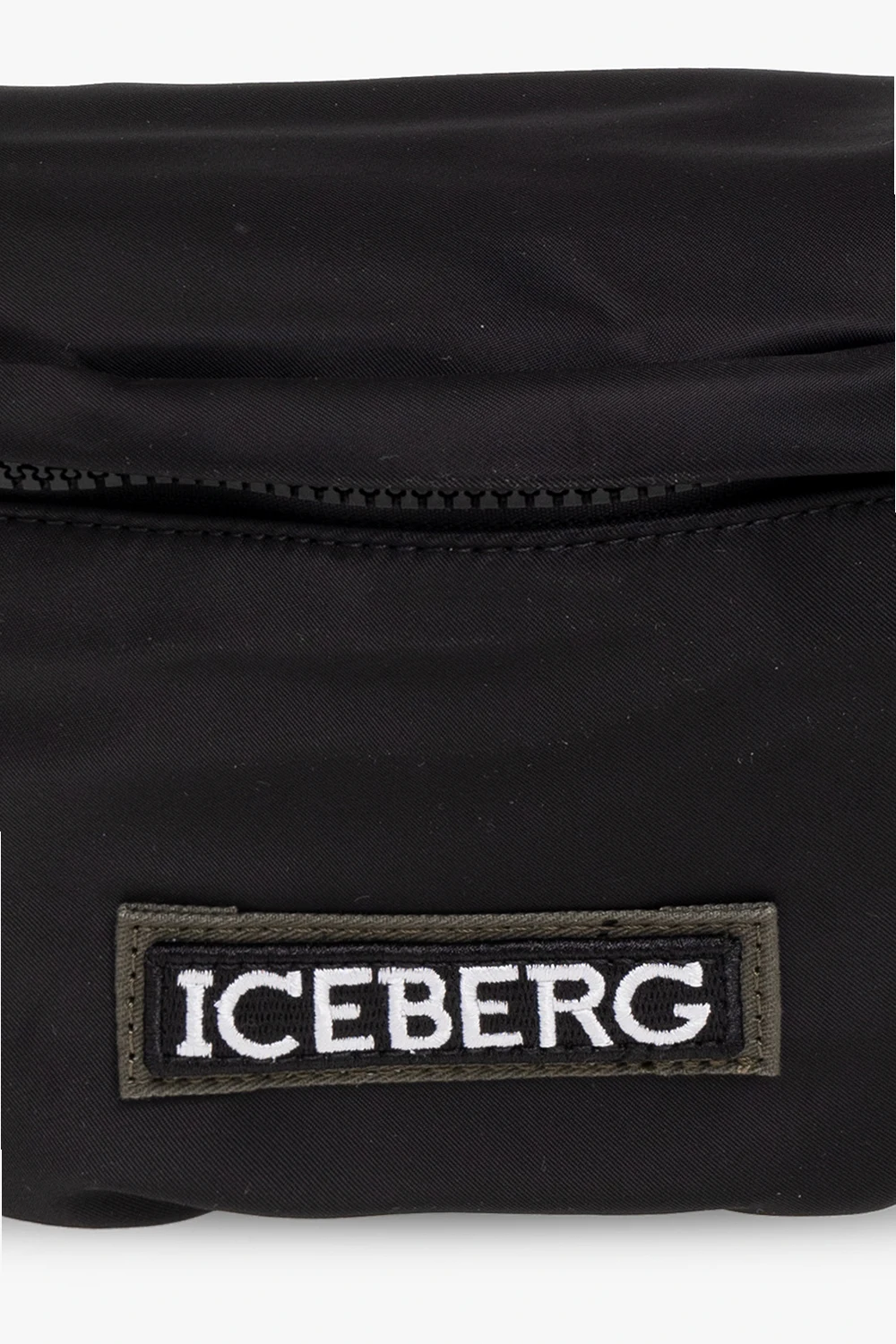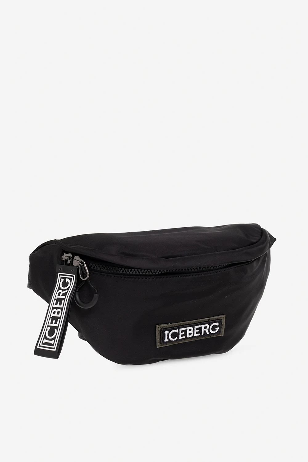 Czarna torba na pas Iceberg. Zamykana na zamek. Ozdobiona naszywką z logo w kolorze zielono-czarno-białym. Z tyłu kieszeń zamykana na zamek. Pas biodrowy z możliwością regulacji długości. Wewnątrz komora oraz kieszeń zamykana na zamek. Metalowe wykończenie w kolorze czarnym.
