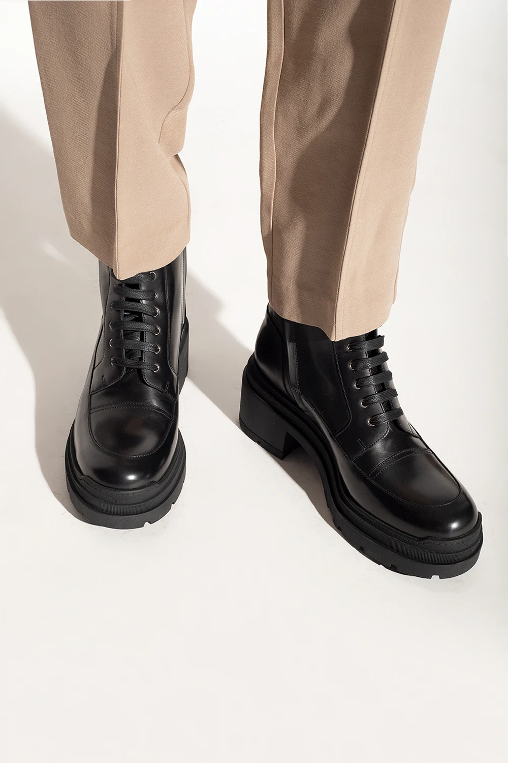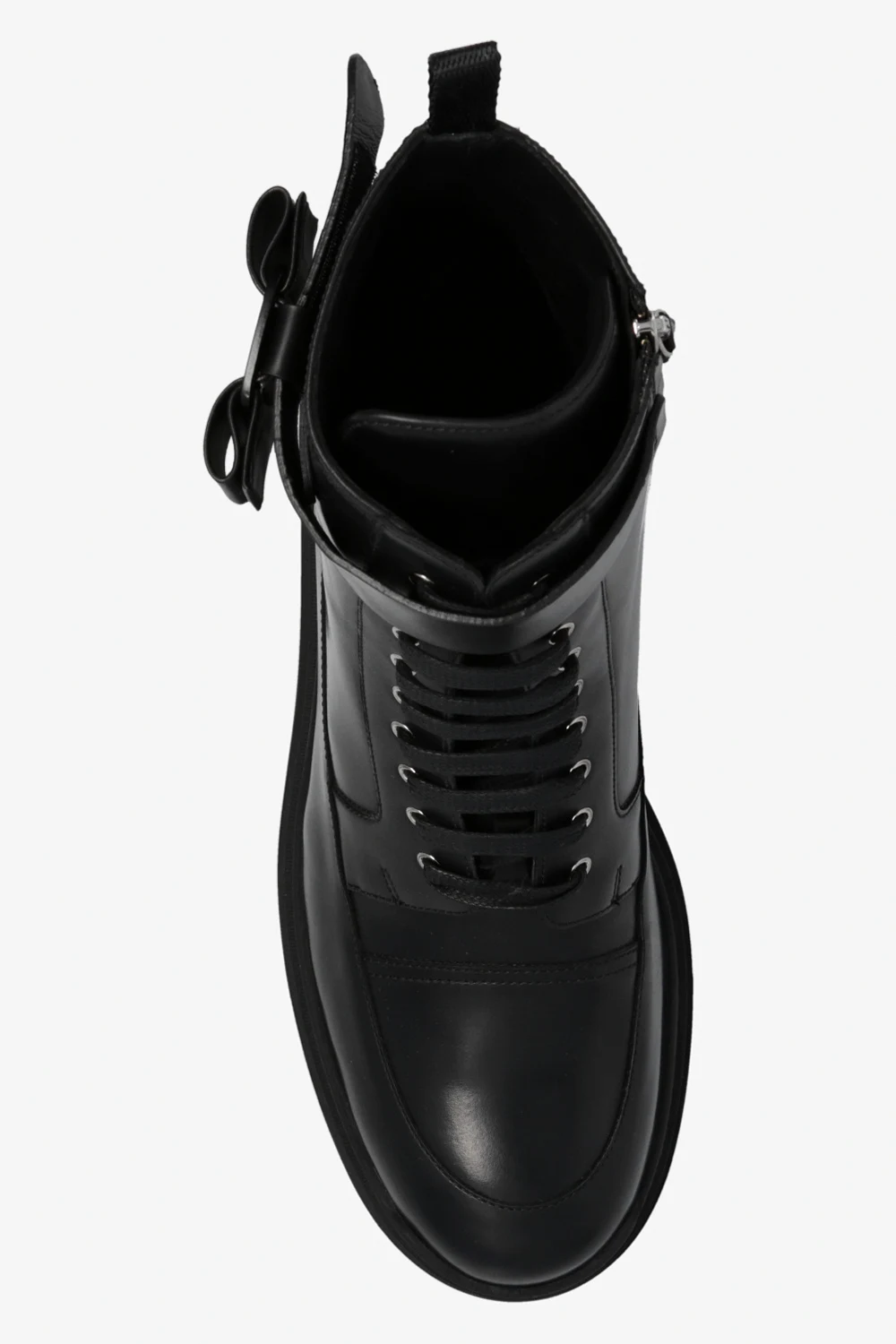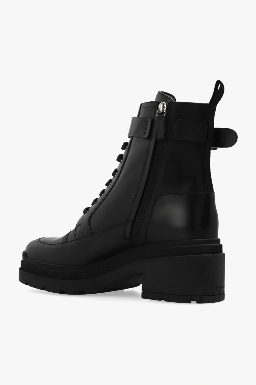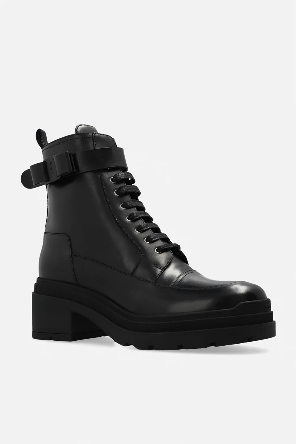 Czarne, sznurowane botki na obcasie, model ‘Lober’ Salvatore Ferragamo. Wykonane z cielęcej skóry. Z boku zapinane na zamek i rzep z charakterystyczną kokardą z logo. Czarna, gumowa podeszwa.