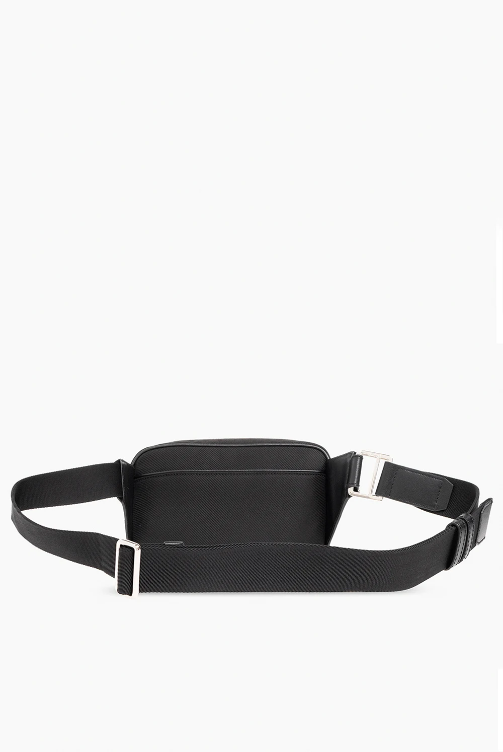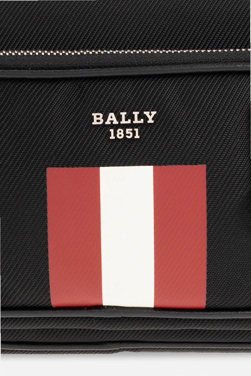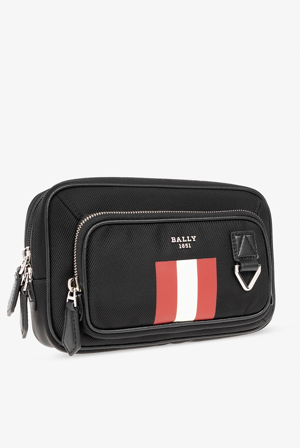 Czarna torba na pas, model ‘Zughorn’ Bally. Zamykana na dwubiegunowy zamek. Z przodu kieszeń zamykana na zamek. Ozdobiona nadrukowanym, charakterystycznym paskiem w kolorze czerwono-biało-czerwonym i metalową aplikacją. Z tyłu wsuwana kieszeń. Pas na pas z możliwością regulacji długości. Wewnątrz komora, wsuwana kieszeń i zamykana na zamek. Metalowe elementy w kolorze srebrnym.
