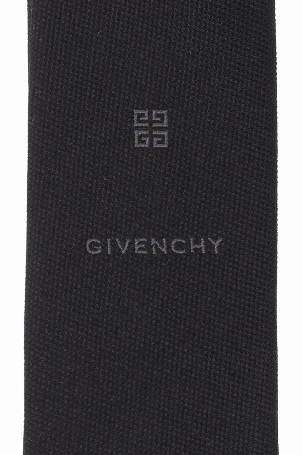Czarny krawat Givenchy. Wykonany z jedwabiu. Ozdobiony wyszytym wzorem z logo w kolorze szarym.
