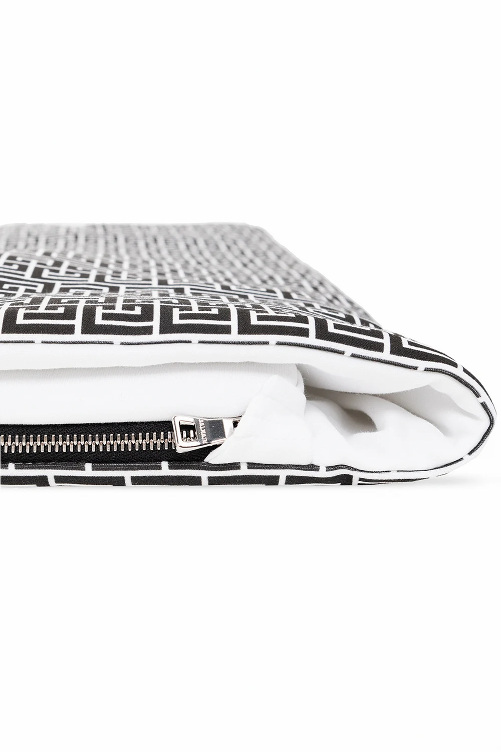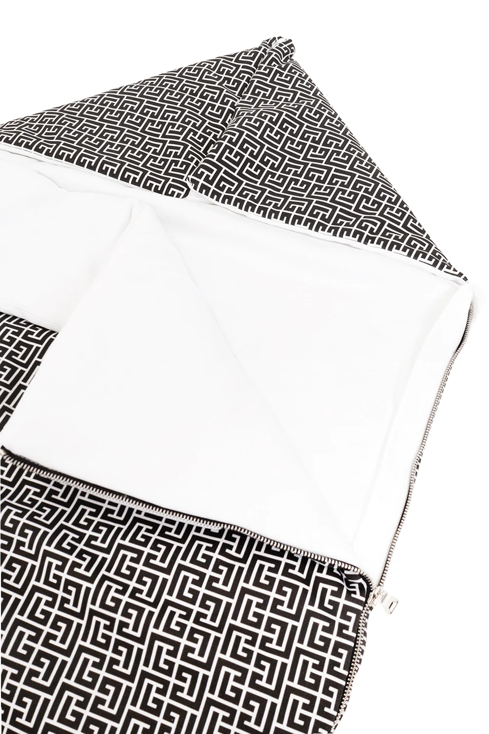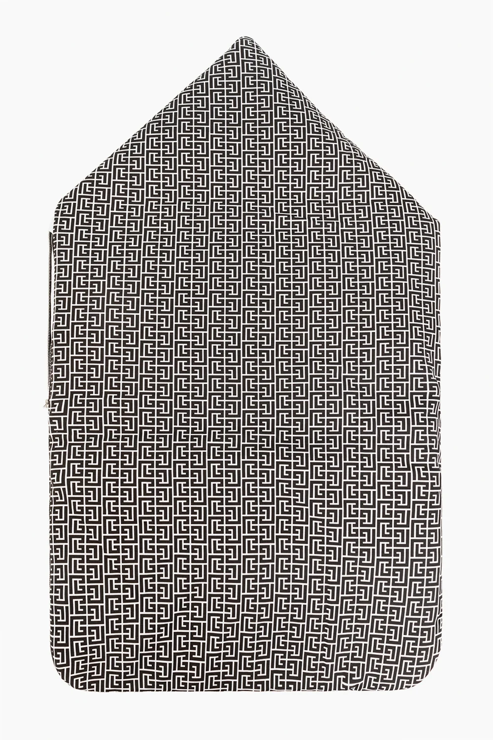 Czarno-biały śpiwór niemowlęcy Balmain Kids. Bok i dół zapinany na zamek. Góra z możliwością spięcia zatrzaskami. Ozdobiony nadrukowanym wzorem z monogramem.
