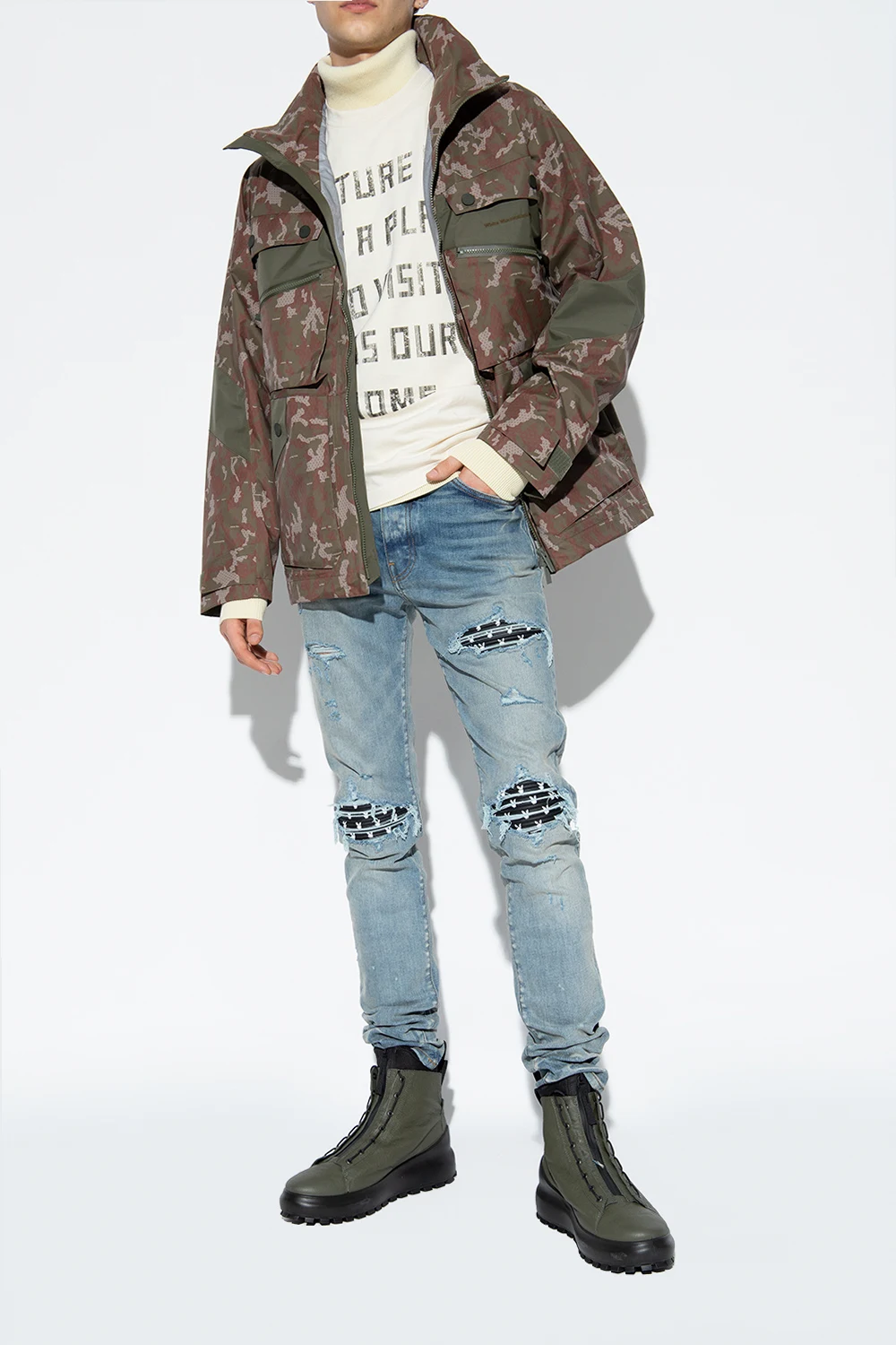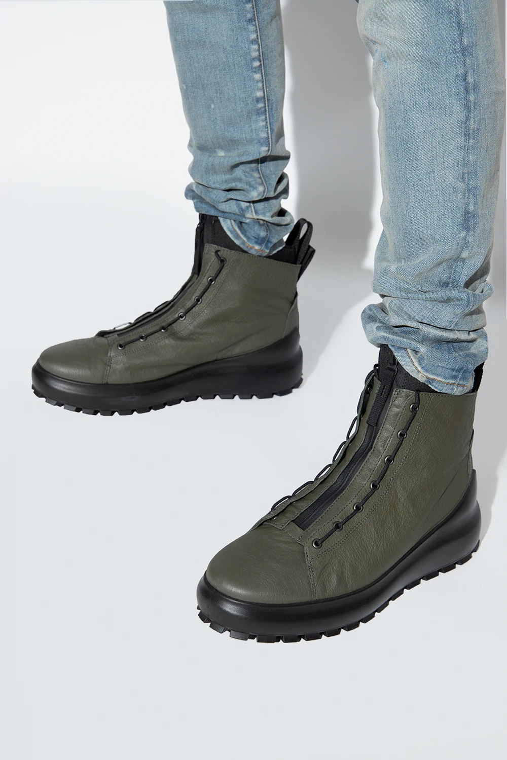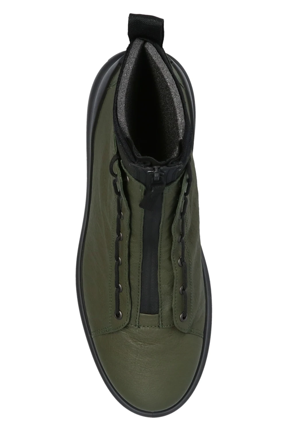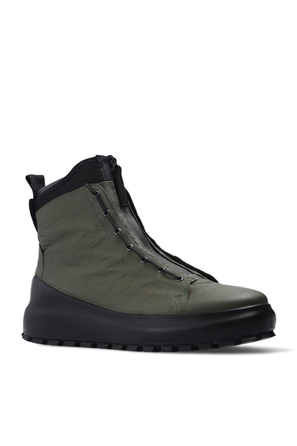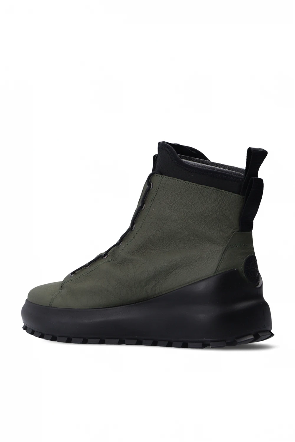 Ciemnozielone botki Stone Island. Wykonane ze skóry. Zapinane na zamek oraz sznurowane. Z tyłu podwójny rypsowy pasek oraz gumowa aplikacja z logo. Czarna, gumowa podeszwa.