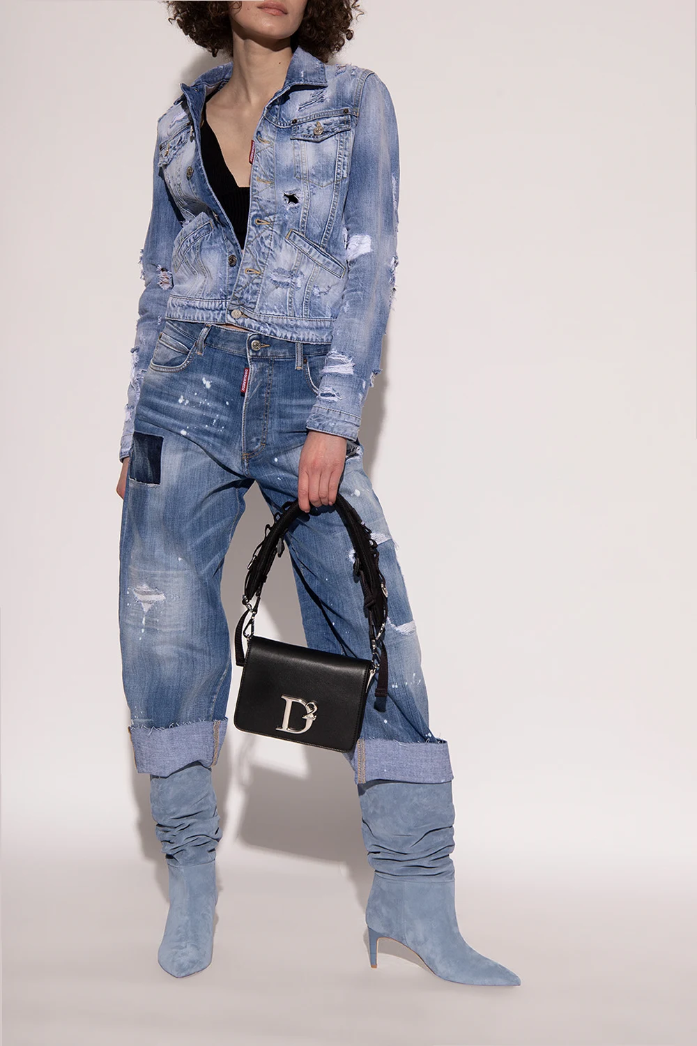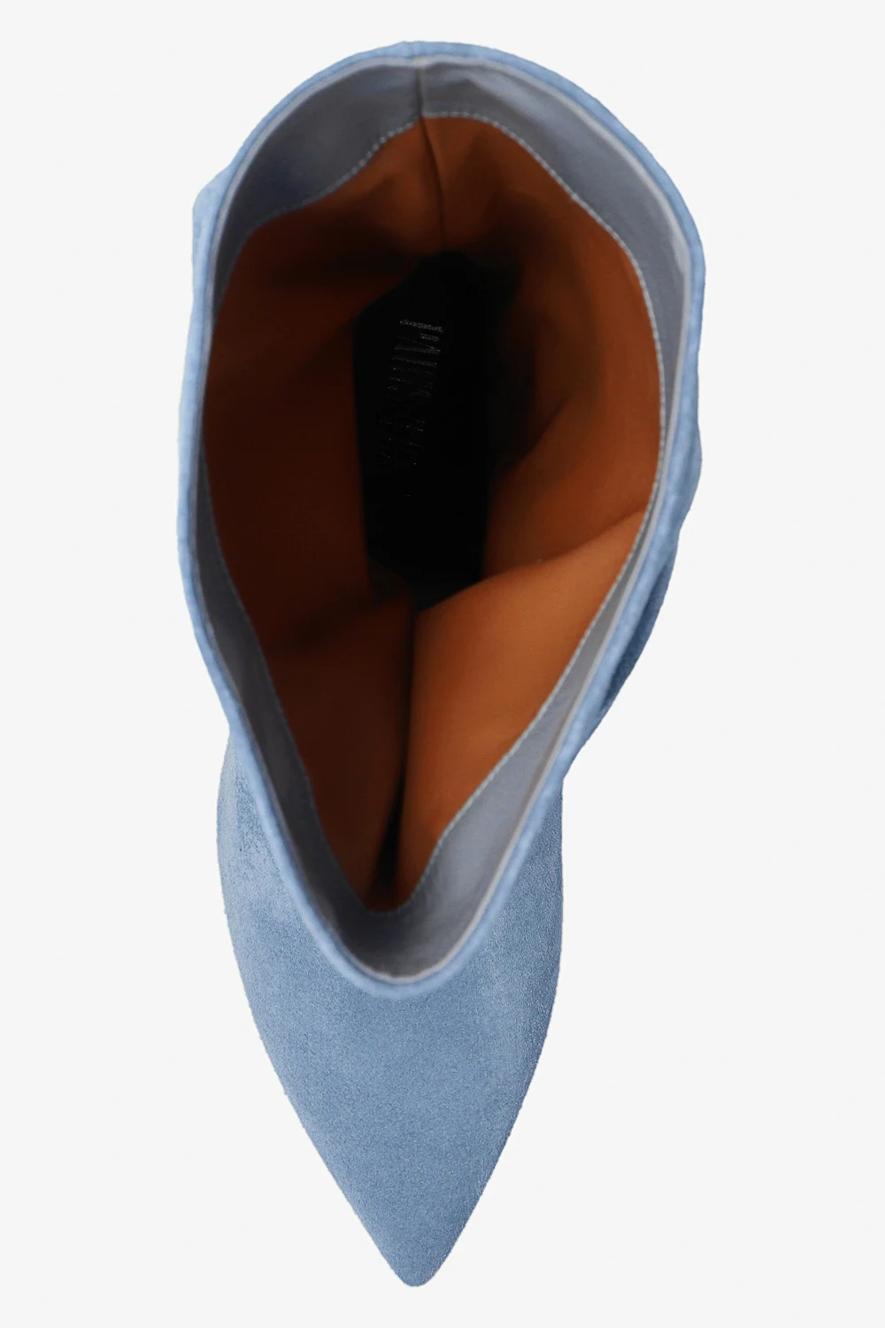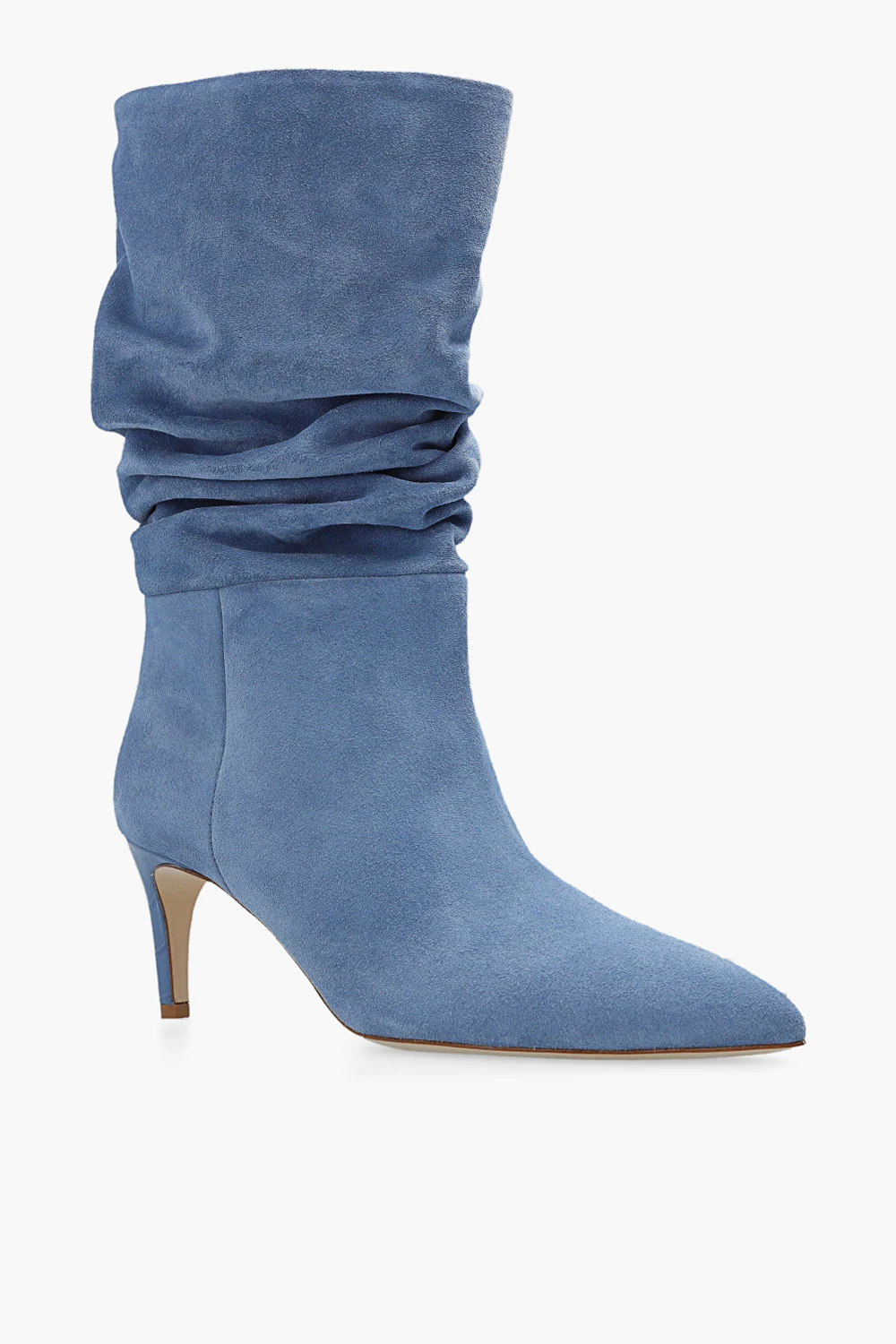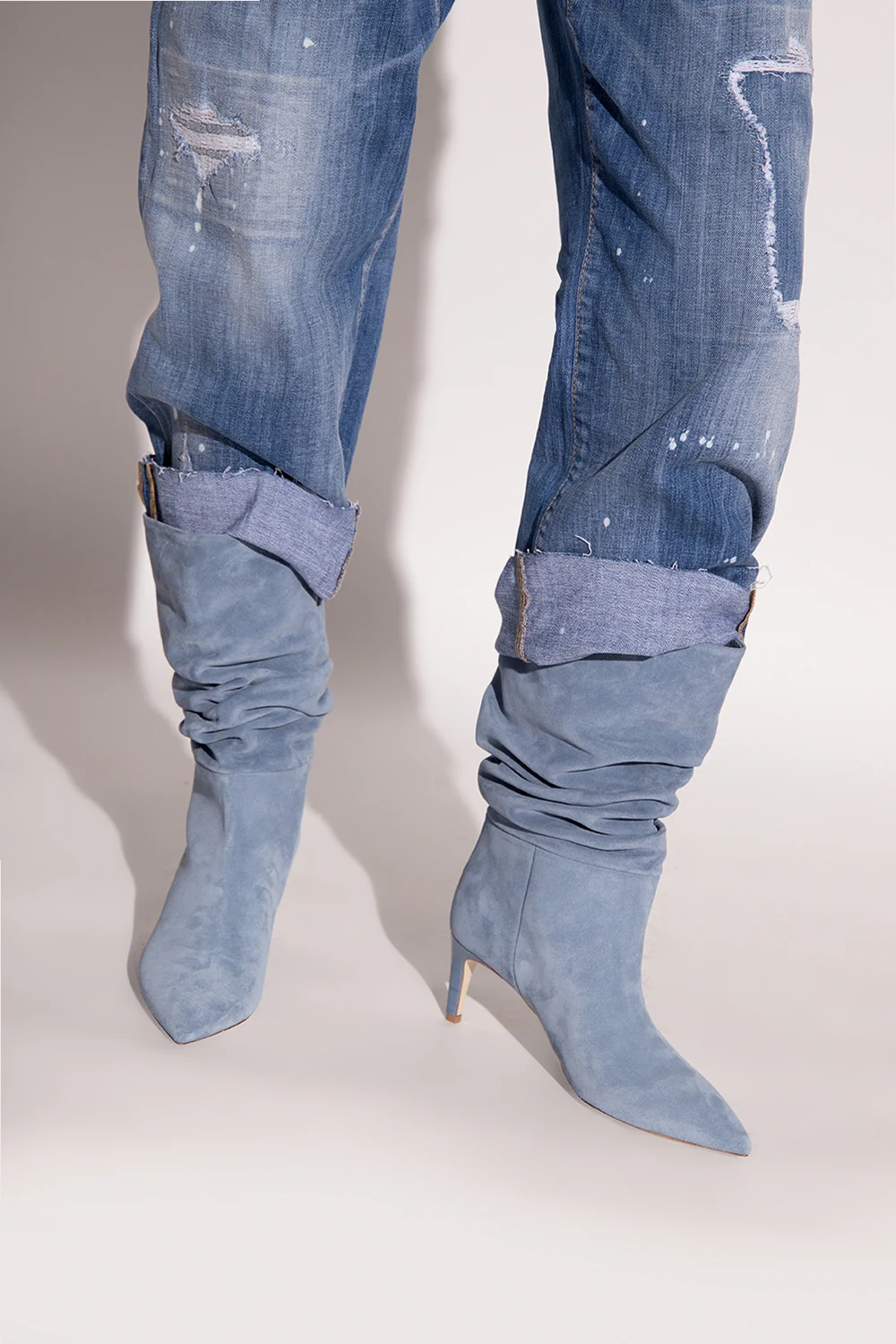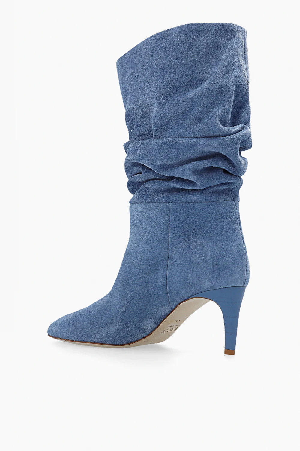 Jasnoniebieskie, wsuwane botki na obcasie Paris Texas. Wykonane z zamszu. Dekoracyjnie marszczona cholewka. Zwężany nosek. Obcas pokryty skórą o specjalnej fakturze imitującej skórę krokodyla. Kremowa, skórzana podeszwa.