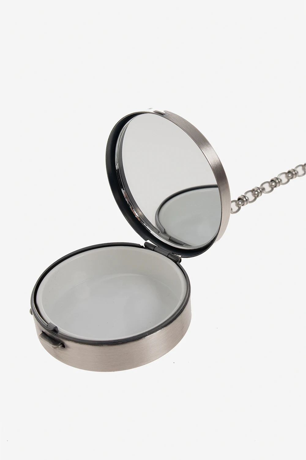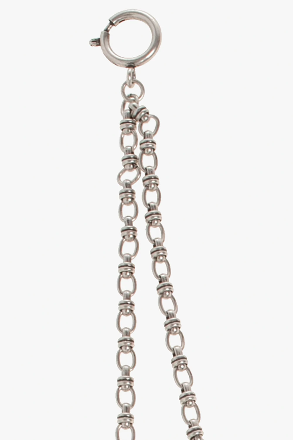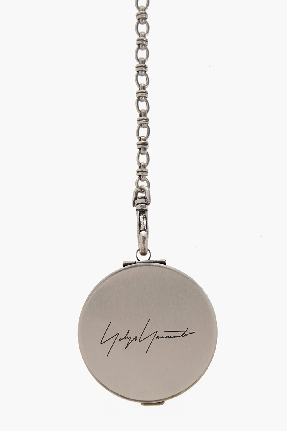 Łańcuch do spodni w kolorze srebrnym Yohji Yamamoto. Wykonany z mosiądzu. Dołączona otwierana szkatułka z lusterkiem wewnątrz. Ozdobiona wygrawerowanym logo. Zapięcie na karabińczyki.