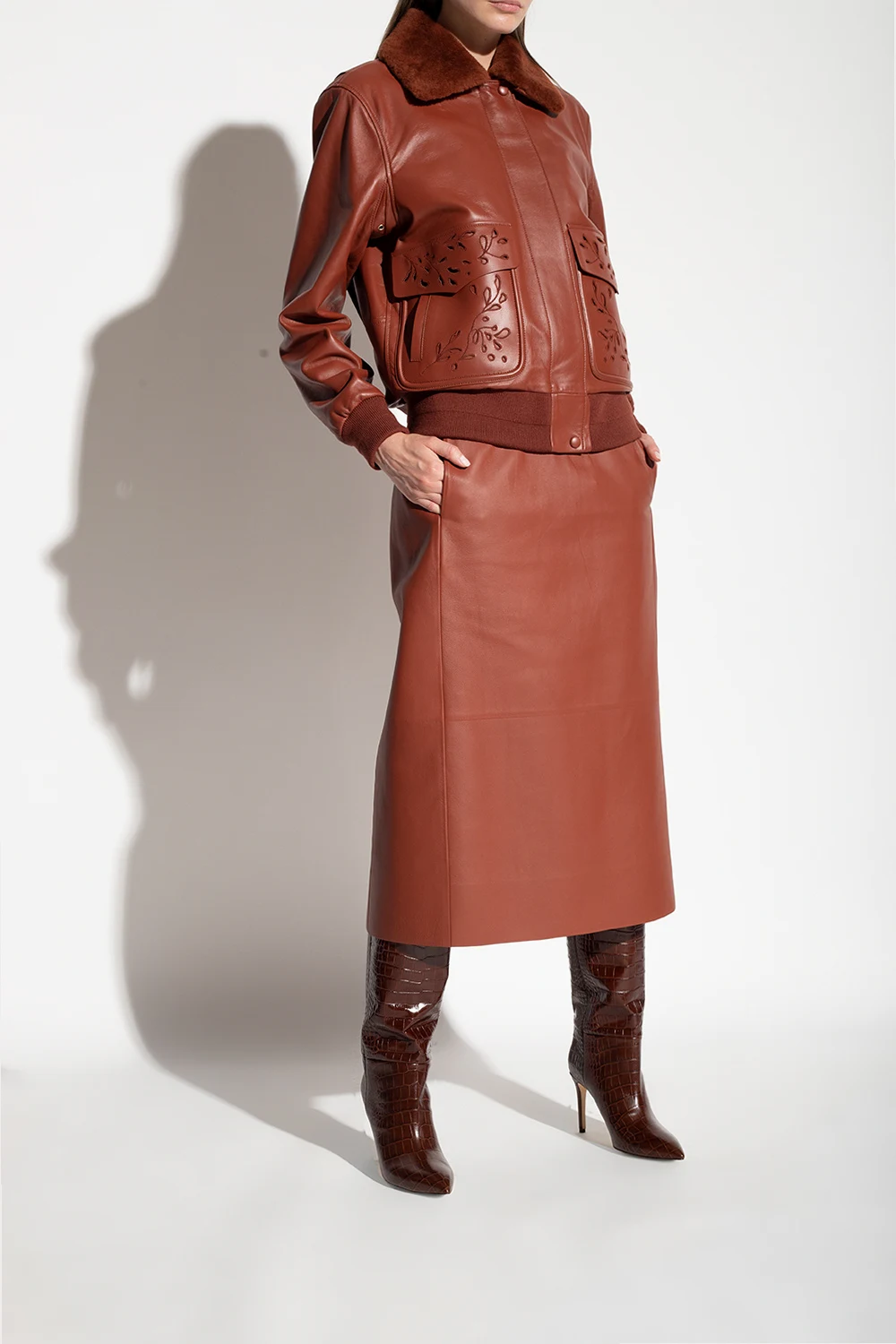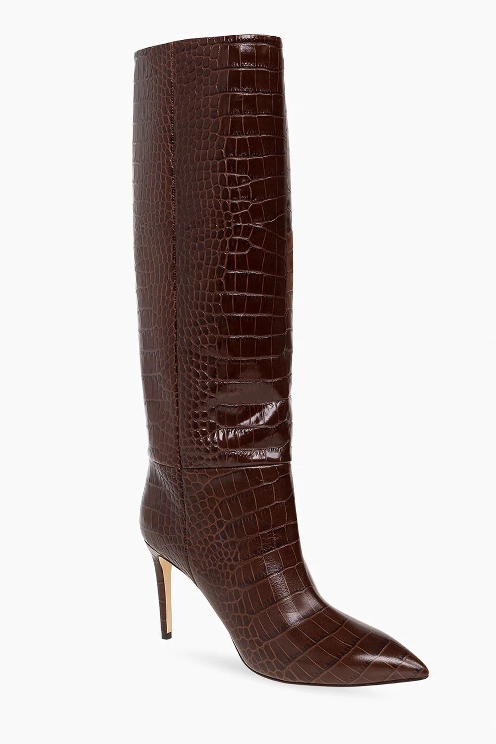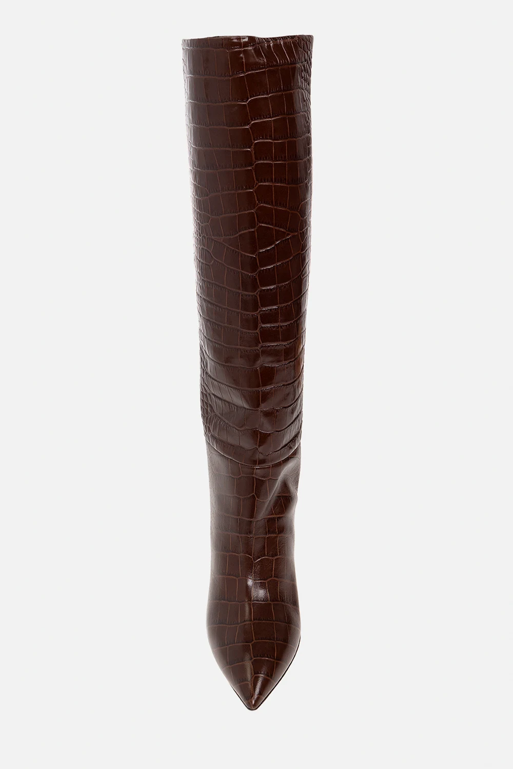 Brązowe, wsuwane kozaki na obcasie Paris Texas. Wykonane ze skóry cielęcej o specjalnej fakturze imitującej skórę krokodyla. Zwężany nosek. Kremowa, skórzana podeszwa.