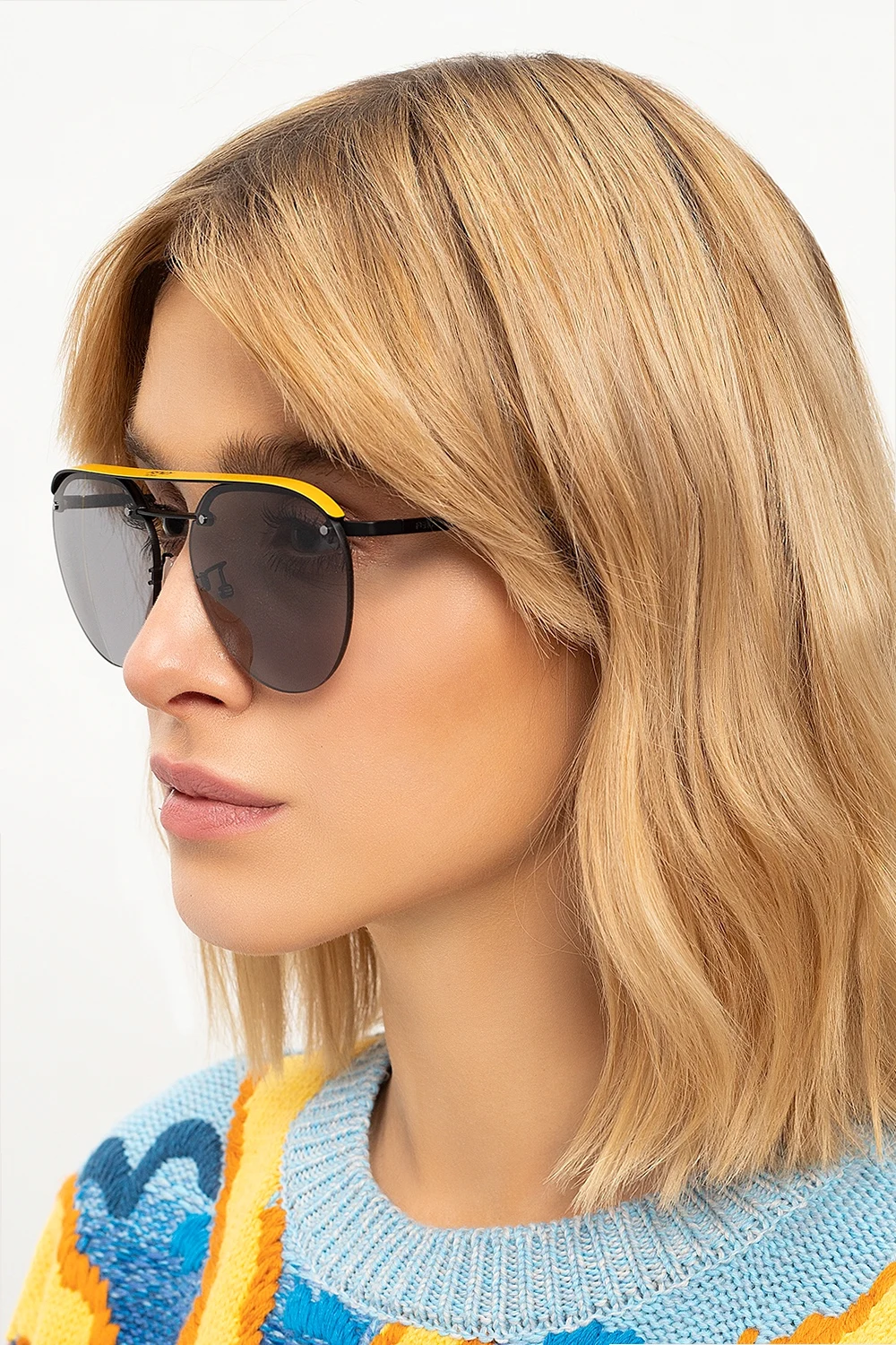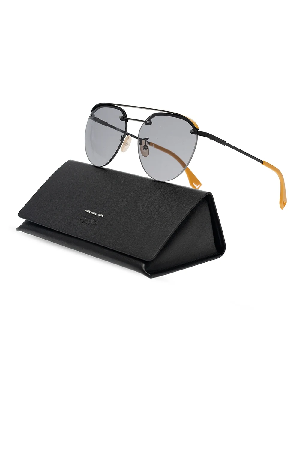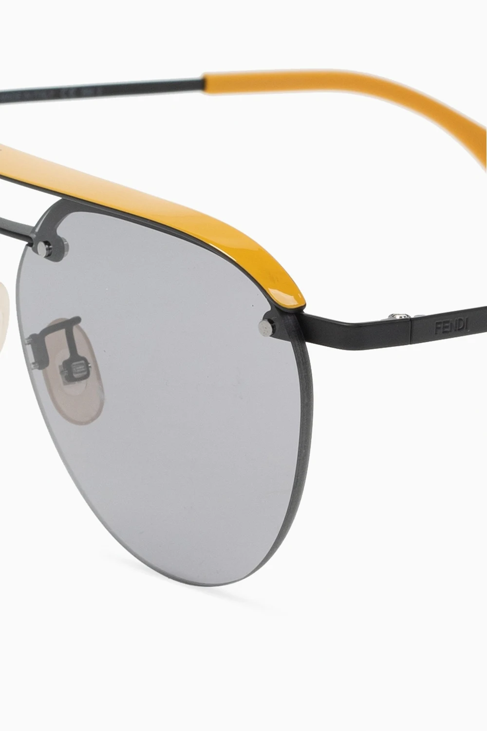 Czarno-żółte okulary przeciwsłoneczne Fendi. Mostek z nadrukowanym logo. Szare, certyfikowane soczewki 100% UVA i UVB ze wzorem w paski.